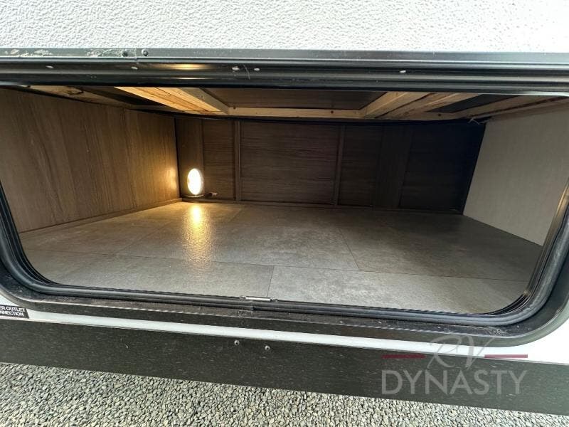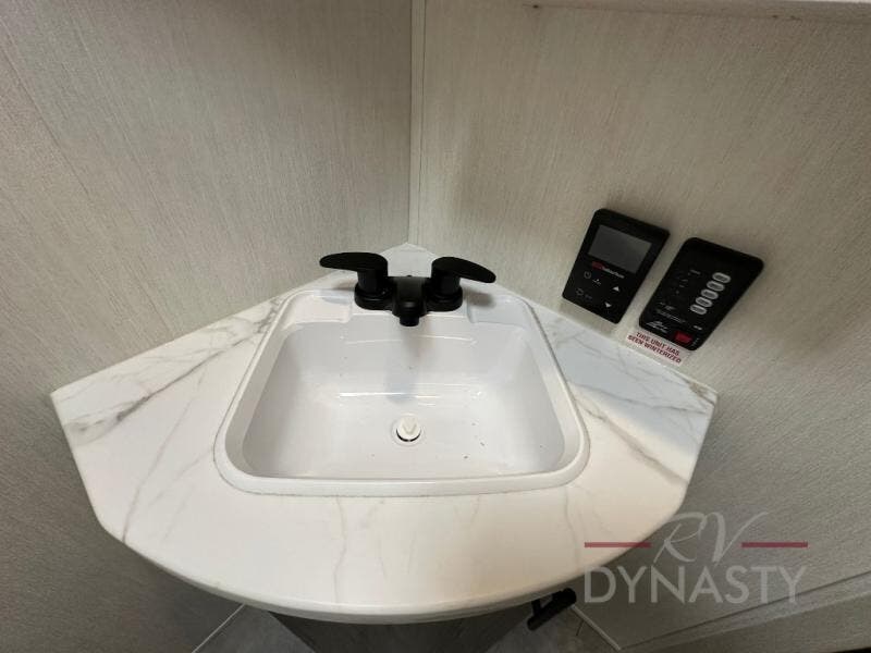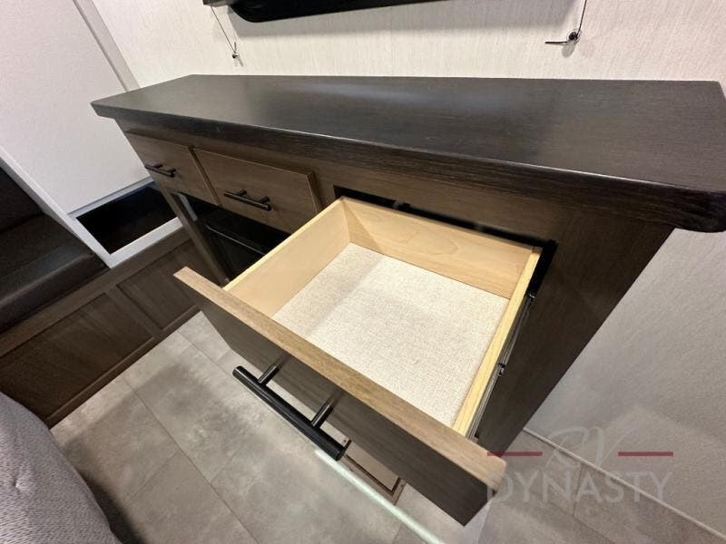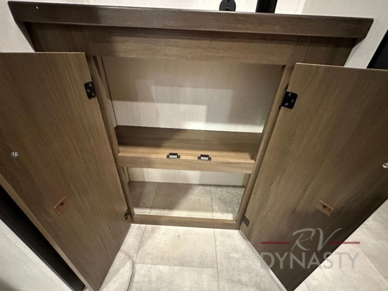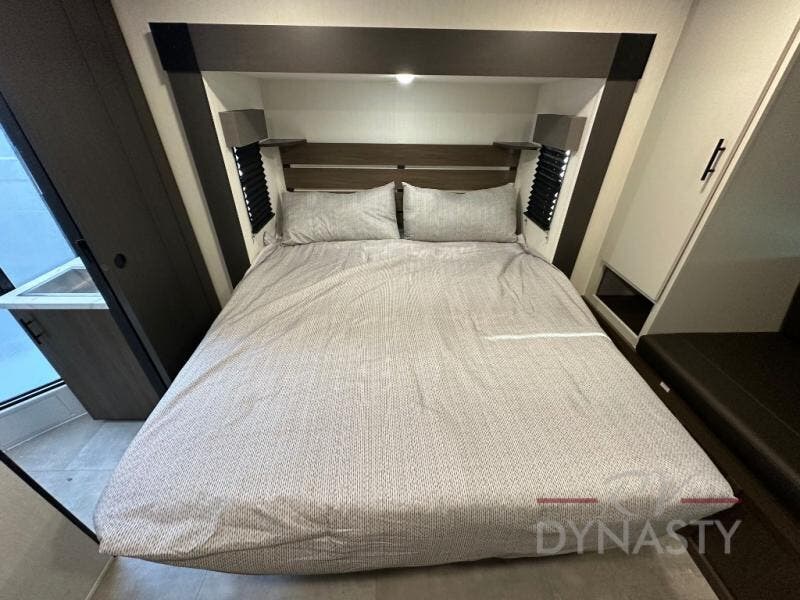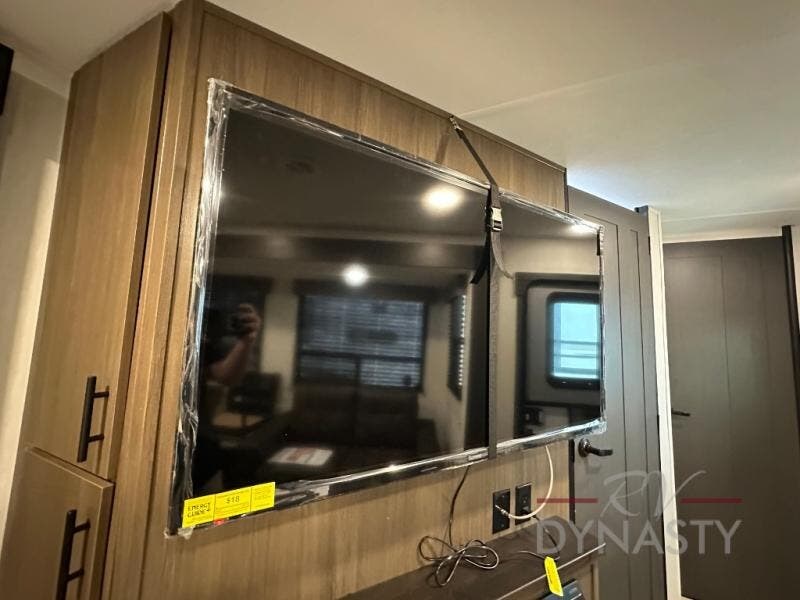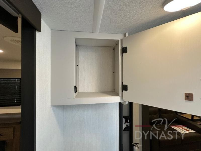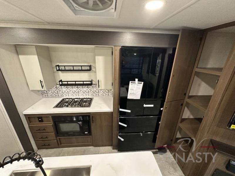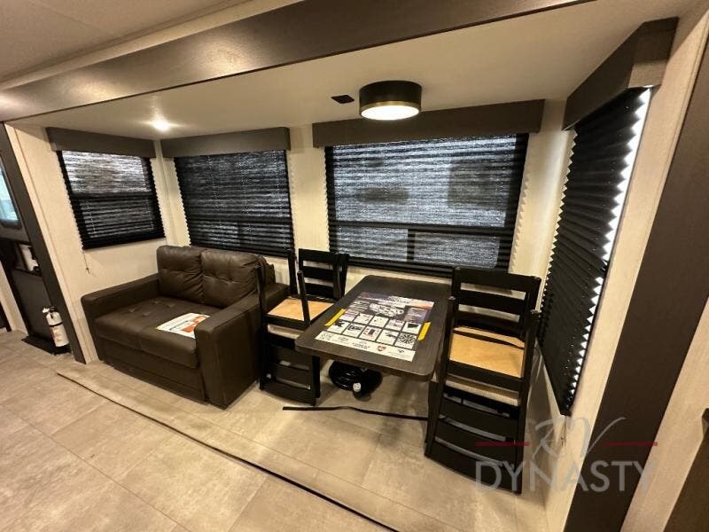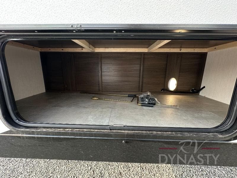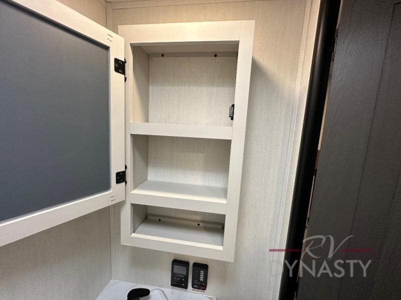 Privacy abounds in this travel trailer with a bedroom at each end! A king bed slide in the front has its own fireplace for cozy nights. Dual wardrobes frame the reading bench which looks out the front window for peaceful moments appreciating the view. At the rear, a second bedroom with queen bed has its own half bath. A pantry closet here also has prep for an optional washer/dryer for convenience on the road. In the center everyone can meet up in the spacious kitchen/living room. A hide-a-bed sofa has even more sleeping space, or relax there and watch the TV which is in the entertainment center along with another fireplace. The kitchen is well-equipped with a three-burner cooktop, microwave, and even an island where the sink is located for easy meal prep. Outside there are not one but two 10' power awnings for extra protection from the elements!