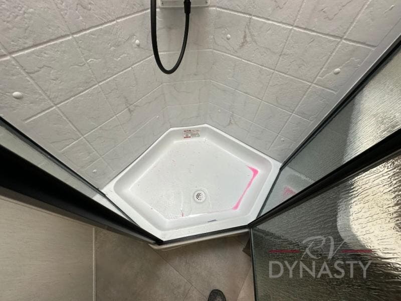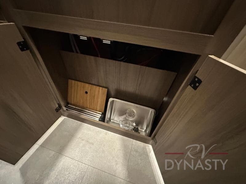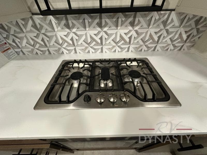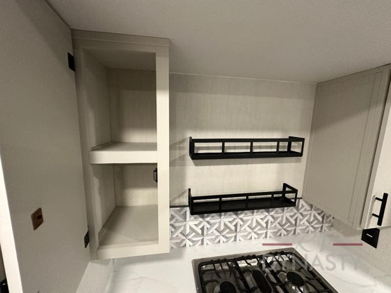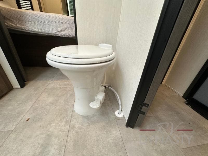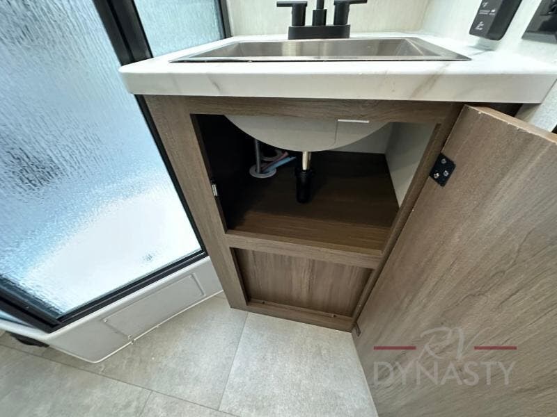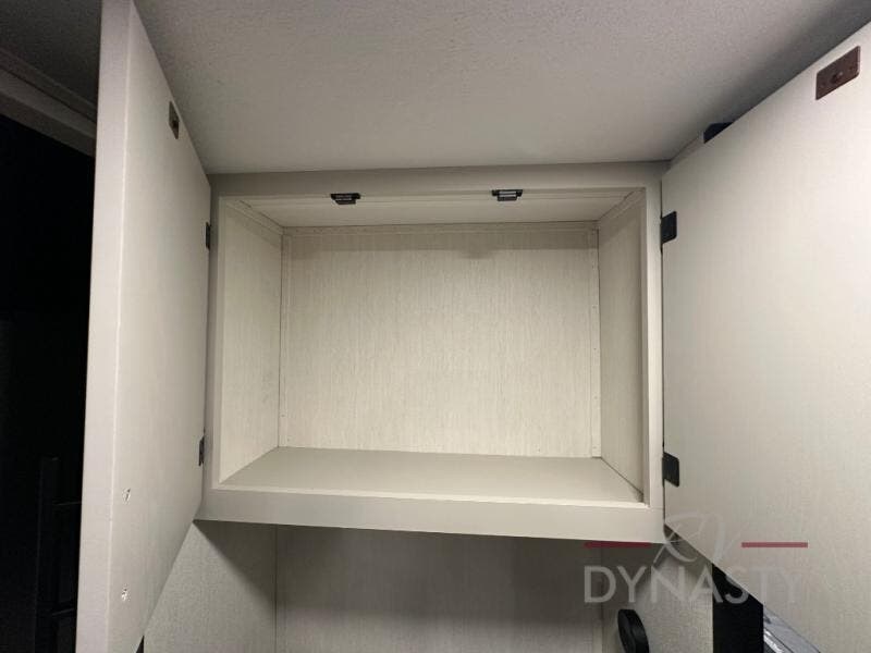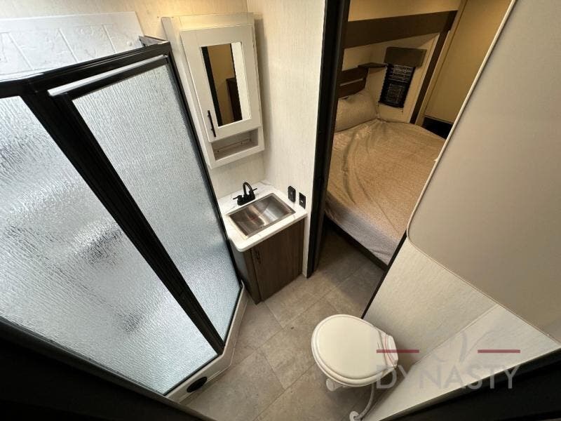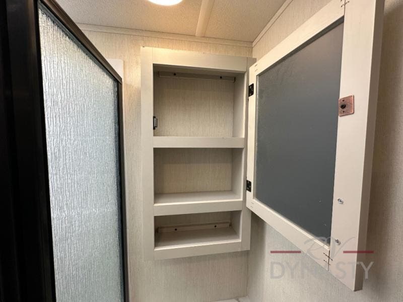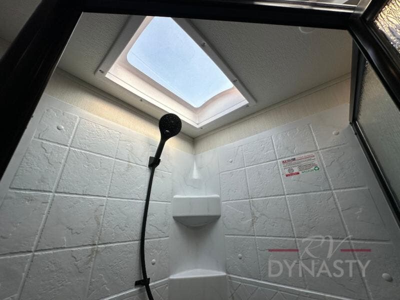 Privacy abounds in this travel trailer with a bedroom at each end! A king bed slide in the front has its own fireplace for cozy nights. Dual wardrobes frame the reading bench which looks out the front window for peaceful moments appreciating the view. At the rear, a second bedroom with queen bed has its own half bath. A pantry closet here also has prep for an optional washer/dryer for convenience on the road. In the center everyone can meet up in the spacious kitchen/living room. A hide-a-bed sofa has even more sleeping space, or relax there and watch the TV which is in the entertainment center along with another fireplace. The kitchen is well-equipped with a three-burner cooktop, microwave, and even an island where the sink is located for easy meal prep. Outside there are not one but two 10' power awnings for extra protection from the elements!