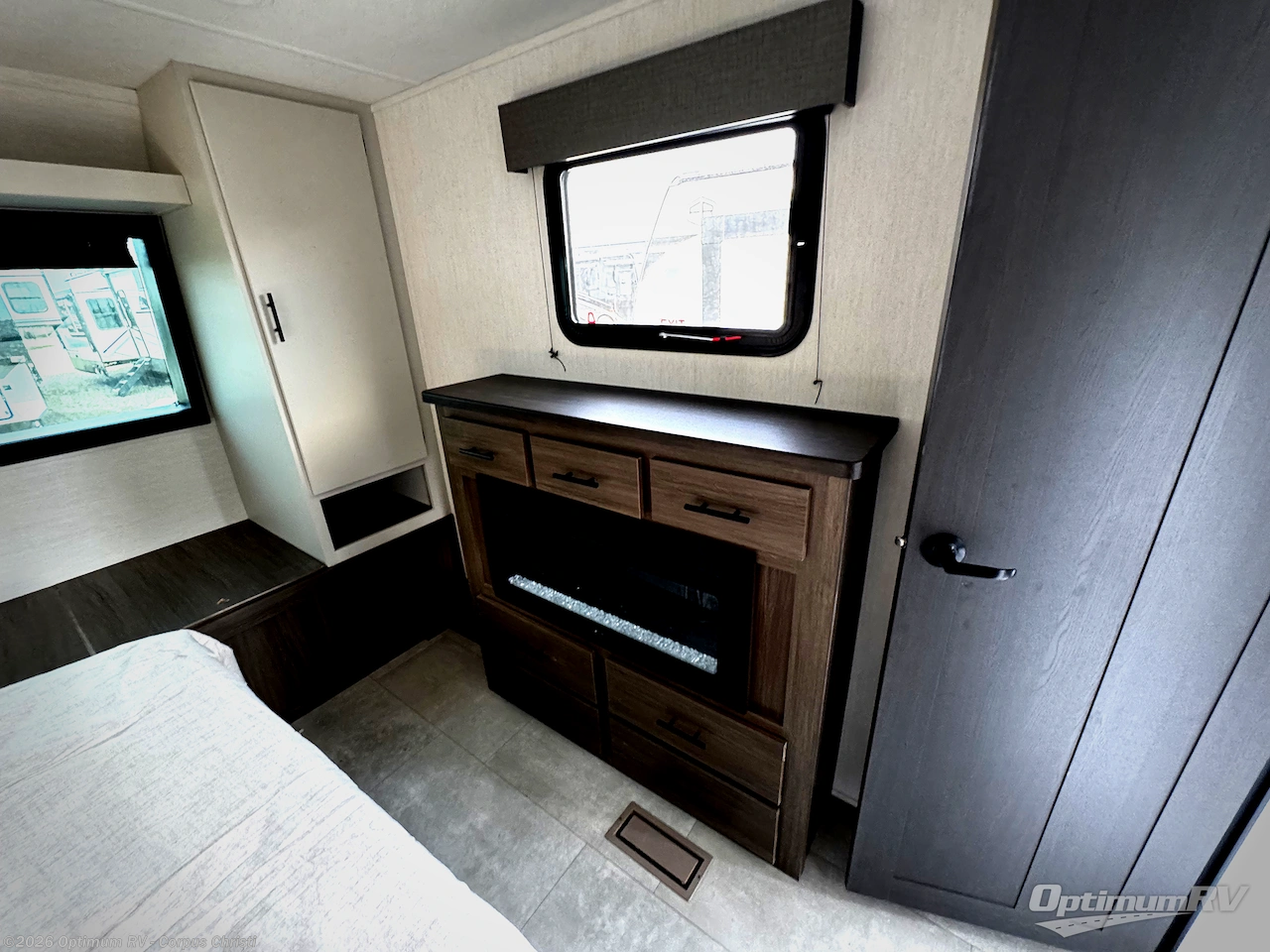 Privacy abounds in this travel trailer with a bedroom at each end! A king bed slide in the front has its own fireplace for cozy nights. Dual wardrobes frame the reading bench which looks out the front window for peaceful moments appreciating the view. At the rear, a second bedroom with queen bed has its own half bath. A pantry closet here also has prep for an optional washer/dryer for convenience on the road. In the center everyone can meet up in the spacious kitchen/living room. A hide-a-bed sofa has even more sleeping space, or relax there and watch the TV which is in the entertainment center along with another fireplace. The kitchen is well-equipped with a three-burner cooktop, microwave, and even an island where the sink is located for easy meal prep. Outside there are not one but two 10' power awnings for extra protection from the elements!