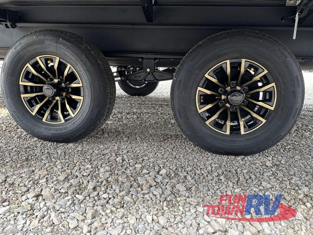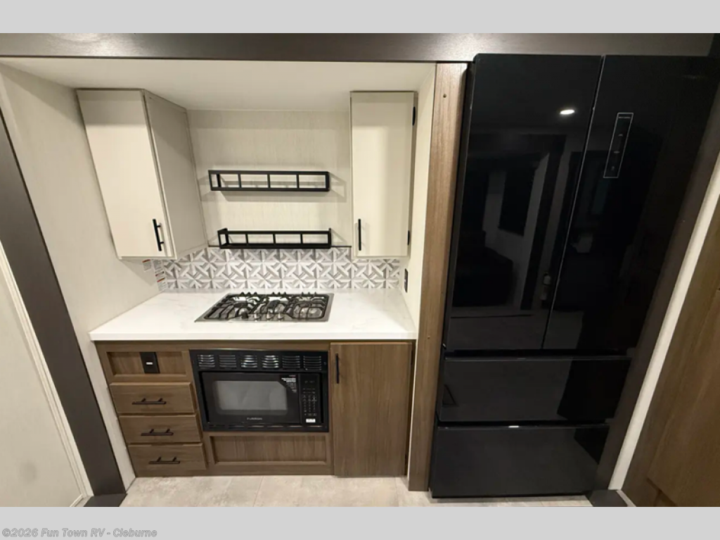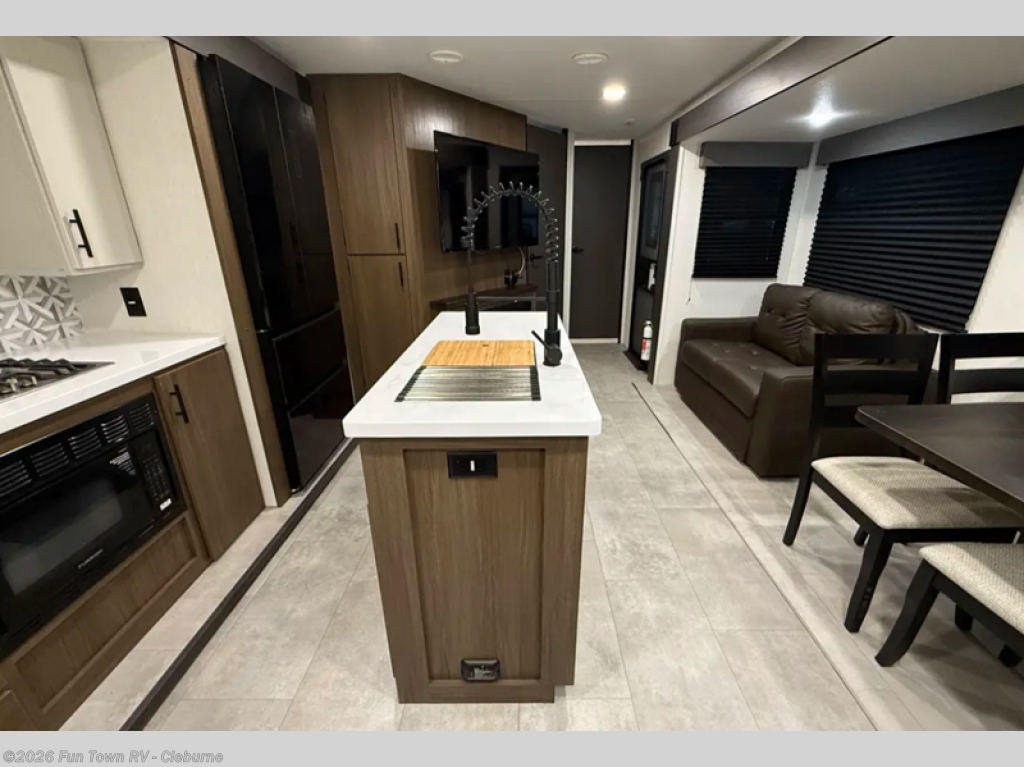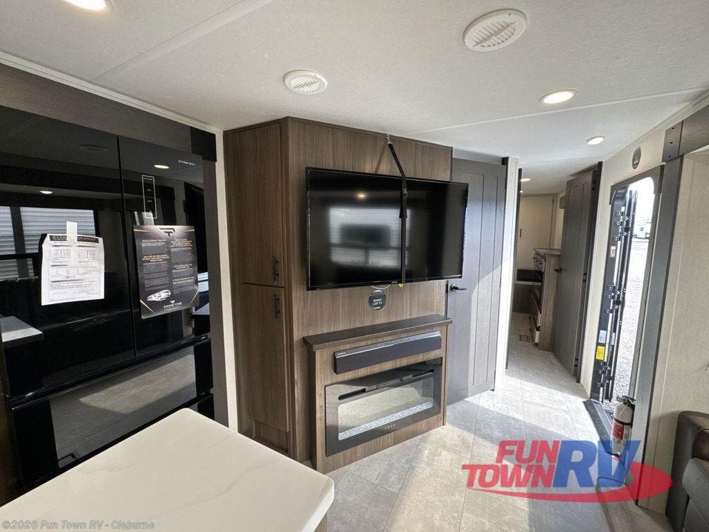 Privacy abounds in this travel trailer with a bedroom at each end! A king bed slide in the front has its own fireplace for cozy nights. Dual wardrobes frame the reading bench which looks out the front window for peaceful moments appreciating the view. At the rear, a second bedroom with queen bed has its own half bath. A pantry closet here also has prep for an optional washer/dryer for convenience on the road. In the center everyone can meet up in the spacious kitchen/living room. A hide-a-bed sofa has even more sleeping space, or relax there and watch the TV which is in the entertainment center along with another fireplace. The kitchen is well-equipped with a three-burner cooktop, microwave, and even an island where the sink is located for easy meal prep. Outside there are not one but two 10' power awnings for extra protection from the elements!