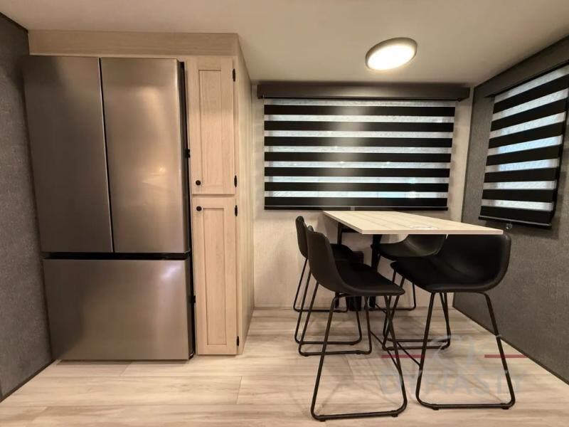 This stunning travel trailer is designed for families and travelers who crave comfort. Two rear bunk beds and a cozy loft above them create a fun and playful sleeping area for kids or guests, perfect for family bonding and sweet dreams. The full bathroom is equipped with everything you need to start your day feeling refreshed and revitalized. In the living area, the entertainment center features a warm fireplace, ideal for chilly evenings and cozy movie nights, while the plush L sofa is the perfect spot to unwind and enjoy quality time with loved ones. The pantry is stocked with storage for your favorite snacks and ingredients, while the fridge keeps everything fresh. There is a well-equipped kitchen with a spacious countertop for added convenience. Plus, the main bedroom is a peaceful sanctuary, featuring a luxurious king bed, spacious wardrobes, a stylish dresser, and the front bathroom is a thoughtful touch, offering privacy for your family or guests.