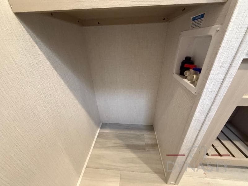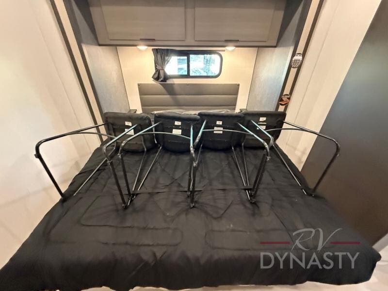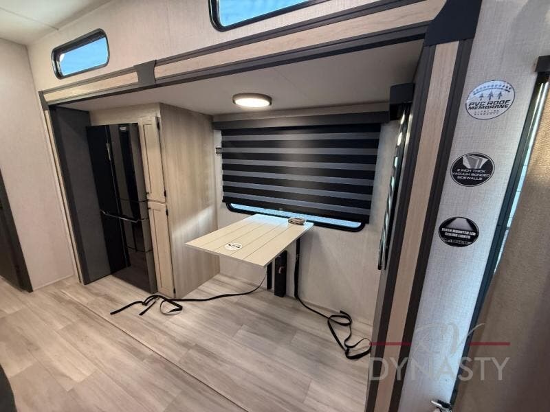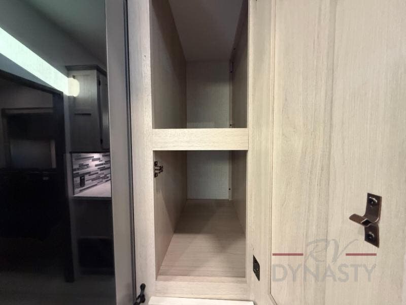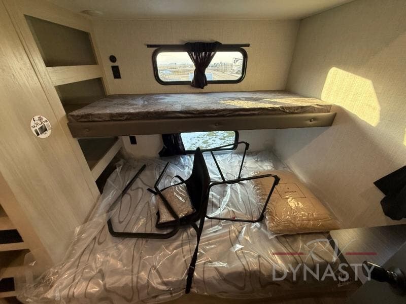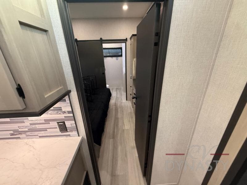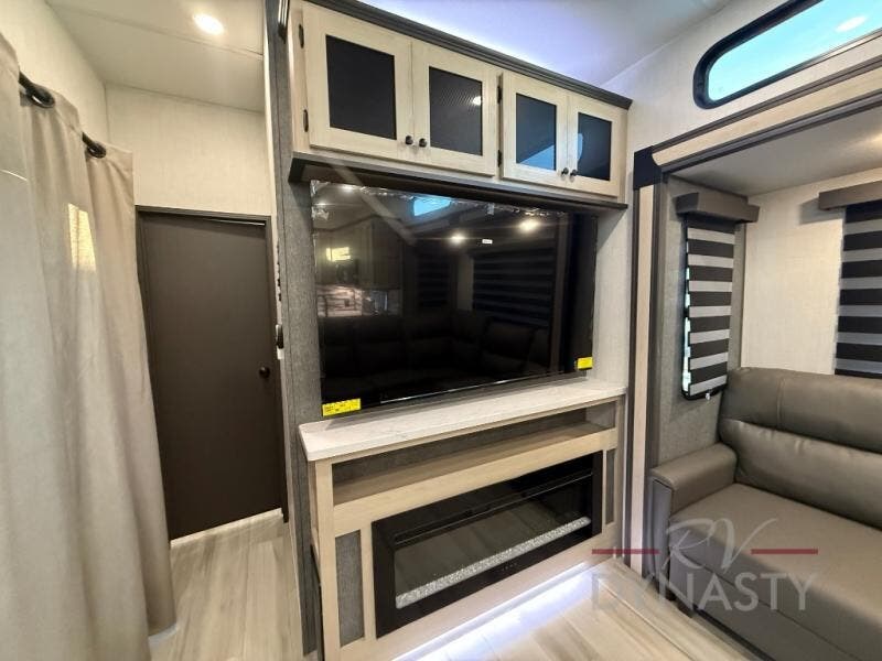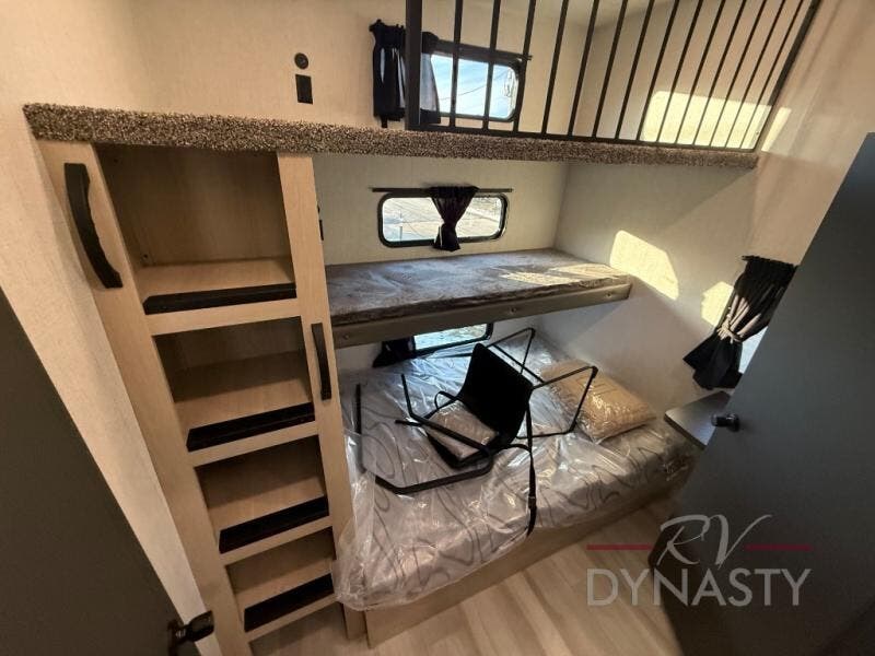 This stunning travel trailer is designed for families and travelers who crave comfort. Two rear bunk beds and a cozy loft above them create a fun and playful sleeping area for kids or guests, perfect for family bonding and sweet dreams. The full bathroom is equipped with everything you need to start your day feeling refreshed and revitalized. In the living area, the entertainment center features a warm fireplace, ideal for chilly evenings and cozy movie nights, while the plush L sofa is the perfect spot to unwind and enjoy quality time with loved ones. The pantry is stocked with storage for your favorite snacks and ingredients, while the fridge keeps everything fresh. There is a well-equipped kitchen with a spacious countertop for added convenience. Plus, the main bedroom is a peaceful sanctuary, featuring a luxurious king bed, spacious wardrobes, a stylish dresser, and the front bathroom is a thoughtful touch, offering privacy for your family or guests.