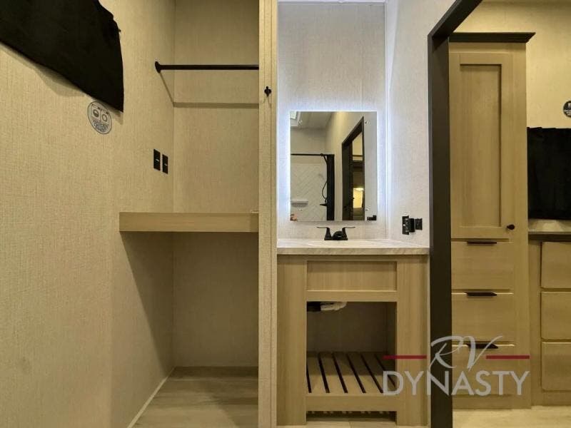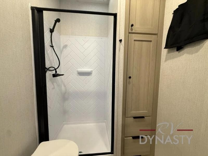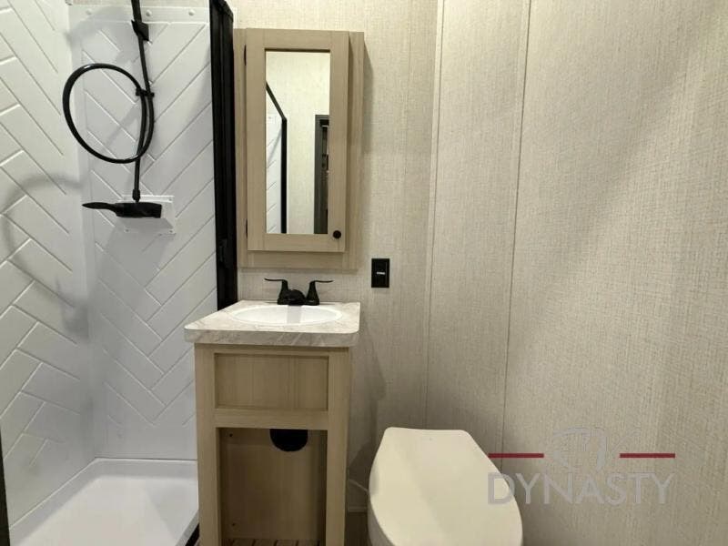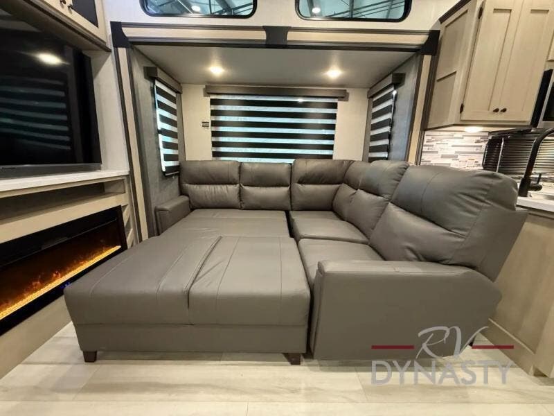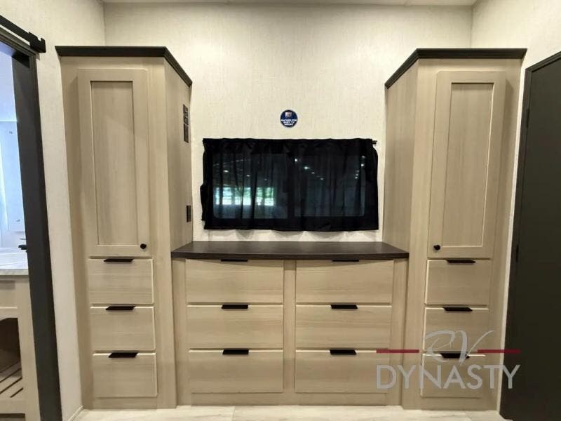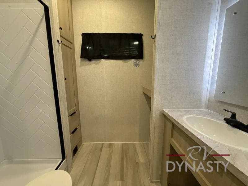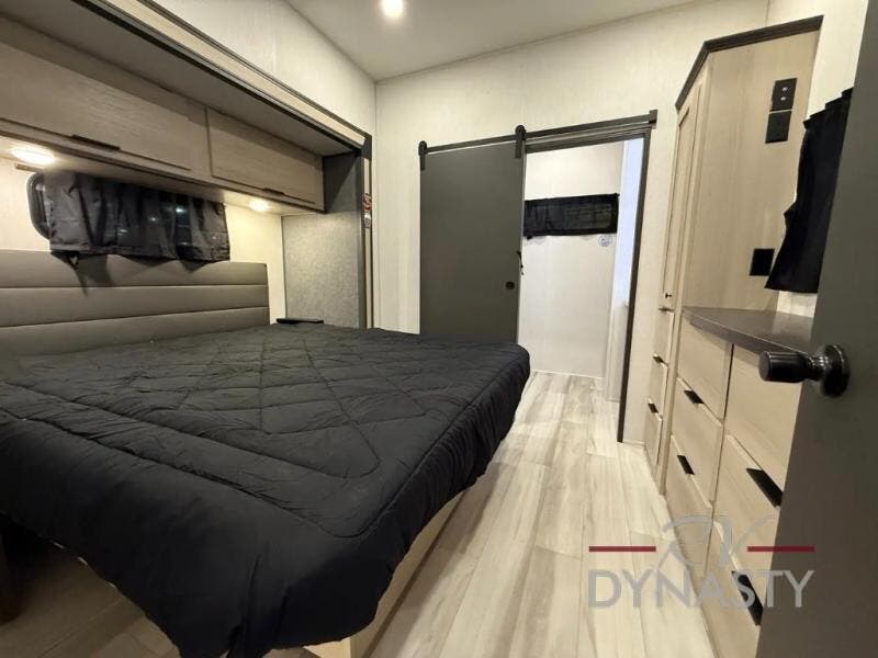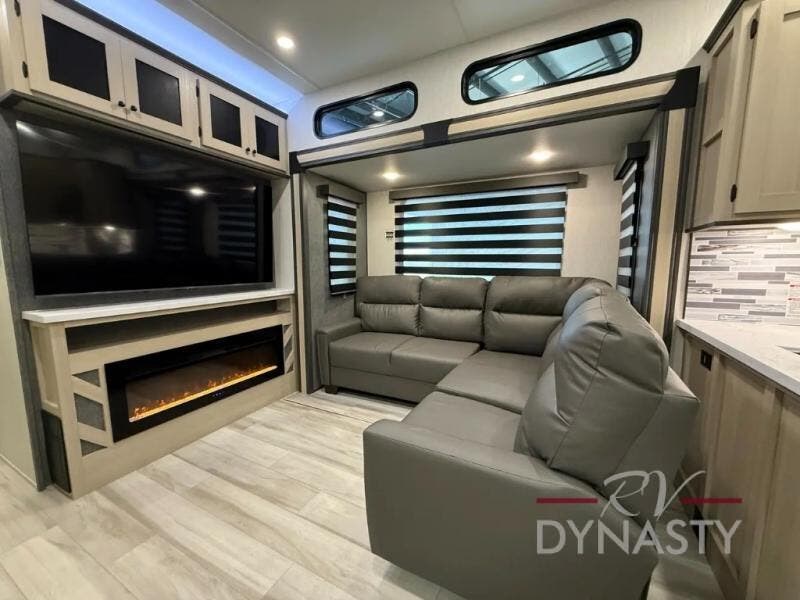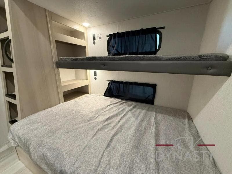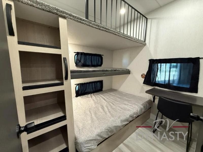 This stunning travel trailer is designed for families and travelers who crave comfort. Two rear bunk beds and a cozy loft above them create a fun and playful sleeping area for kids or guests, perfect for family bonding and sweet dreams. The full bathroom is equipped with everything you need to start your day feeling refreshed and revitalized. In the living area, the entertainment center features a warm fireplace, ideal for chilly evenings and cozy movie nights, while the plush L sofa is the perfect spot to unwind and enjoy quality time with loved ones. The pantry is stocked with storage for your favorite snacks and ingredients, while the fridge keeps everything fresh. There is a well-equipped kitchen with a spacious countertop for added convenience. Plus, the main bedroom is a peaceful sanctuary, featuring a luxurious king bed, spacious wardrobes, a stylish dresser, and the front bathroom is a thoughtful touch, offering privacy for your family or guests.
