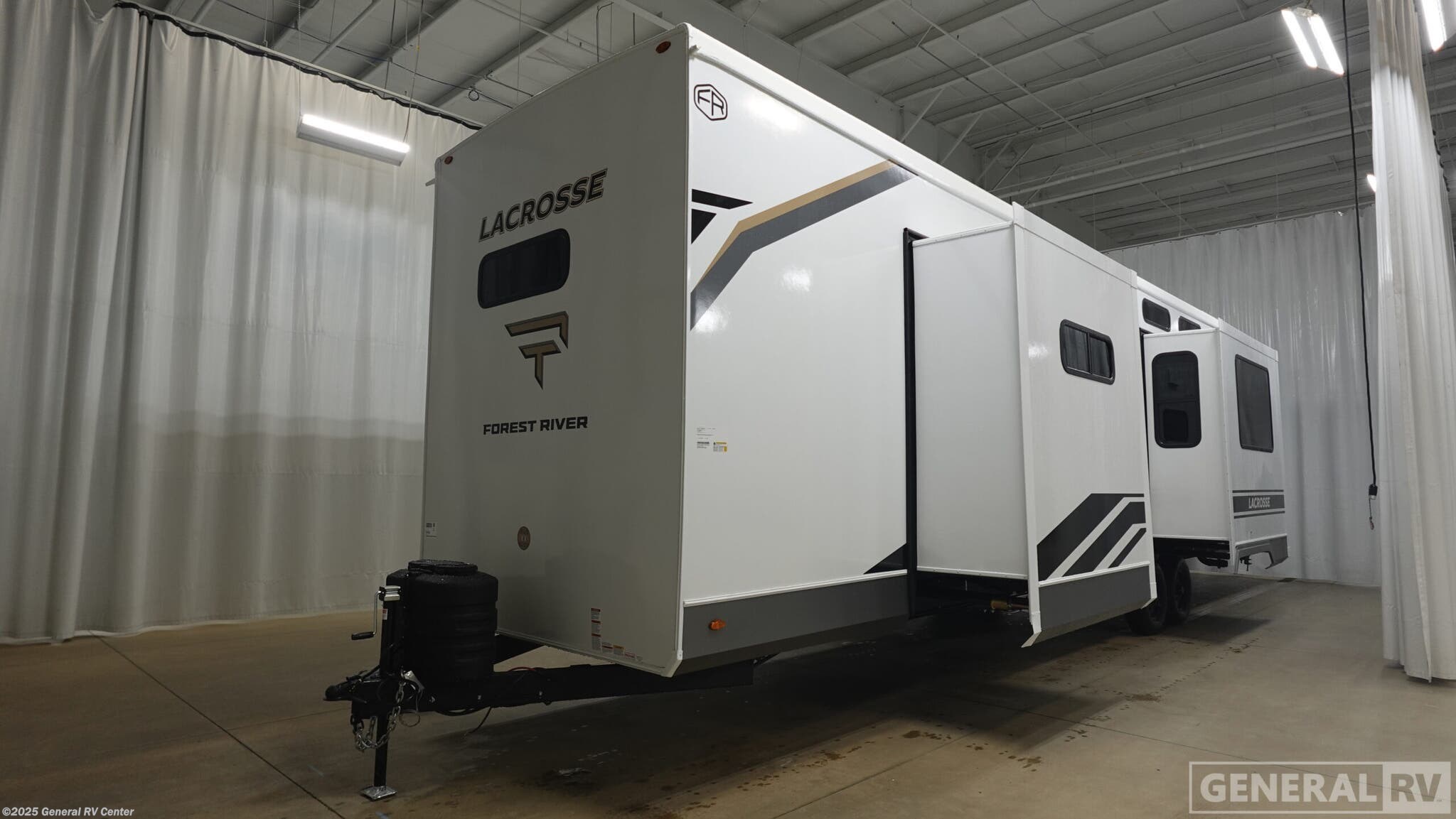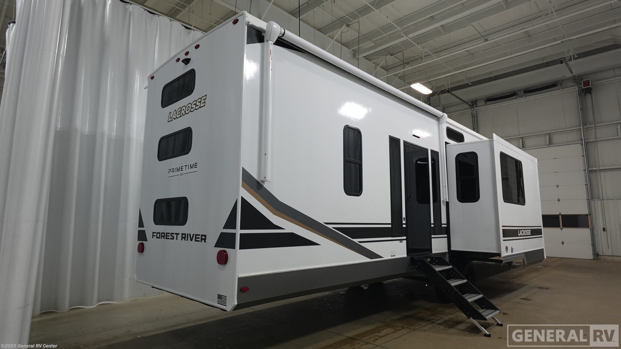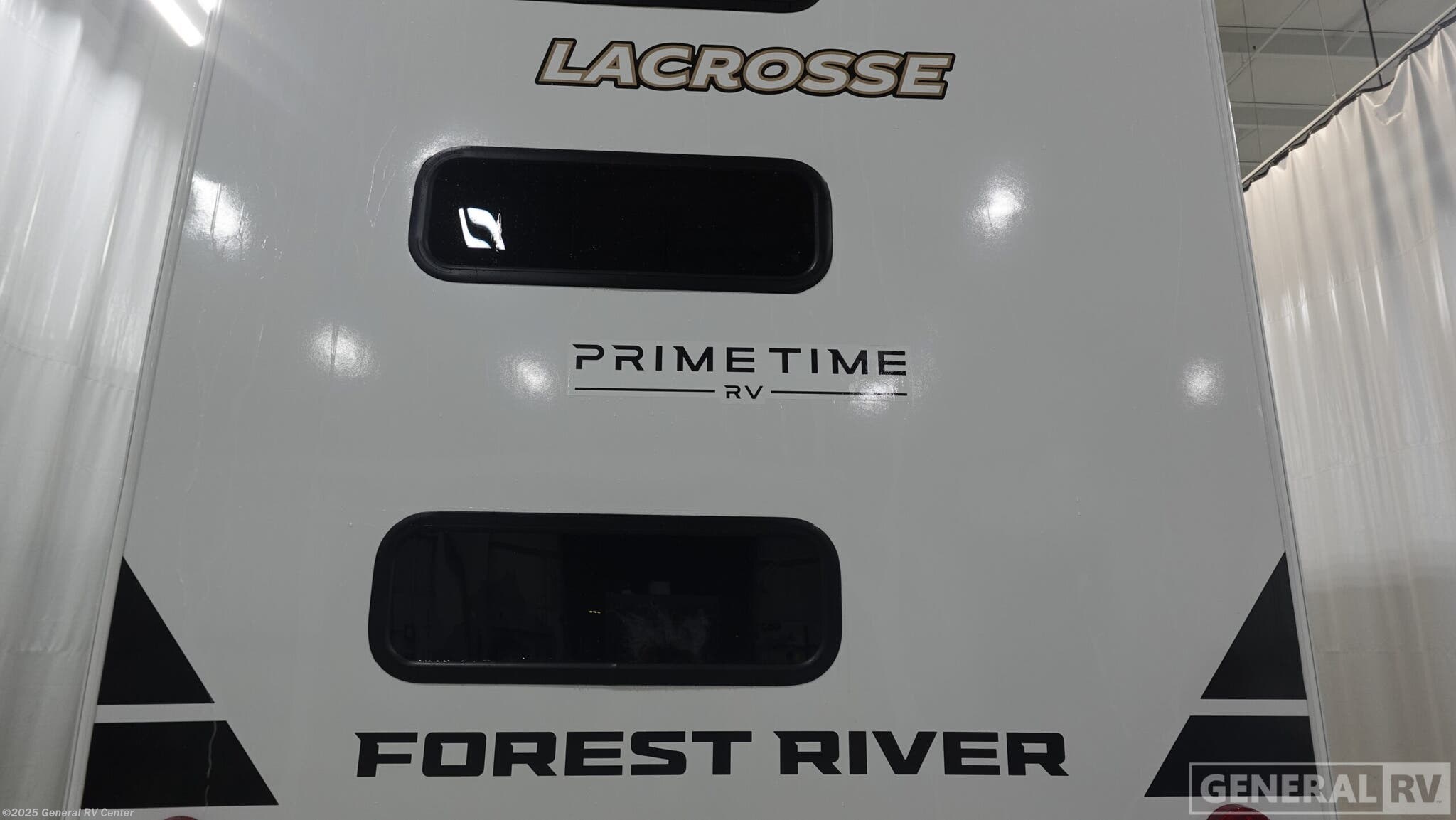 Prime Time Lacrosse travel trailer 44PARK highlights: -Two full baths -King bed -Desk w/ chair -Fireplace -Outside shower Step into the world of luxury and comfort with the Prime Time LaCrosse, a masterpiece of modern RV design. You will love all of your adventures with this Lacrosse travel trailer in tow! This trailer is perfect for a family of seven with a king bed in the front private bedroom, a bunkhouse with loft, middle bunk, and full bottom bed for all the grandkids, and a sofa if you need even more sleeping space. Inside, the LaCrosse continues to impress with a spacious, thoughtfully designed living area. The kitchen features a 16.2 Cu Ft 12V glass refrigerator, all in one stainless steel sink w/ cup cleaner, air fryer cooktop complemented by a chic tile backsplash. The high-top dinette is great for gathering for meals, a board game or game of cards. The expansive living area is perfect for relaxation, with plush sofa and a large entertainment center with smart TV and a fireplace; ready for movie nights or cozy evenings. Two full baths let everyone get cleaned up without the wait after a day of exciting adventures! Whether you're exploring the great outdoors or enjoying a quiet weekend getaway, this RV offers everything you need. For more information, visit your nearest General RV dealership and experience the LaCrosse for yourself.