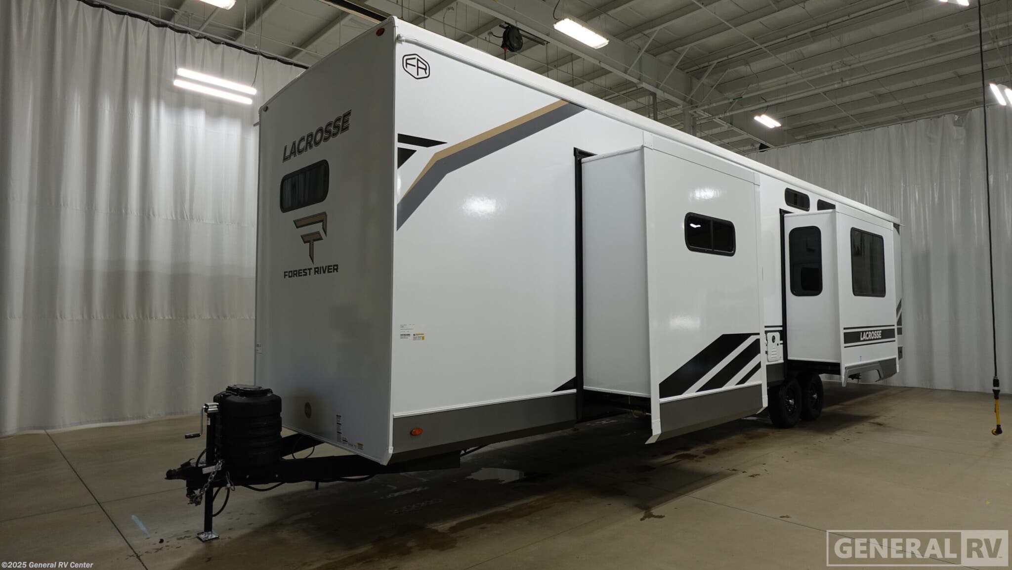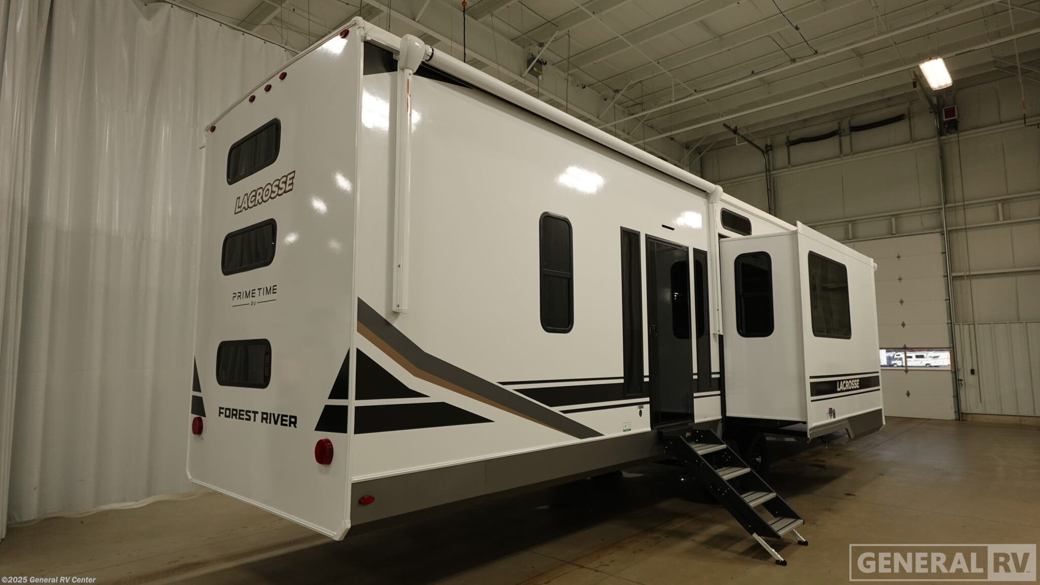 Prime Time Lacrosse travel trailer 44PARK highlights: -Two full baths -King bed -Desk w/ chair -Fireplace -Outside shower Step into the world of luxury and comfort with the Prime Time LaCrosse, a masterpiece of modern RV design. You will love all of your adventures with this Lacrosse travel trailer in tow! This trailer is perfect for a family of seven with a king bed in the front private bedroom, a bunkhouse with loft, middle bunk, and full bottom bed for all the grandkids, and a sofa if you need even more sleeping space. Inside, the LaCrosse continues to impress with a spacious, thoughtfully designed living area. The kitchen features a 16.2 Cu Ft 12V glass refrigerator, all in one stainless steel sink w/ cup cleaner, air fryer cooktop complemented by a chic tile backsplash. The high-top dinette is great for gathering for meals, a board game or game of cards. The expansive living area is perfect for relaxation, with plush sofa and a large entertainment center with smart TV and a fireplace; ready for movie nights or cozy evenings. Two full baths let everyone get cleaned up without the wait after a day of exciting adventures! Whether you're exploring the great outdoors or enjoying a quiet weekend getaway, this RV offers everything you need. For more information, visit your nearest General RV dealership and experience the LaCrosse for yourself.