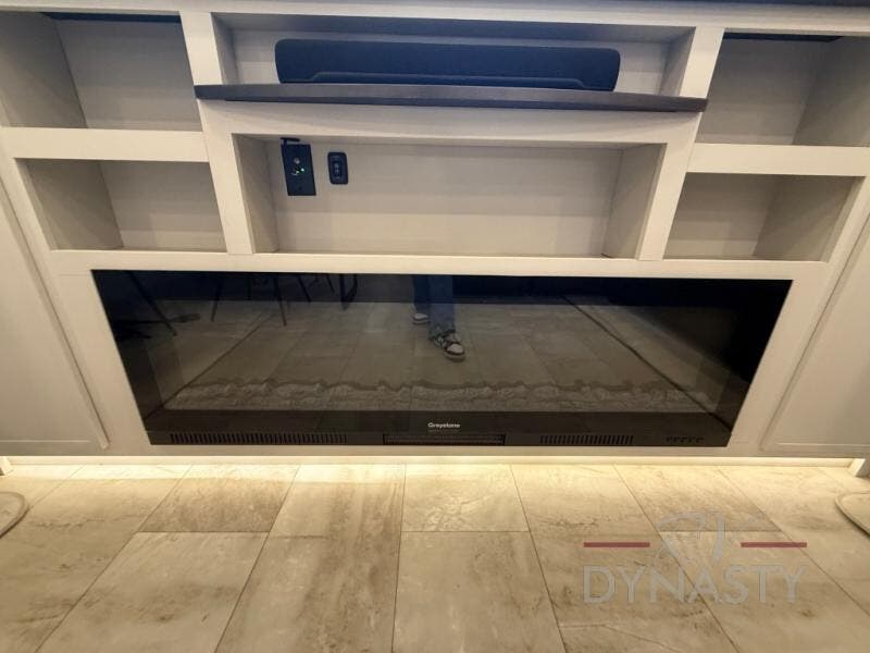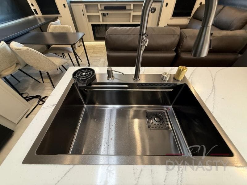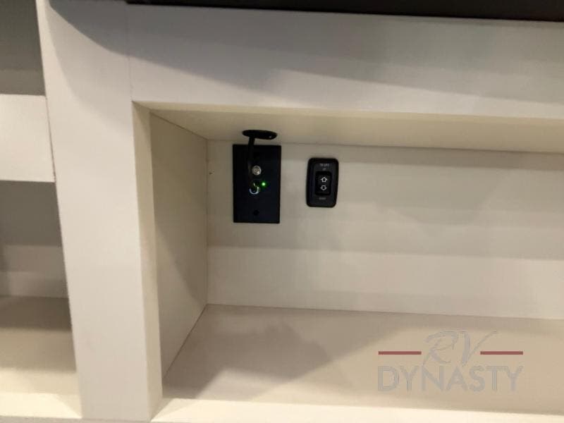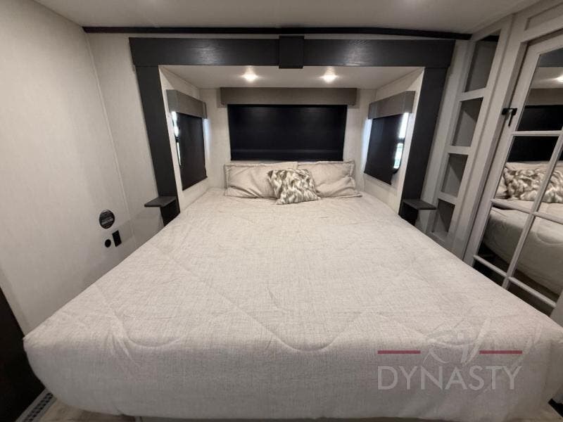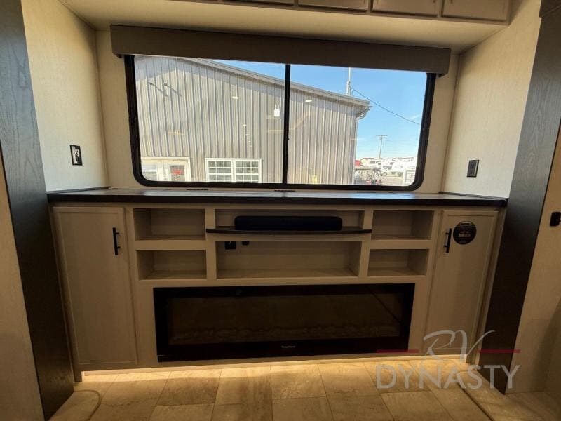 This fifth wheel is designed for comfort and making memories. The main living area is the perfect spot to relax and unwind, featuring a spacious sleeper sectional sofa with two recliners great for movie nights or just lounging around. A massive 70-inch 4K smart TV on a Televator lets you catch your favorite shows or stream the latest movies, the cozy 60-inch fireplace adds the perfect ambiance after a day full of adventure. Whether you're gathering for a meal or checking emails, the space-saving desk/dinette offers versatility for your activities. The middle U-shaped kitchen provides plenty of prep space and includes a pull-out pantry to keep all your snacks organized and within reach. Moving forward, the full bathroom features a dual vanity, allowing for two people to get ready at the same time. At the front, the private bedroom includes a spacious king-size bed, a generous closet for all your essentials, and stackable washer/dryer prep for added convenience on longer trips.