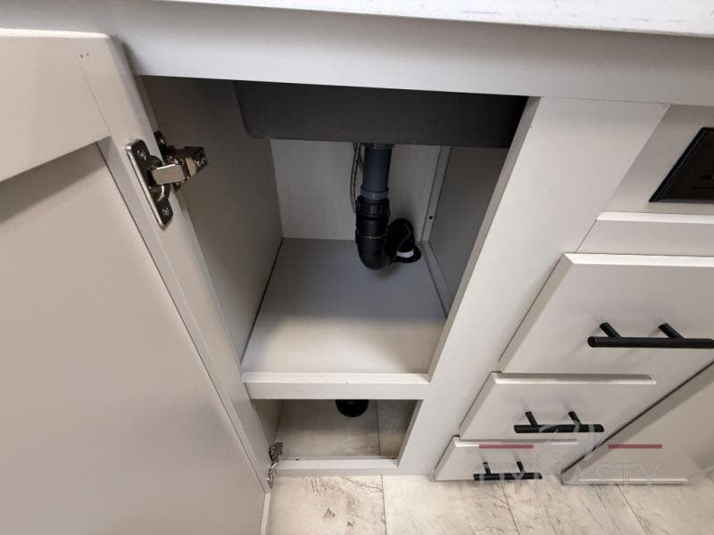 The Sanibel series stands out with a combination of unique and highly functional exterior and interior features designed for both convenience and durability. On the outside, a drop-frame pass-through storage area with a rubberized liner offers ample space while protecting your gear from moisture and wear. Setting up camp is effortless thanks to the one-touch auto-leveling system and rubberized suspension equalizer, which provide a smooth and stable foundation. Inside, comfort meets practicality with carpet less slides for easy cleaning and blackout roller shades for privacy and temperature control. The real wood cabinet doors and solid surface countertops add a touch of elegance, no matter where the road takes you.