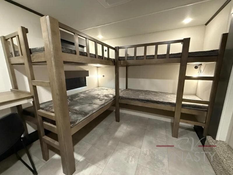 It will be so easy to enjoy extended stays or weekend trips in this spacious fifth wheel. You will love waking up in your private master bedroom that includes a king bed slide, bedroom wardrobe, and 40" TV. The front full bath includes dual bath sinks for added convenience and a large walk-in closet with clothes bars. If you have any guests stay over, they can sleep on the L-shaped easy glide sofa with a theater seat on one end. There is also a free-standing dinette with four chairs and a desk with a chair if you need to get some work done. The chef of your group will love the rear kitchen with a u-shaped counter, two kitchen pantries, and a 16 cu. ft. refrigerator for food storage. This model also includes a mid-coach half bath with washer and dryer prep if you choose to add those appliances!