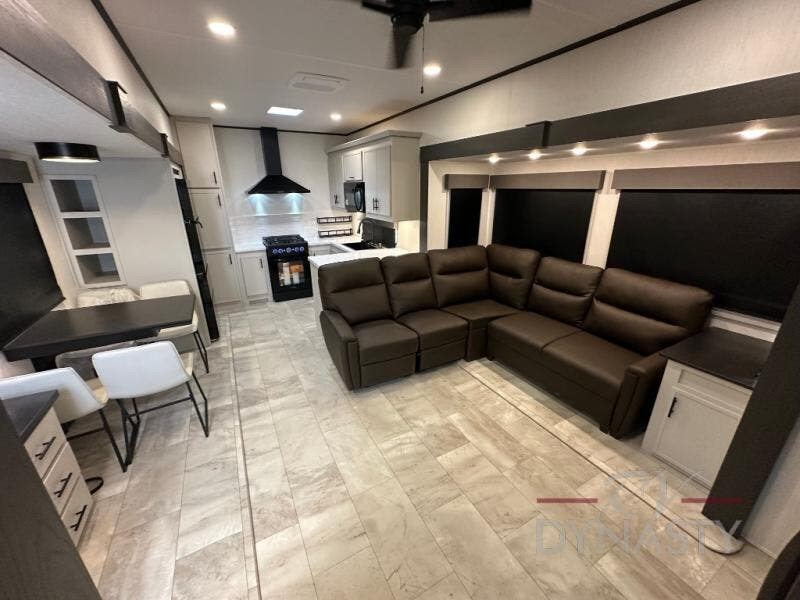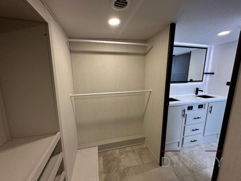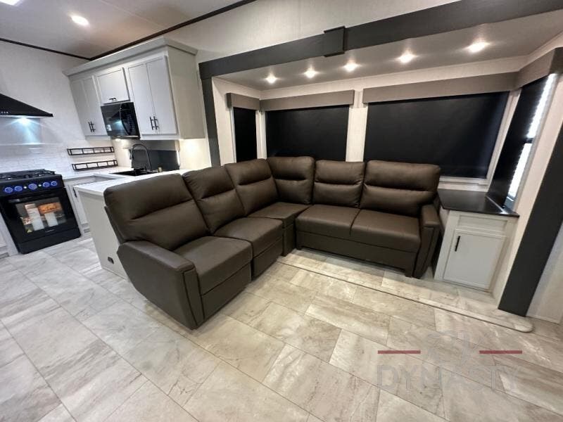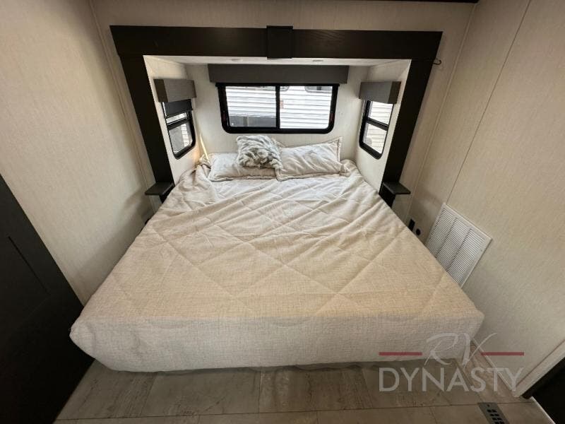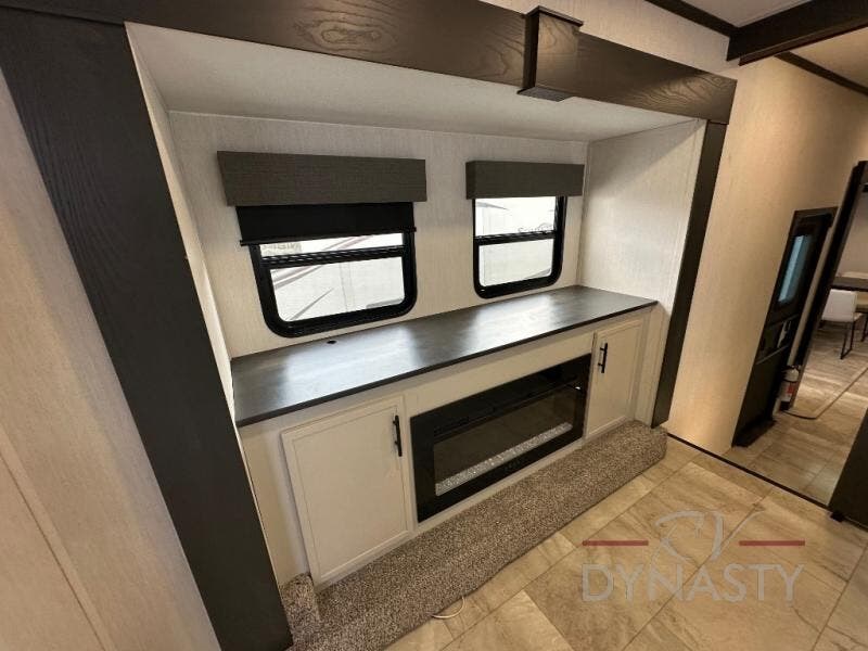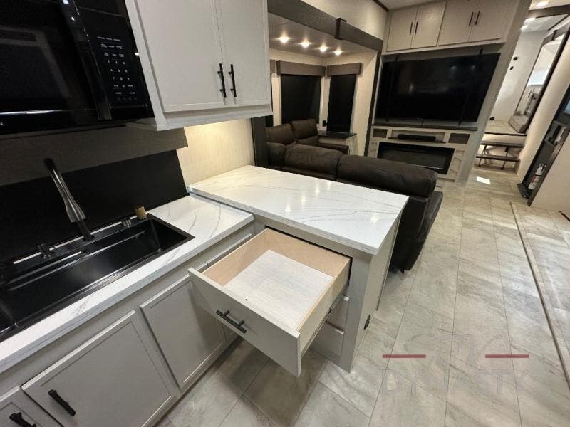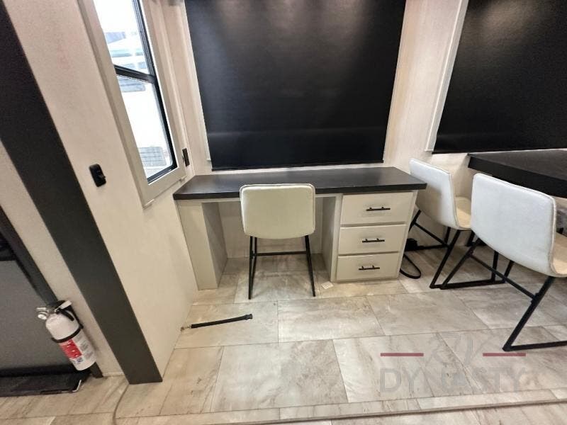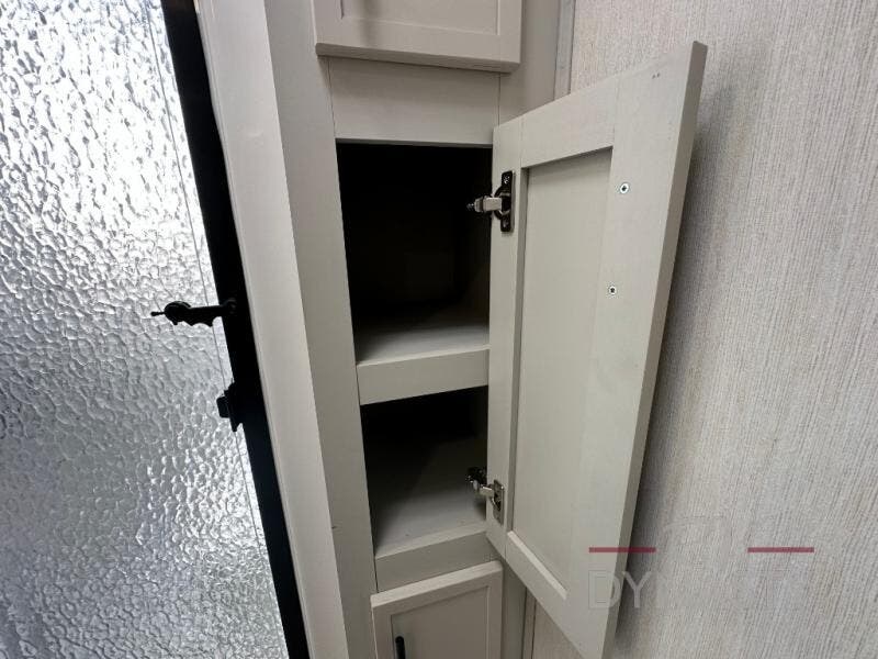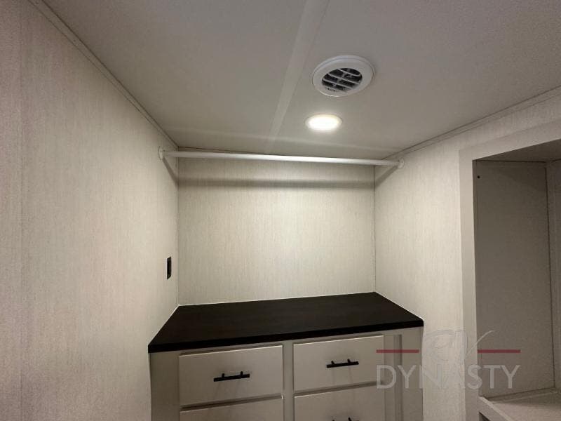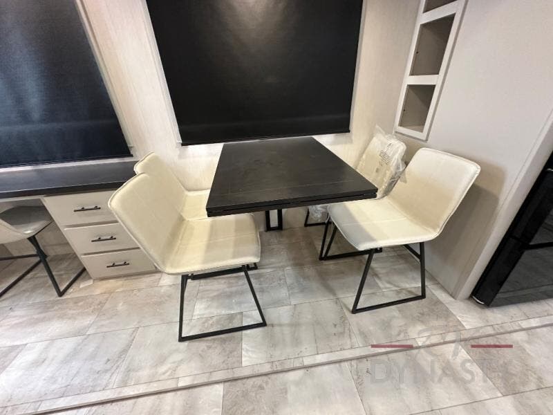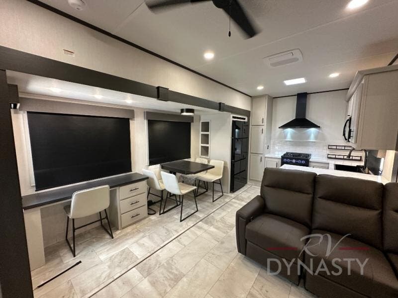 It will be so easy to enjoy extended stays or weekend trips in this spacious fifth wheel. You will love waking up in your private master bedroom that includes a king bed slide, bedroom wardrobe, and 40" TV. The front full bath includes dual bath sinks for added convenience and a large walk-in closet with clothes bars. If you have any guests stay over, they can sleep on the L-shaped easy glide sofa with a theater seat on one end. There is also a free-standing dinette with four chairs and a desk with a chair if you need to get some work done. The chef of your group will love the rear kitchen with a u-shaped counter, two kitchen pantries, and a 16 cu. ft. refrigerator for food storage. This model also includes a mid-coach half bath with washer and dryer prep if you choose to add those appliances!