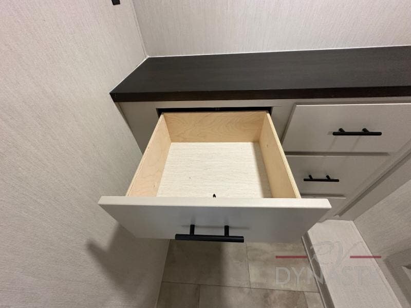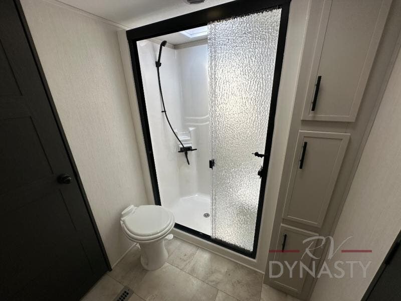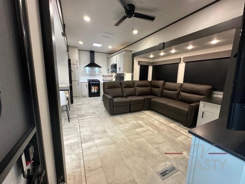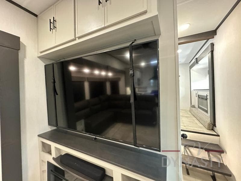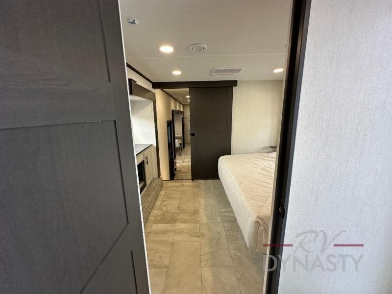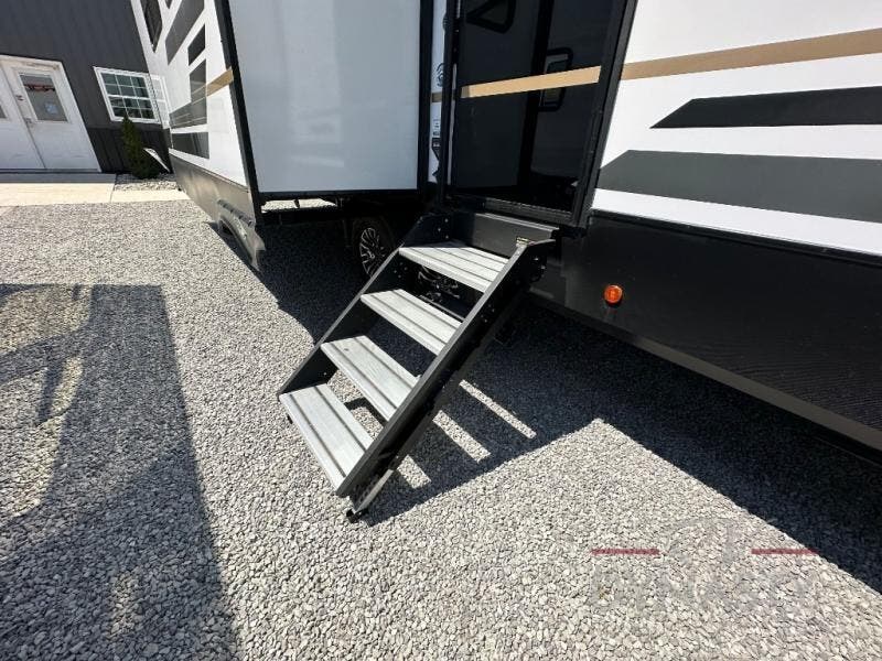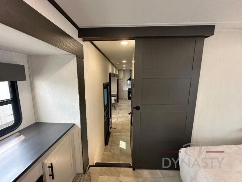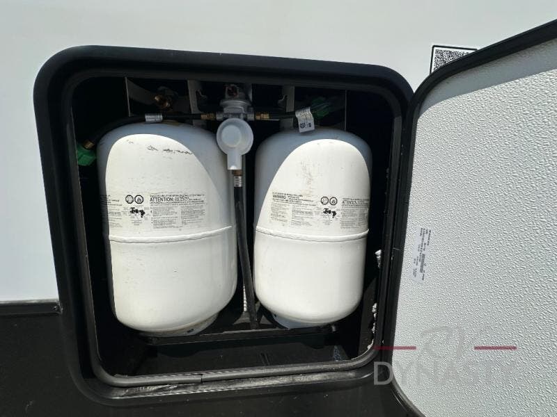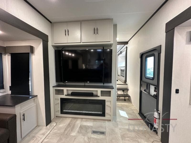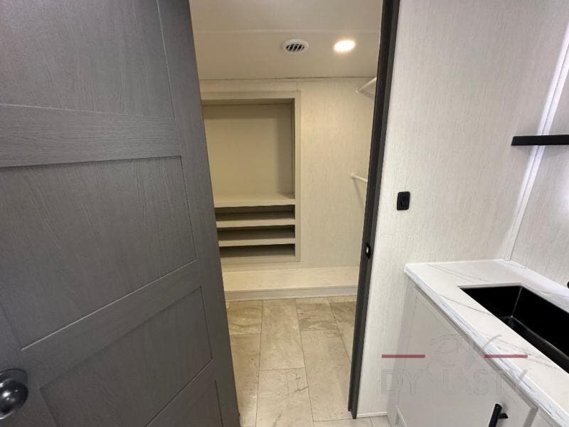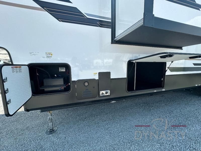 It will be so easy to enjoy extended stays or weekend trips in this spacious fifth wheel. You will love waking up in your private master bedroom that includes a king bed slide, bedroom wardrobe, and 40" TV. The front full bath includes dual bath sinks for added convenience and a large walk-in closet with clothes bars. If you have any guests stay over, they can sleep on the L-shaped easy glide sofa with a theater seat on one end. There is also a free-standing dinette with four chairs and a desk with a chair if you need to get some work done. The chef of your group will love the rear kitchen with a u-shaped counter, two kitchen pantries, and a 16 cu. ft. refrigerator for food storage. This model also includes a mid-coach half bath with washer and dryer prep if you choose to add those appliances!