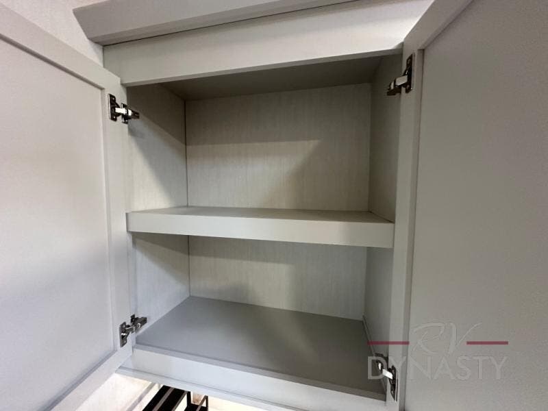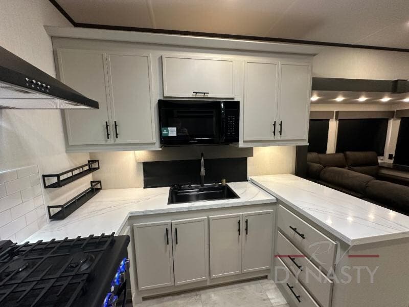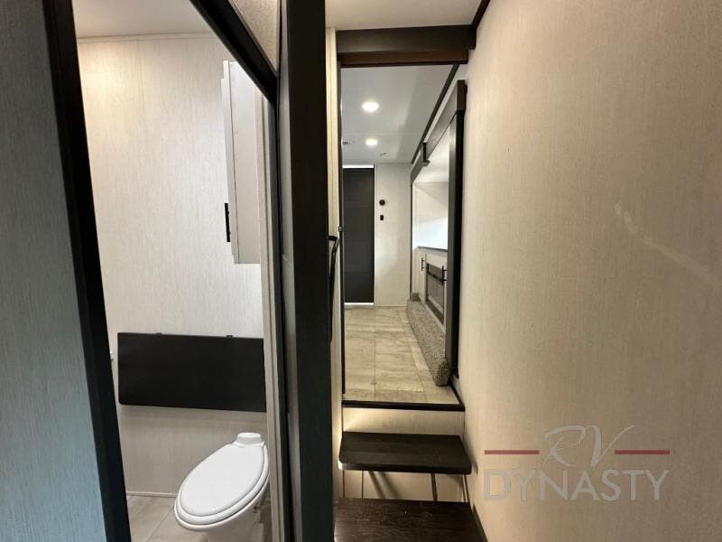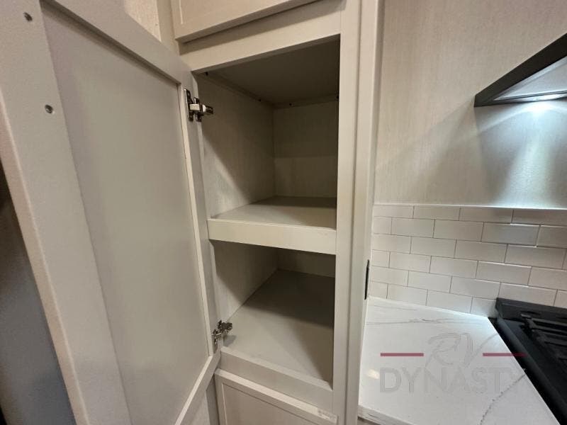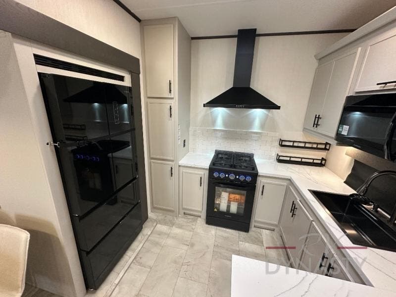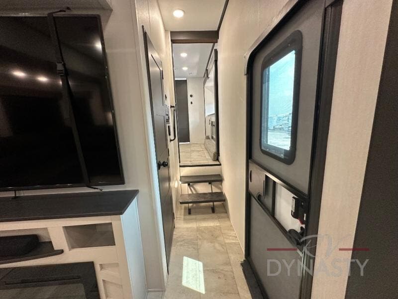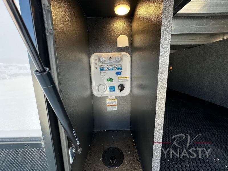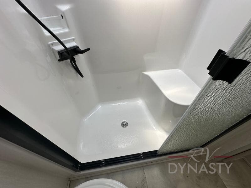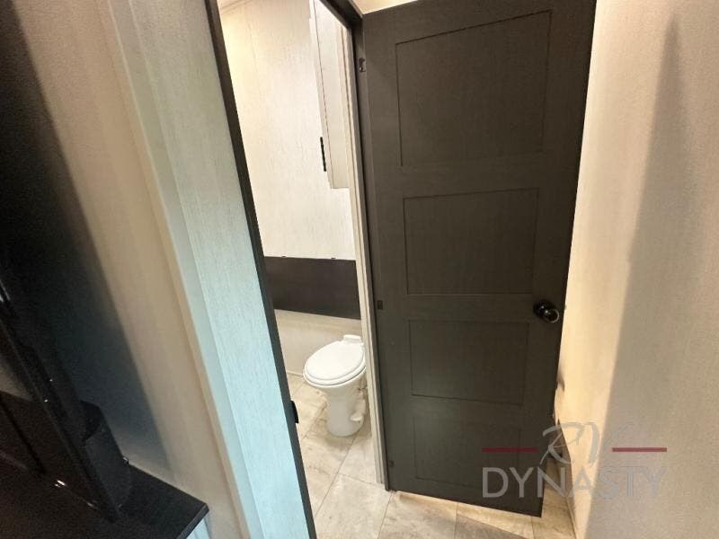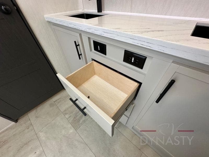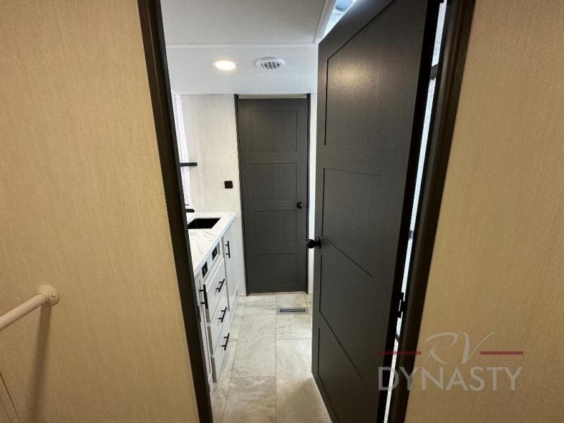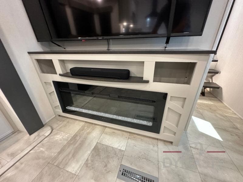 It will be so easy to enjoy extended stays or weekend trips in this spacious fifth wheel. You will love waking up in your private master bedroom that includes a king bed slide, bedroom wardrobe, and 40" TV. The front full bath includes dual bath sinks for added convenience and a large walk-in closet with clothes bars. If you have any guests stay over, they can sleep on the L-shaped easy glide sofa with a theater seat on one end. There is also a free-standing dinette with four chairs and a desk with a chair if you need to get some work done. The chef of your group will love the rear kitchen with a u-shaped counter, two kitchen pantries, and a 16 cu. ft. refrigerator for food storage. This model also includes a mid-coach half bath with washer and dryer prep if you choose to add those appliances!