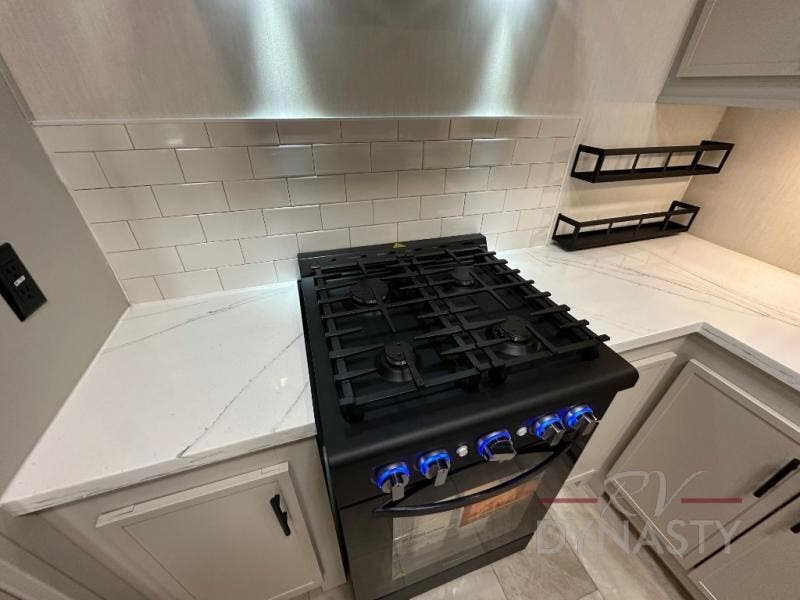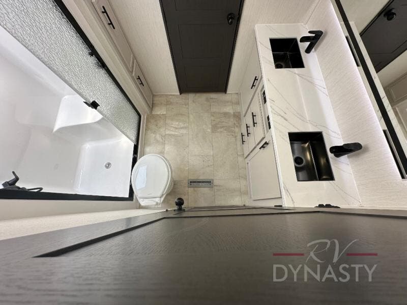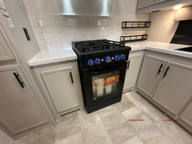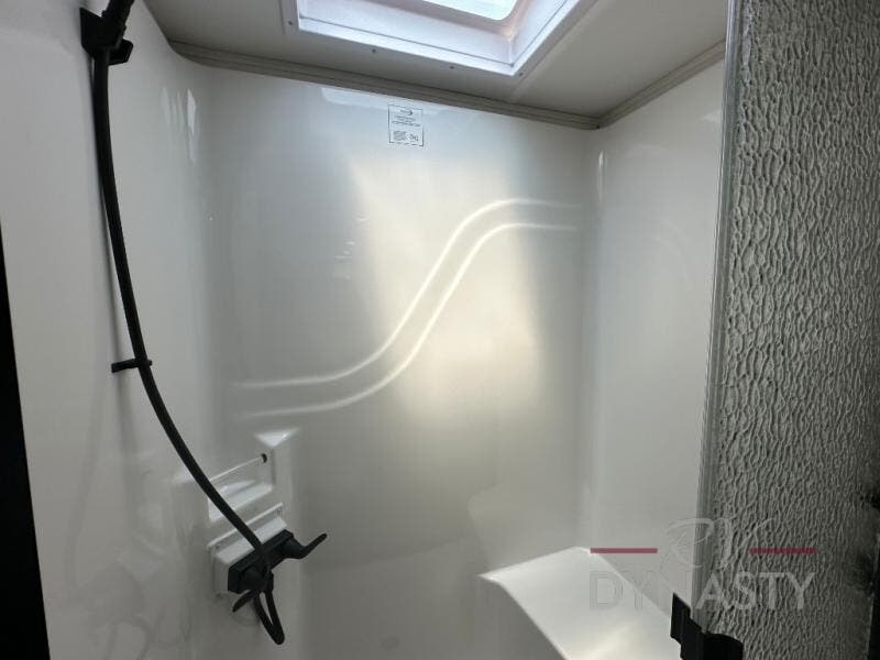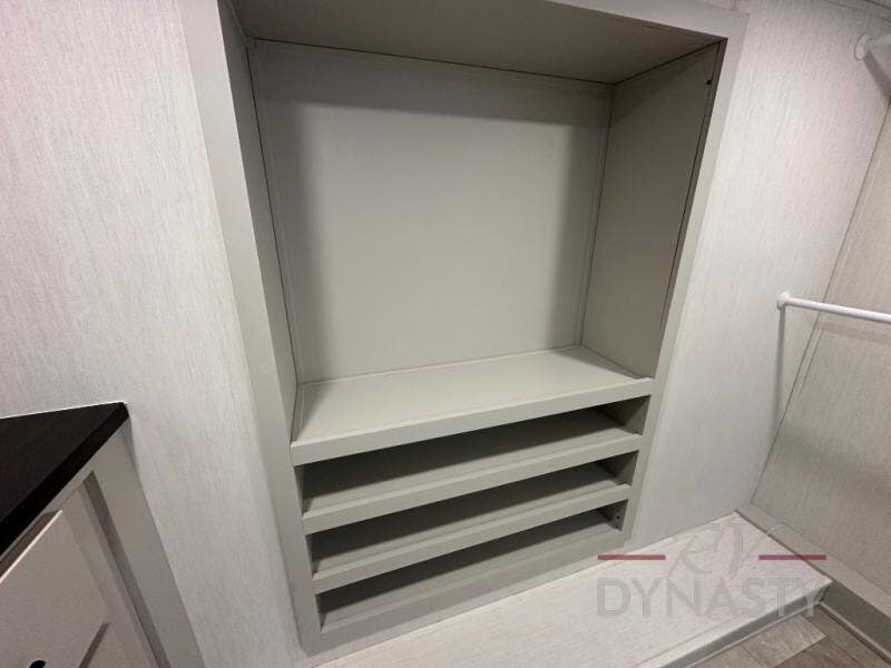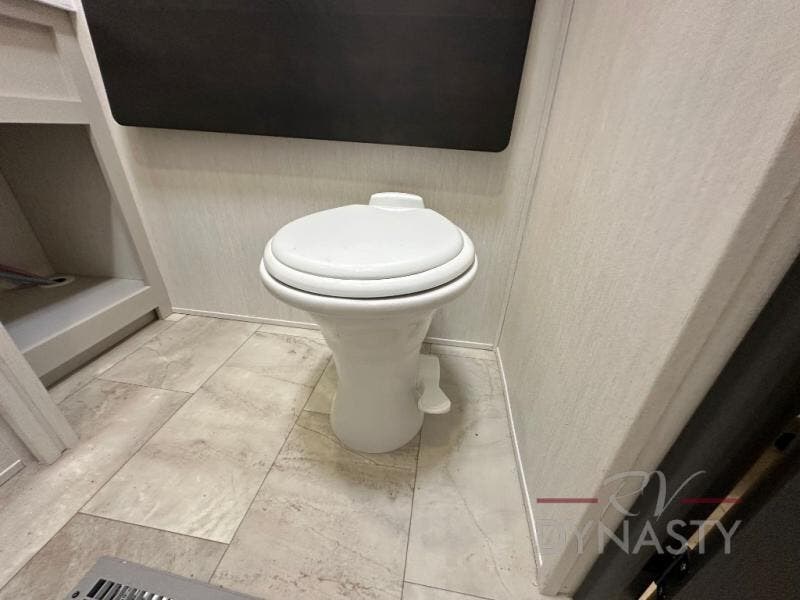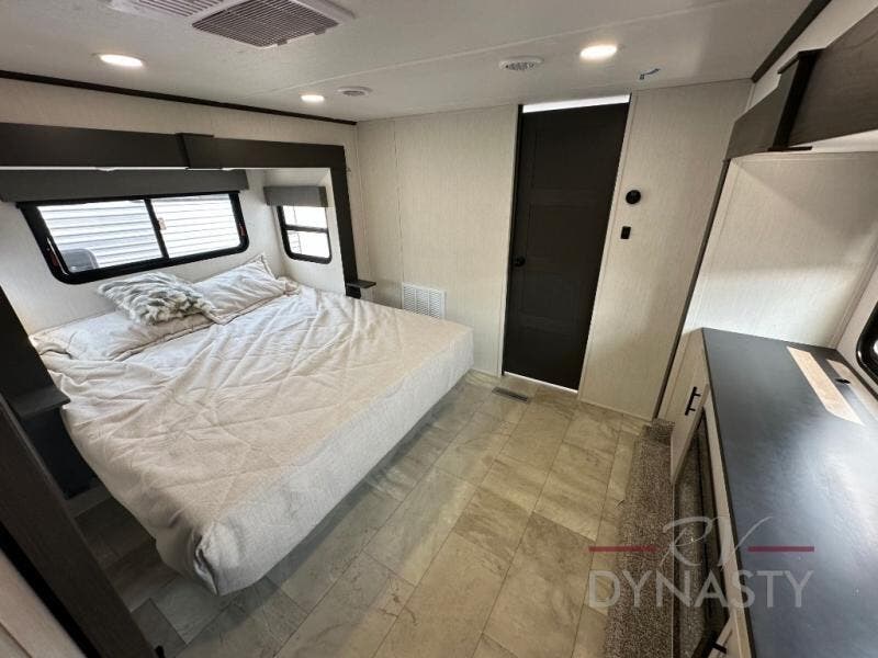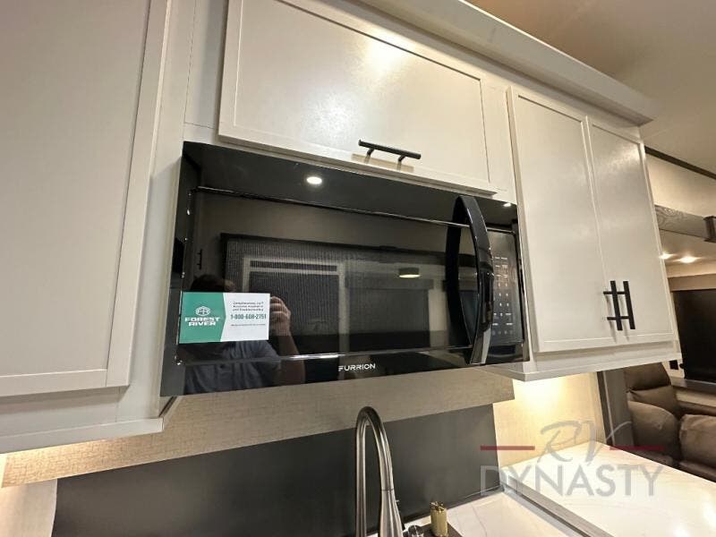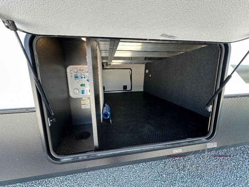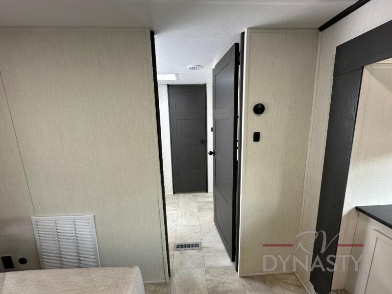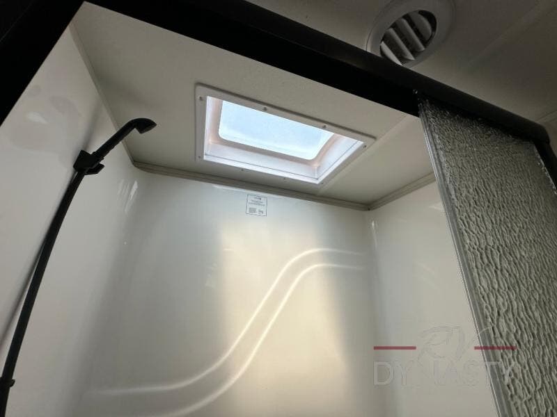 It will be so easy to enjoy extended stays or weekend trips in this spacious fifth wheel. You will love waking up in your private master bedroom that includes a king bed slide, bedroom wardrobe, and 40" TV. The front full bath includes dual bath sinks for added convenience and a large walk-in closet with clothes bars. If you have any guests stay over, they can sleep on the L-shaped easy glide sofa with a theater seat on one end. There is also a free-standing dinette with four chairs and a desk with a chair if you need to get some work done. The chef of your group will love the rear kitchen with a u-shaped counter, two kitchen pantries, and a 16 cu. ft. refrigerator for food storage. This model also includes a mid-coach half bath with washer and dryer prep if you choose to add those appliances!