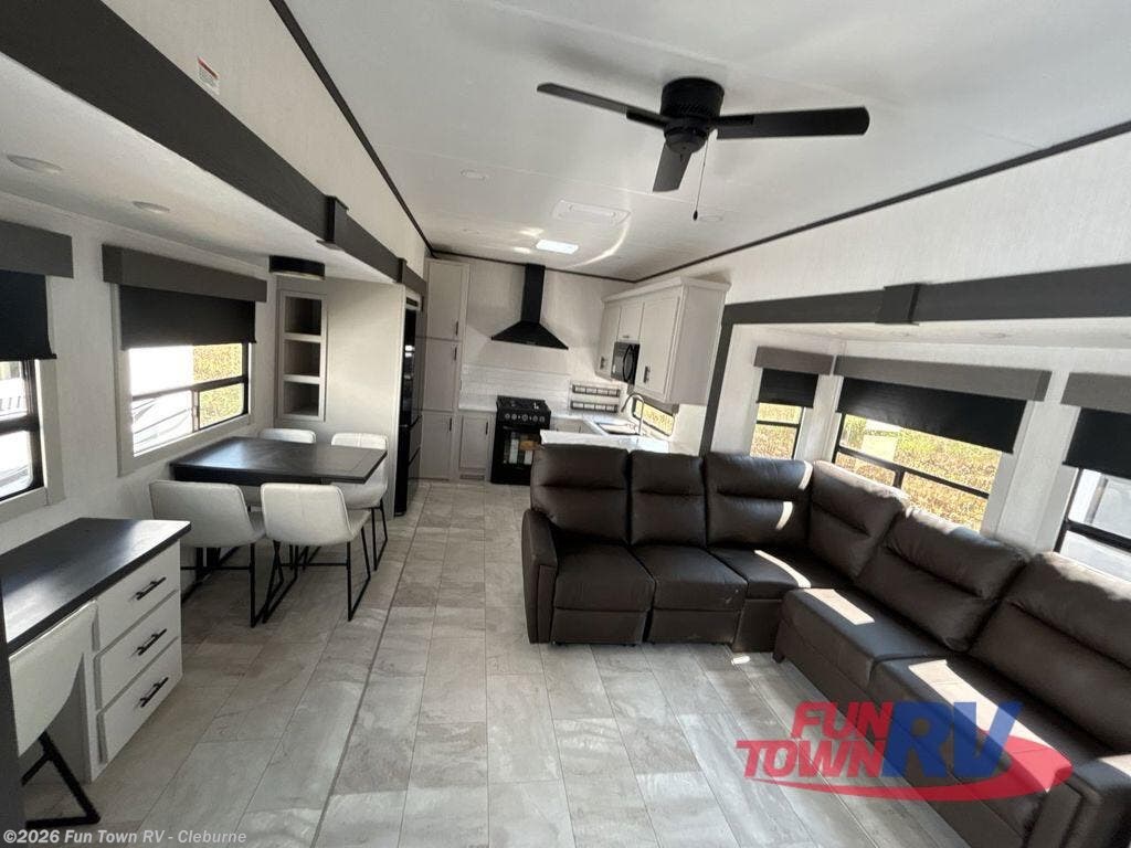 One of the standout features of the 38LAUNDRY fifth wheel is the convenient stackable washer and dryer located in the half bath, letting you take care of laundry right from the comfort of your trailer, no campground laundromat needed. After a day full of outdoor adventures, everyone can relax together in the spacious living room, which features a large sectional sleeper sofa perfect for movie nights or extra sleeping space. The equipped kitchen includes a four-burner range, giving the chef plenty of room to cook up delicious meals with ease. And when it's time to unwind, the private bedroom offers a peaceful retreat complete with a walk-through private bathroom featuring a dual vanity and a generous walk-in closet, ideal for storing all your clothes and camping gear.