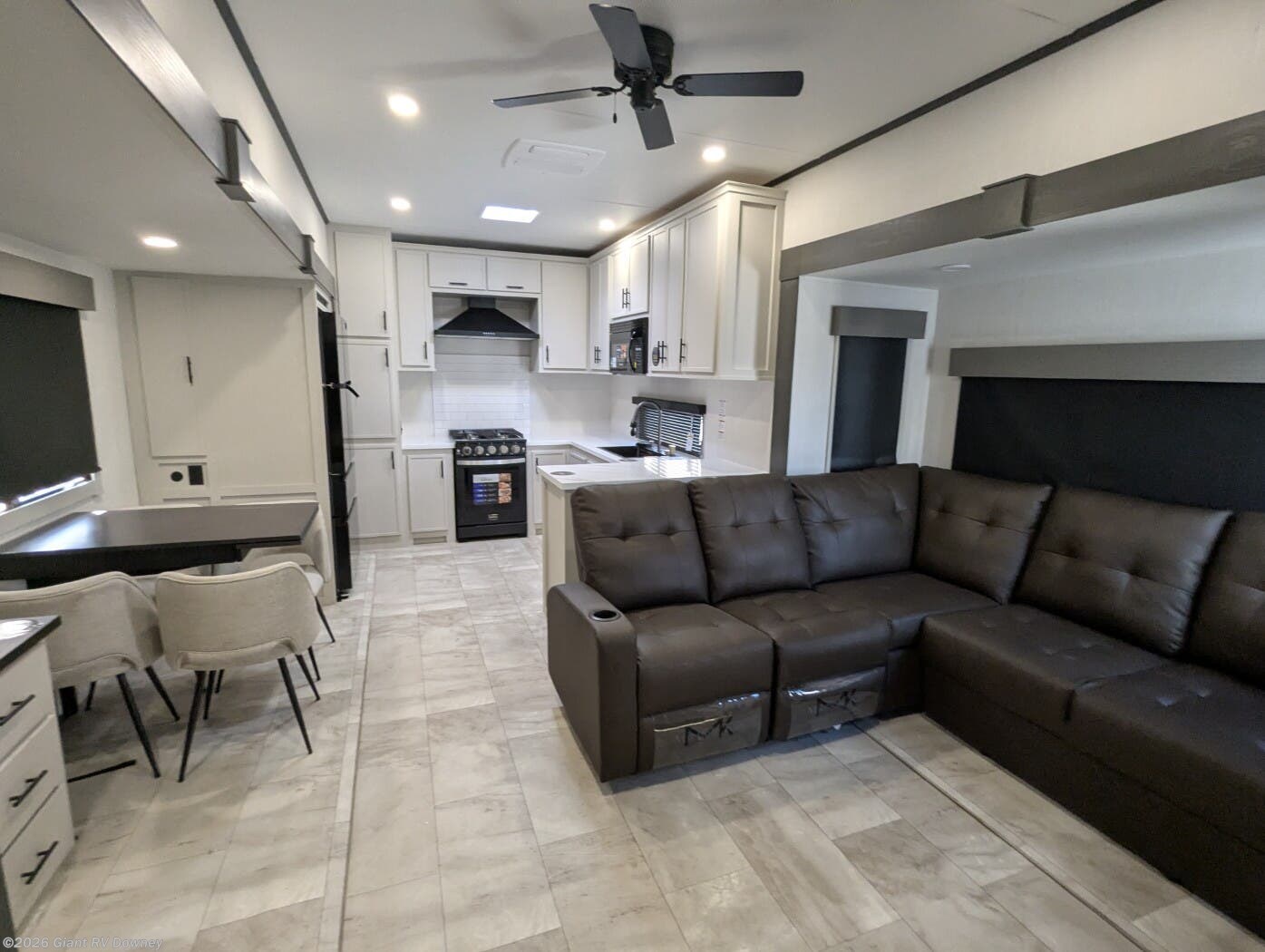 Expansive Living Flow: Four slideouts open the central living area with theater seating, kitchen island, pull-out dinette, and fireplace for a residential-style gathering space that connects seamlessly to the front bunkhouse.