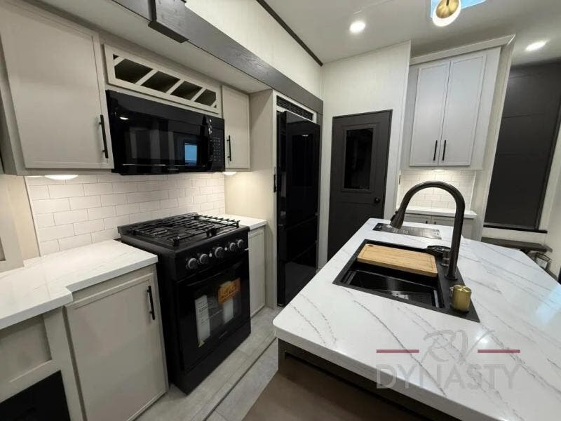 Camping with friends and family just got easier in this spacious fifth wheel that can sleep eight each night. There is a full rear bath, complete with dual bath sinks, a linen closet, plus a second linen closet with washer/dryer prep for added convenience. The half bath is in the front bunkhouse suite, where your guest will also enjoy four bunk beds, a 40" TV, a large wardrobe, plus a desk if they need to get some work done. The combined middle kitchen and living area includes a kitchen island with a flip-up countertop and a hidden dinette the chef of your group is sure to love, plus there is a large pantry for food, a hutch to store nice dishes, and a 16 cu. ft. French door 12V refrigerator for perishables. And everyone will love relaxing on the large sofa across from the pop-up LED Smart TV and fireplace!