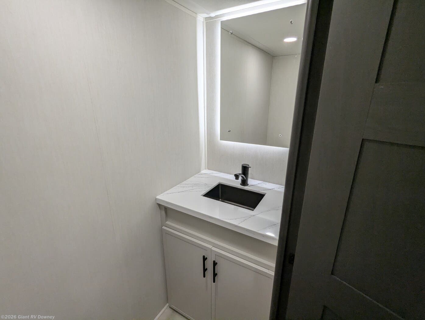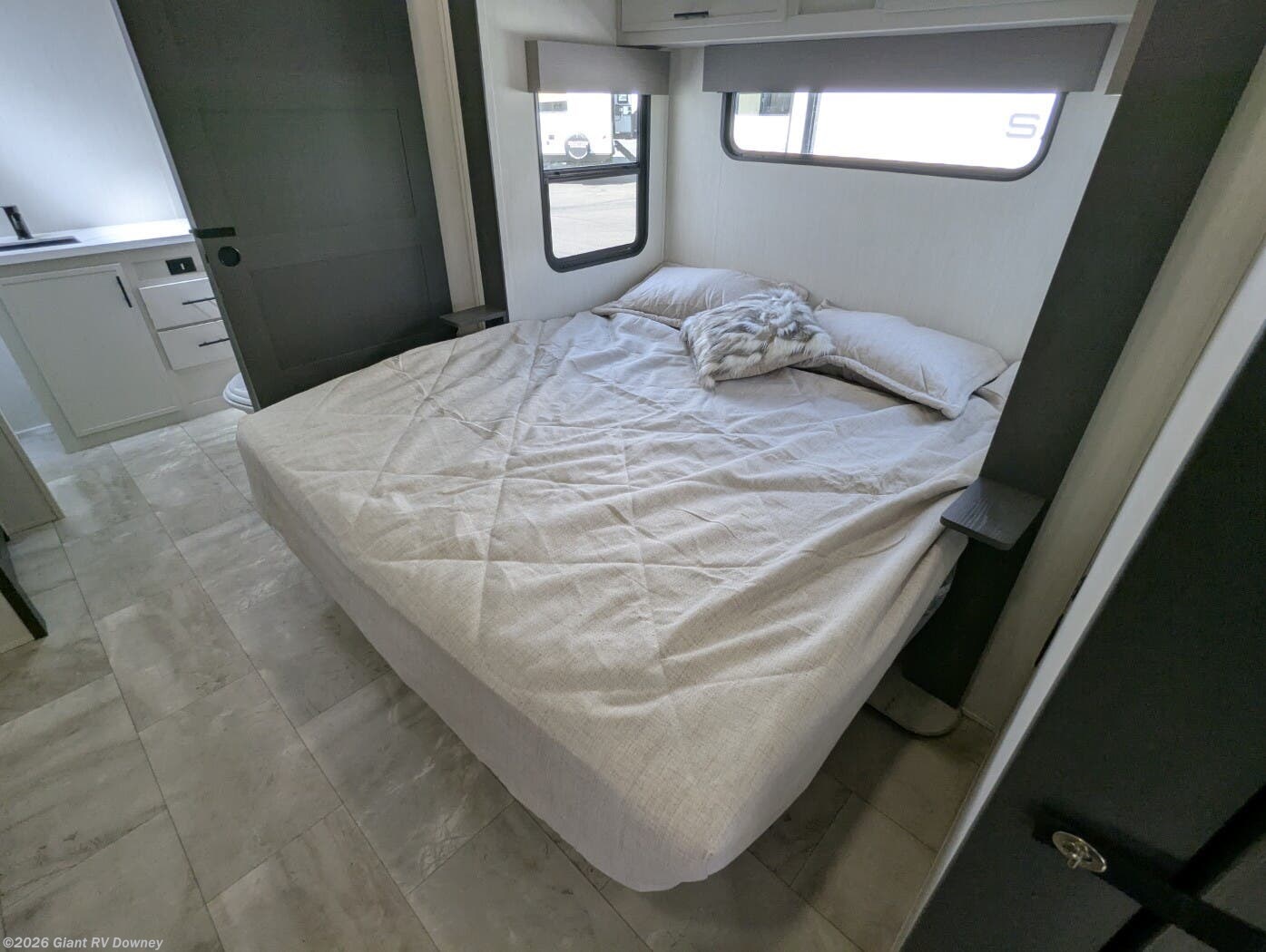 Private Master Suite & Full Bath including a comfortable king bed, wardrobe storage, linen closet, and a full bathroom with large shower, offering convenience and comfort on the road.