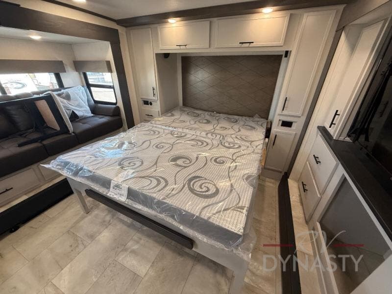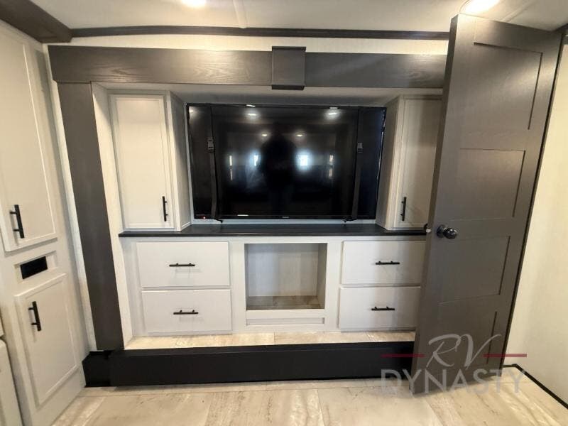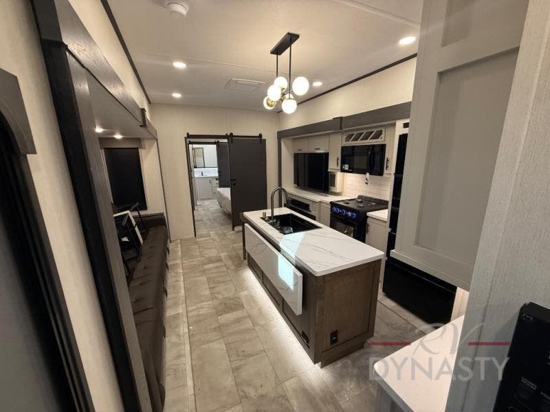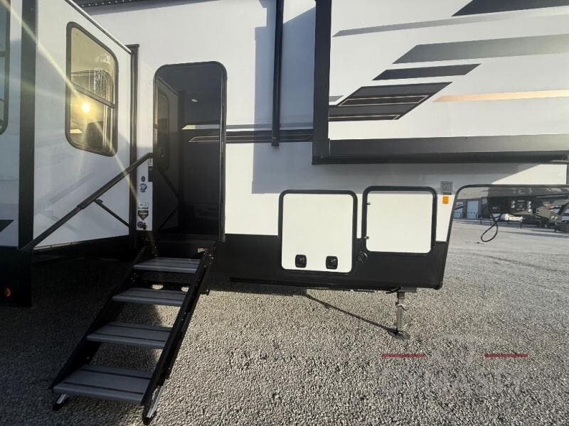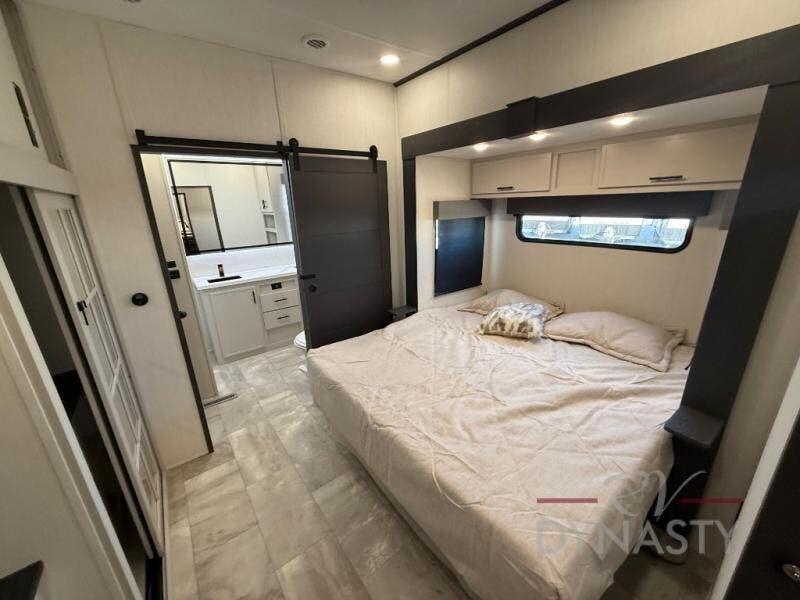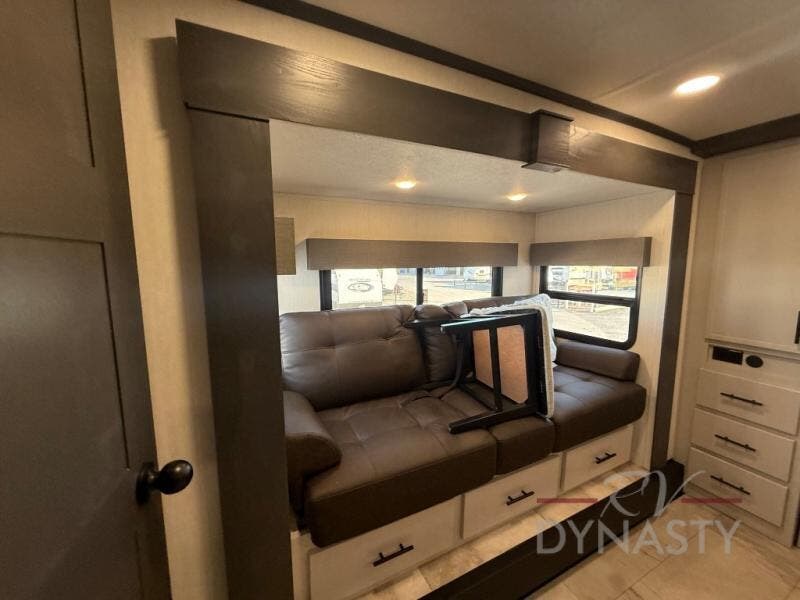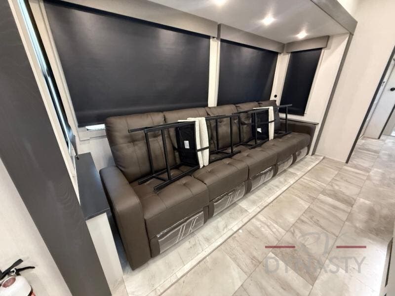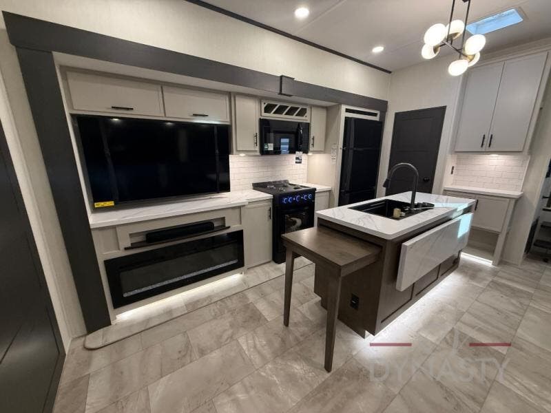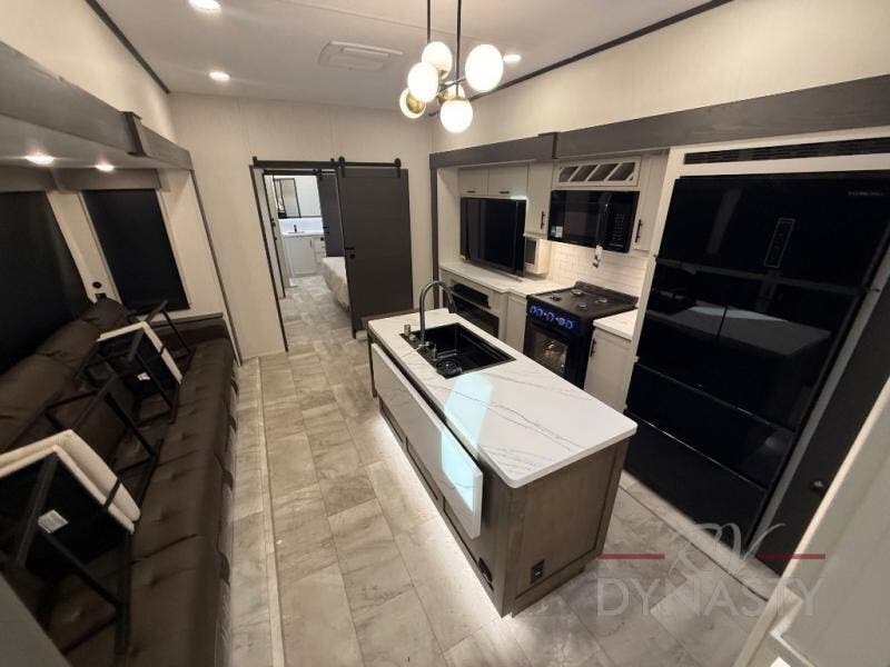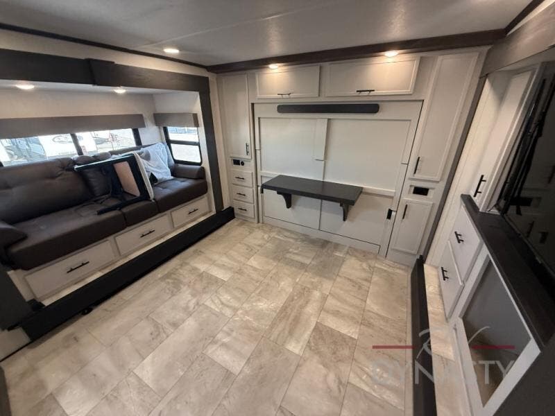 This fifth wheel offers a highly versatile layout designed to adapt to your lifestyle. The front bedroom is a flexible space featuring a sofa on a slide-out and a desk that easily converts into a Murphy bed, making it ideal as a remote office, an extra-sleeping area for guests, or even a cozy living space with a smart TV. A full bathroom is conveniently located nearby for added comfort. In the center of the trailer, you'll find a spacious living area with a five-piece sectional recliner and an expandable dinette to accommodate everyone. The well-equipped kitchen includes essentials like a four-burner range and a French door refrigerator, perfect for cooking up your favorite meals. At the rear, the master bedroom offers a relaxing retreat with a king-sized bed and direct access to a full bathroom featuring a dual vanity, bringing the comforts of home wherever you go.