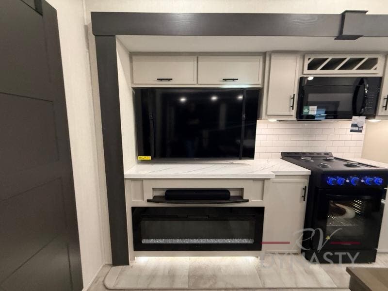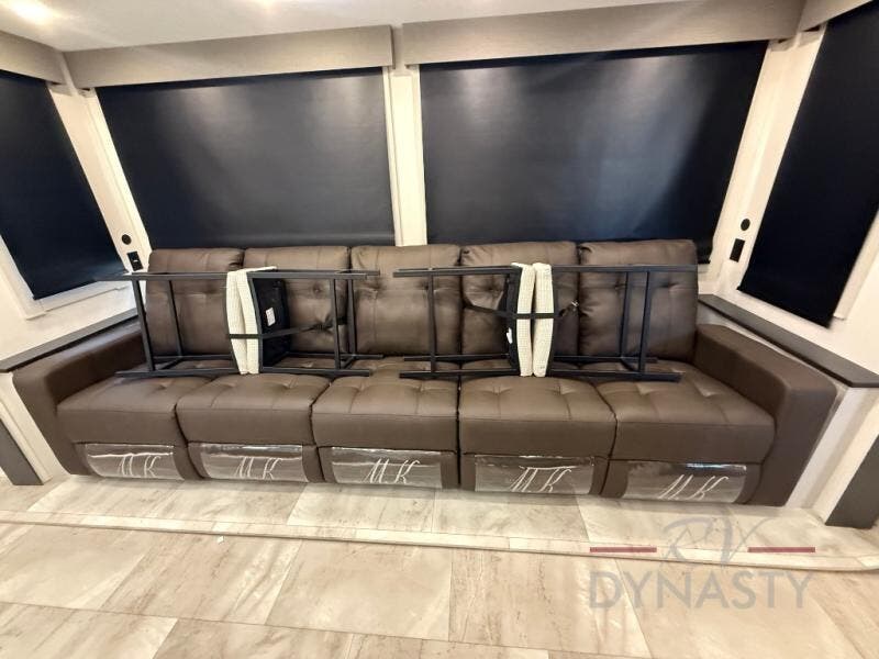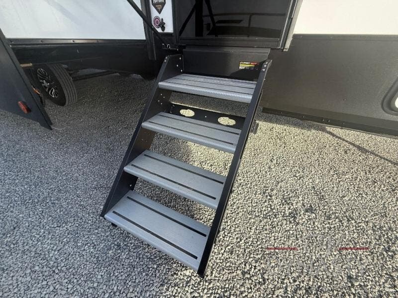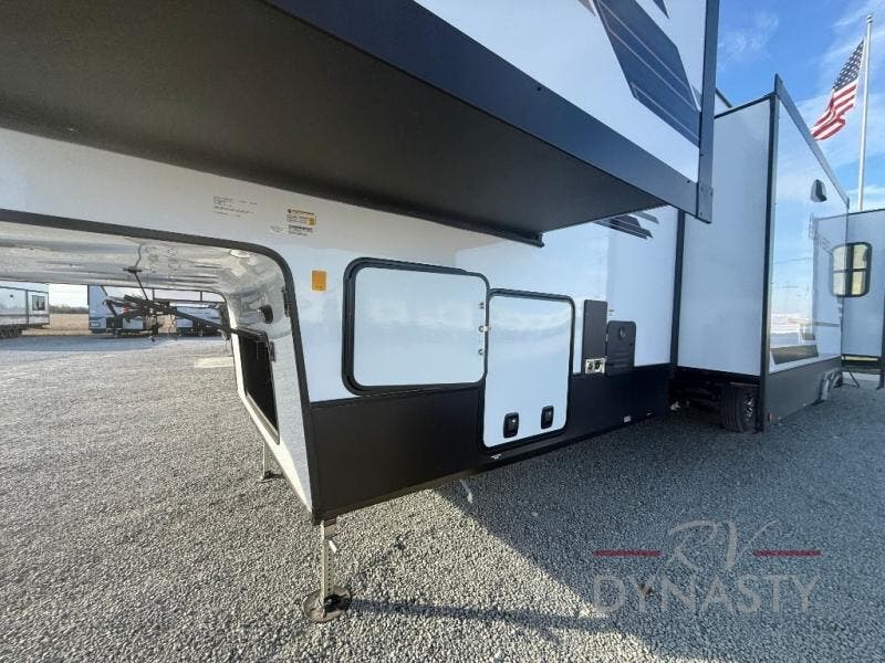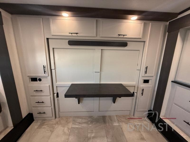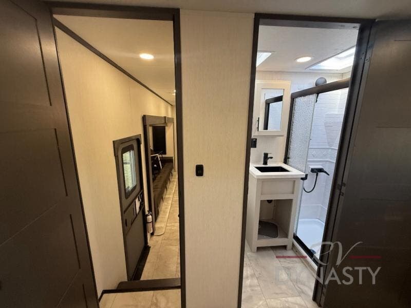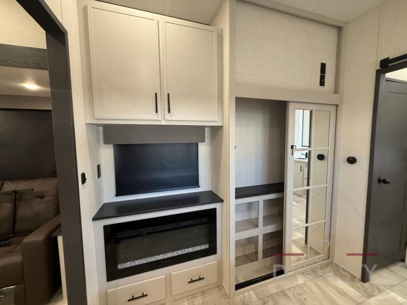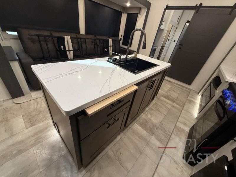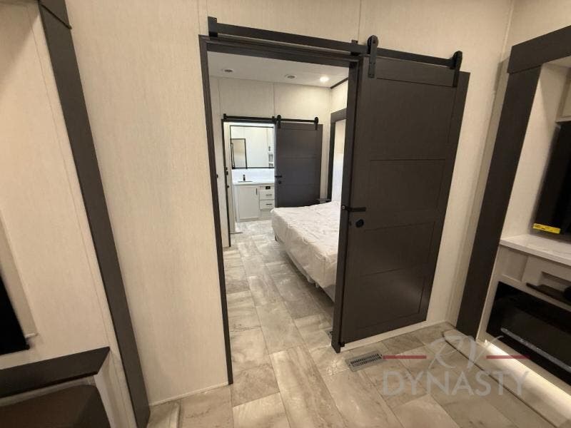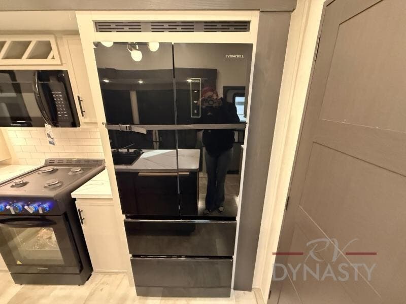 This fifth wheel offers a highly versatile layout designed to adapt to your lifestyle. The front bedroom is a flexible space featuring a sofa on a slide-out and a desk that easily converts into a Murphy bed, making it ideal as a remote office, an extra-sleeping area for guests, or even a cozy living space with a smart TV. A full bathroom is conveniently located nearby for added comfort. In the center of the trailer, you'll find a spacious living area with a five-piece sectional recliner and an expandable dinette to accommodate everyone. The well-equipped kitchen includes essentials like a four-burner range and a French door refrigerator, perfect for cooking up your favorite meals. At the rear, the master bedroom offers a relaxing retreat with a king-sized bed and direct access to a full bathroom featuring a dual vanity, bringing the comforts of home wherever you go.
