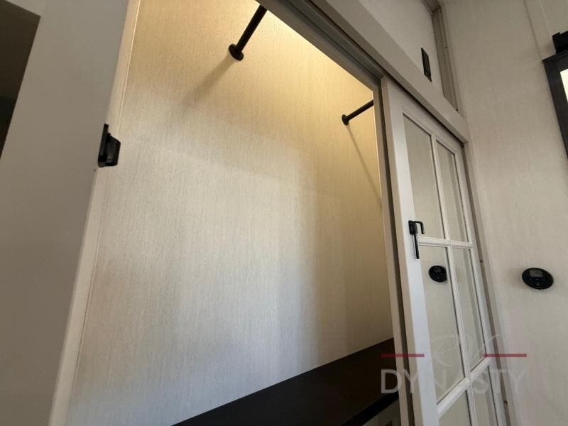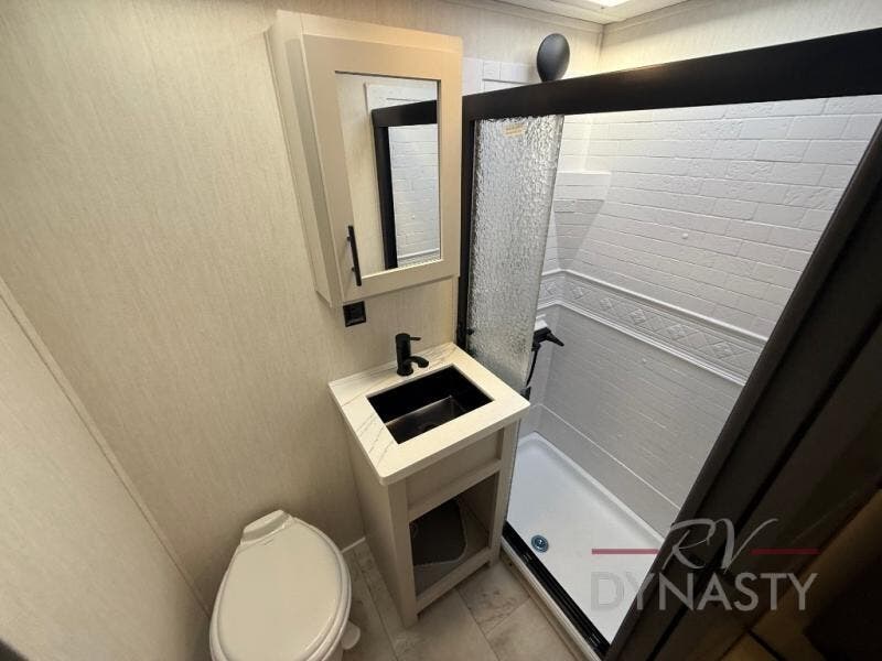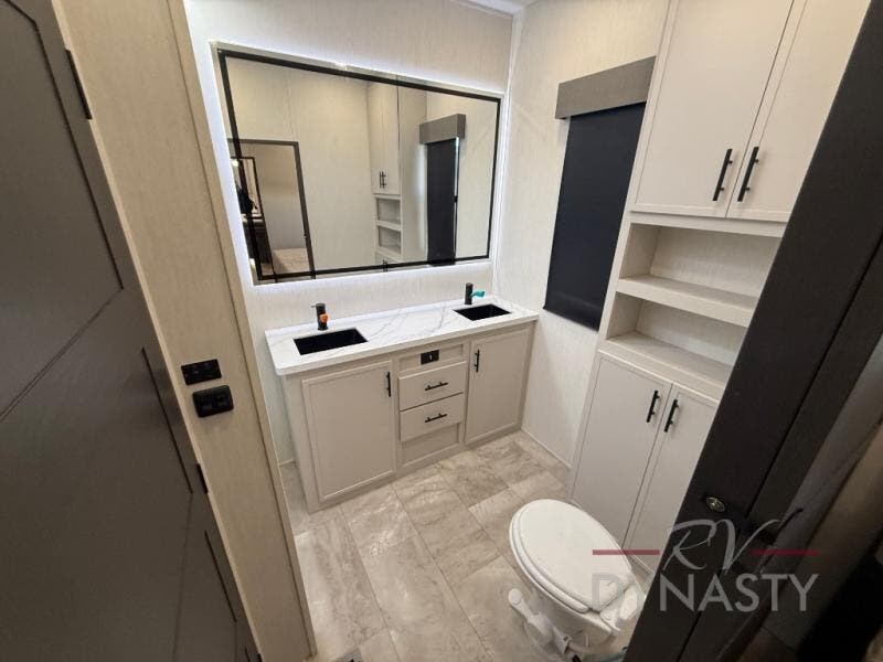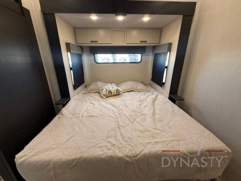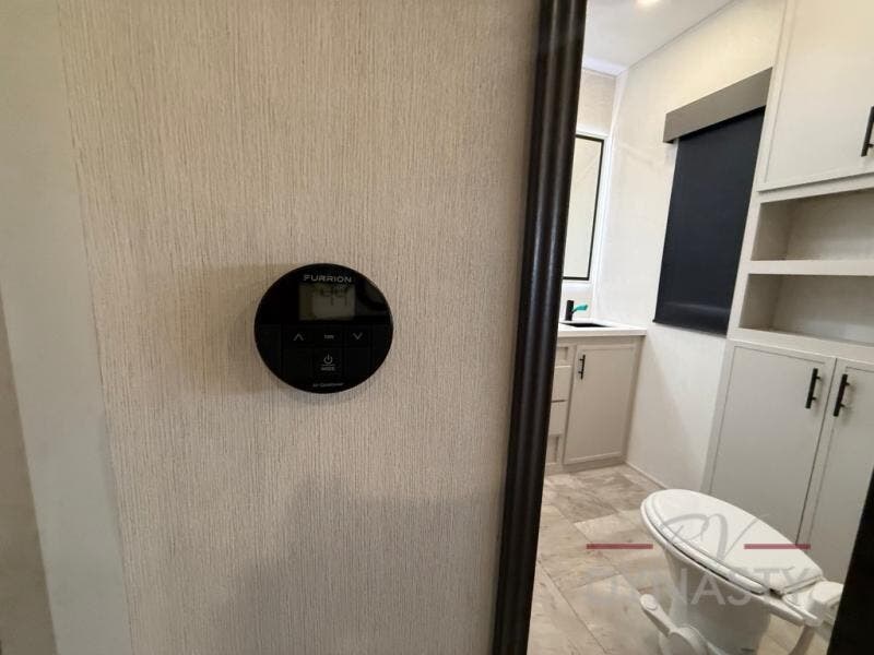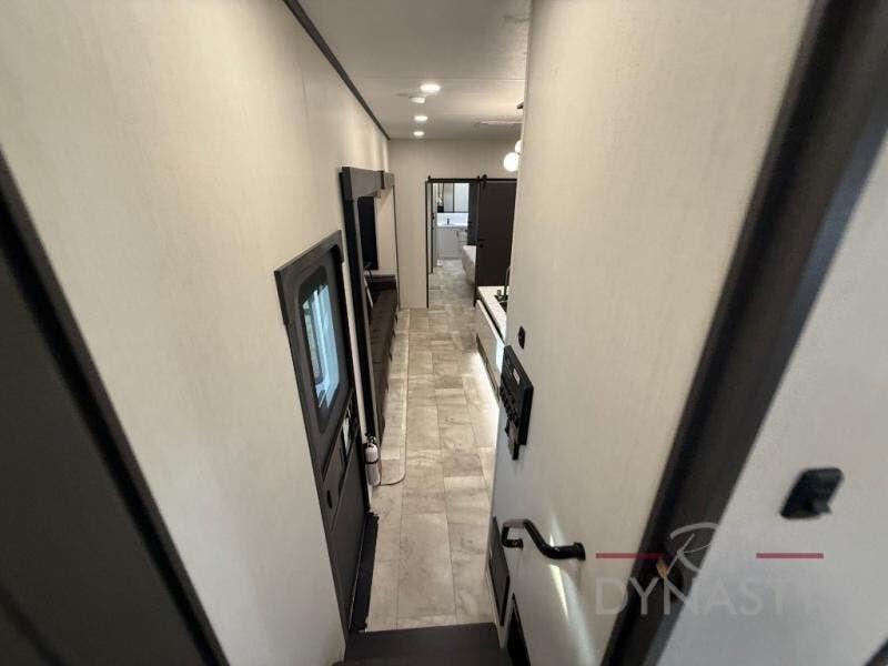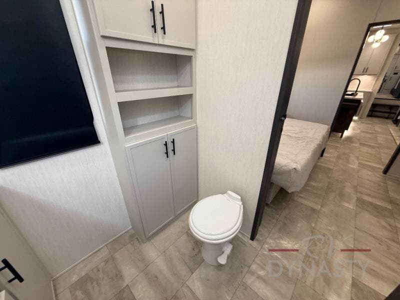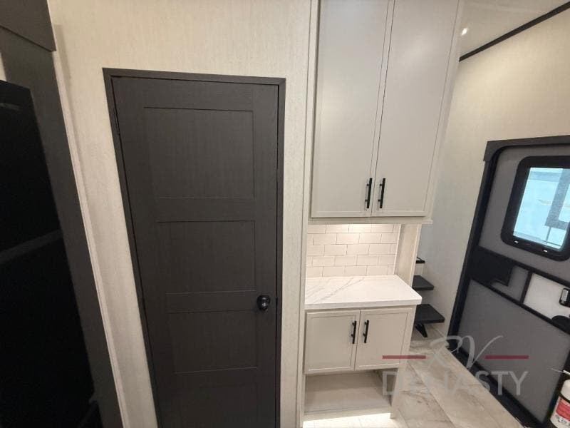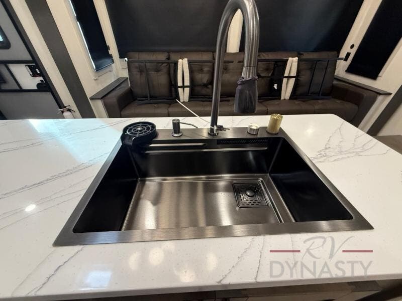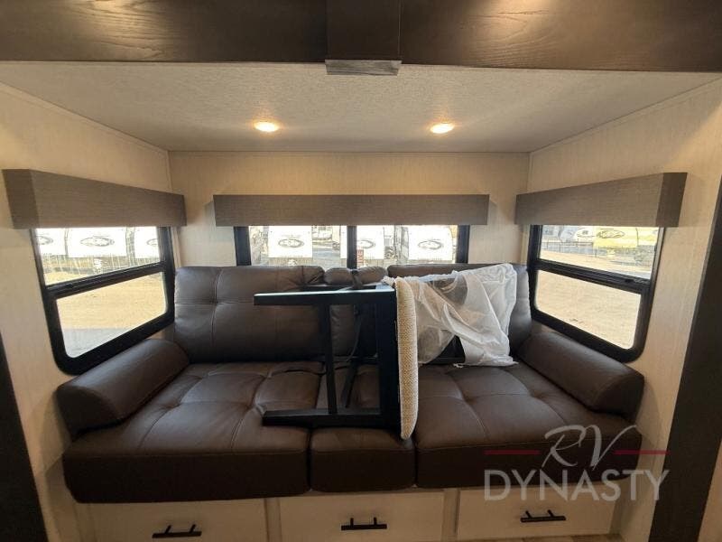 This fifth wheel offers a highly versatile layout designed to adapt to your lifestyle. The front bedroom is a flexible space featuring a sofa on a slide-out and a desk that easily converts into a Murphy bed, making it ideal as a remote office, an extra-sleeping area for guests, or even a cozy living space with a smart TV. A full bathroom is conveniently located nearby for added comfort. In the center of the trailer, you'll find a spacious living area with a five-piece sectional recliner and an expandable dinette to accommodate everyone. The well-equipped kitchen includes essentials like a four-burner range and a French door refrigerator, perfect for cooking up your favorite meals. At the rear, the master bedroom offers a relaxing retreat with a king-sized bed and direct access to a full bathroom featuring a dual vanity, bringing the comforts of home wherever you go.