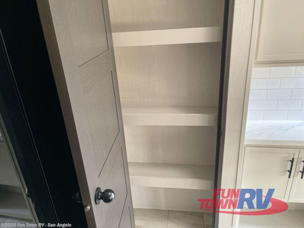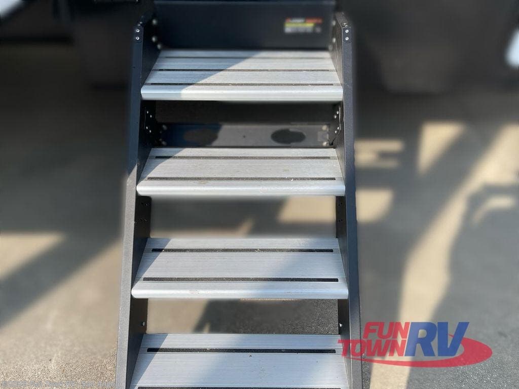 This fifth wheel offers a highly versatile layout designed to adapt to your lifestyle. The front bedroom is a flexible space featuring a sofa on a slide-out and a desk that easily converts into a Murphy bed, making it ideal as a remote office, an extra-sleeping area for guests, or even a cozy living space with a smart TV. A full bathroom is conveniently located nearby for added comfort. In the center of the trailer, you'll find a spacious living area with a five-piece sectional recliner and an expandable dinette to accommodate everyone. The well-equipped kitchen includes essentials like a four-burner range and a French door refrigerator, perfect for cooking up your favorite meals. At the rear, the master bedroom offers a relaxing retreat with a king-sized bed and direct access to a full bathroom featuring a dual vanity, bringing the comforts of home wherever you go.
