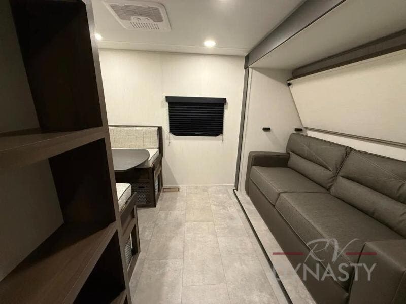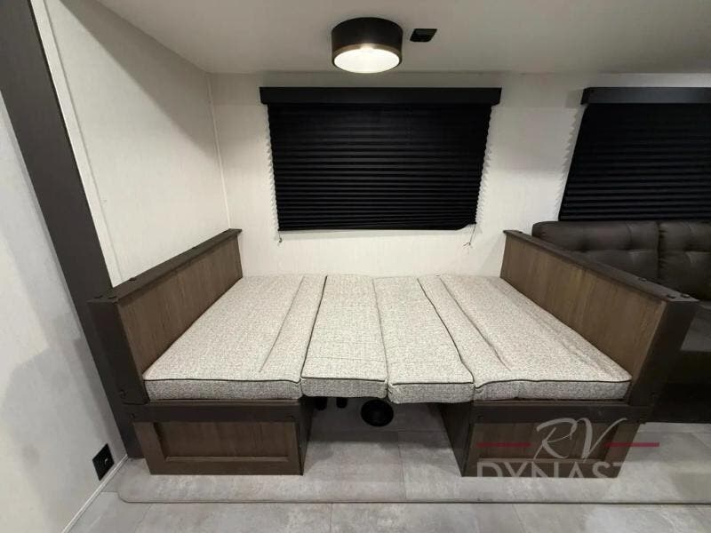 This couple's trailer is perfect for weekend trips to the lake! You'll love waking up each morning on the front queen bed instead of on an air mattress, plus there are overhead cabinets and a wardrobe for your things. The theater seating provides a place for you to relax in the evenings, and the bartop with two stools will be the perfect place to dine together. Making meals will be easier than ever with a three burner cooktop and microwave oven, plus there is a refrigerator and pantry for food storage. And don't overlook the exterior with its pass-thru storage and 15' awning!