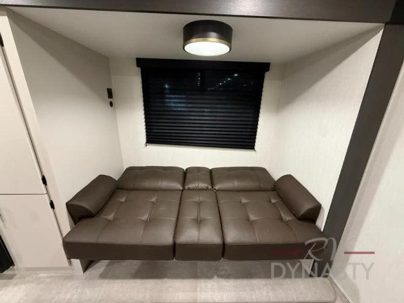 This travel trailer's modern rear kitchen is equipped with a reliable fridge, well-stocked pantry, and stylish hutch, making meal prep and storage a snap. The versatile jackknife sofa provides additional sleeping space or a cozy spot to unwind, while the intimate booth dinette is perfect for sharing meals or stories with loved ones. The crisp high-definition smart TV is ideal for entertainment on the go, and the practical walk-thru bathroom provides easy access. The serene front bedroom is a peaceful retreat, featuring a comfortable king bed, functional linen closet, spacious wardrobes, and ample overhead cabinets for storing your essentials. One of the standout features of this trailer is the two entry/exit doors, providing added convenience and flexibility.