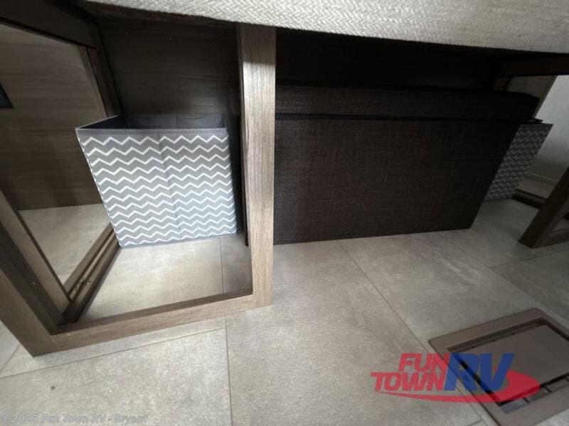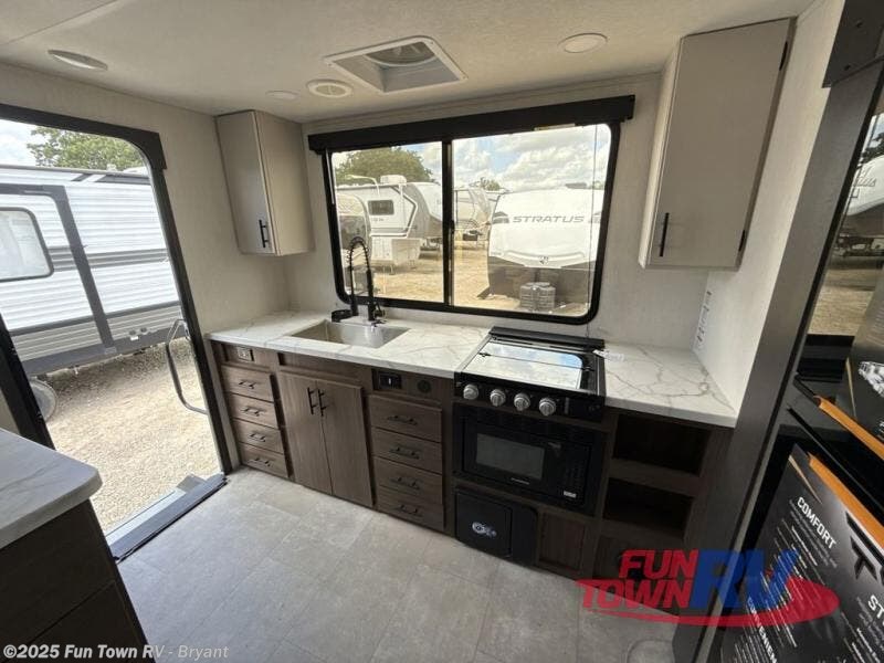 This travel trailer's modern rear kitchen is equipped with a reliable fridge, well-stocked pantry, and stylish hutch, making meal prep and storage a snap. The versatile jackknife sofa provides additional sleeping space or a cozy spot to unwind, while the intimate booth dinette is perfect for sharing meals or stories with loved ones. The crisp high-definition smart TV is ideal for entertainment on the go, and the practical walk-thru bathroom provides easy access. The serene front bedroom is a peaceful retreat, featuring a comfortable king bed, functional linen closet, spacious wardrobes, and ample overhead cabinets for storing your essentials. One of the standout features of this trailer is the two entry/exit doors, providing added convenience and flexibility.