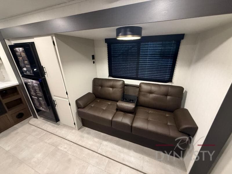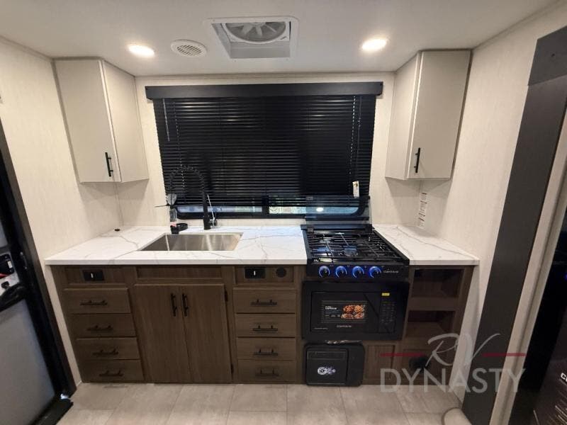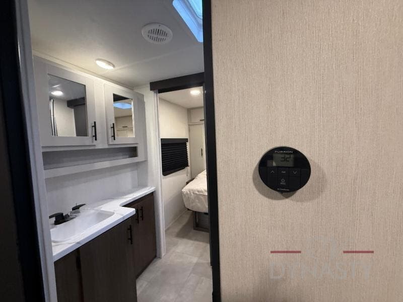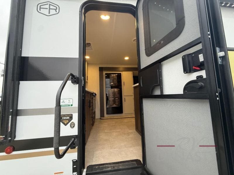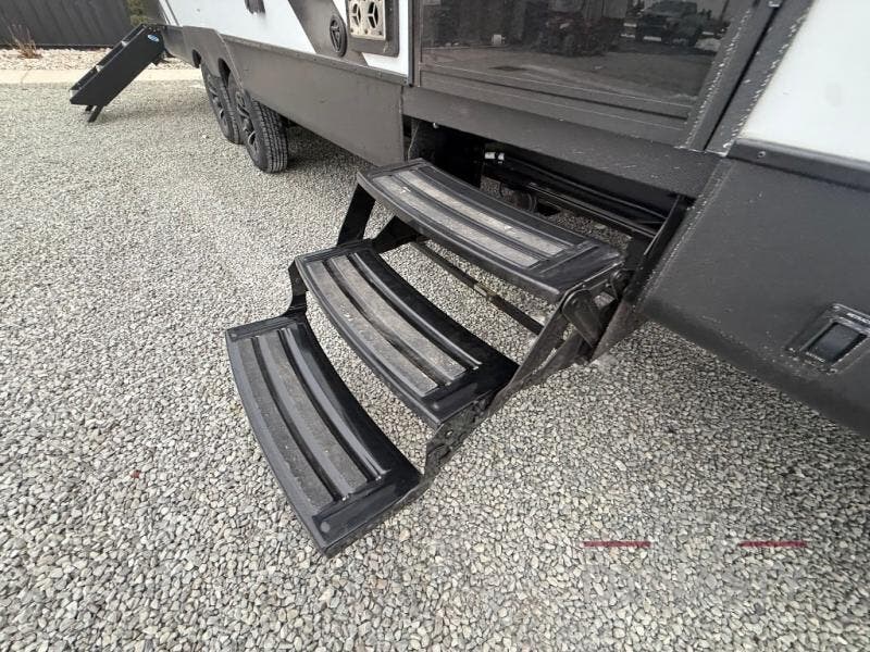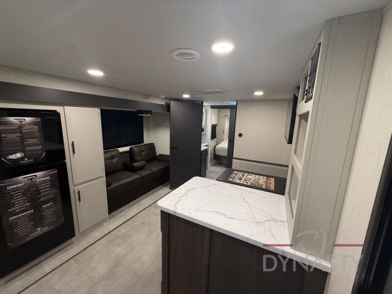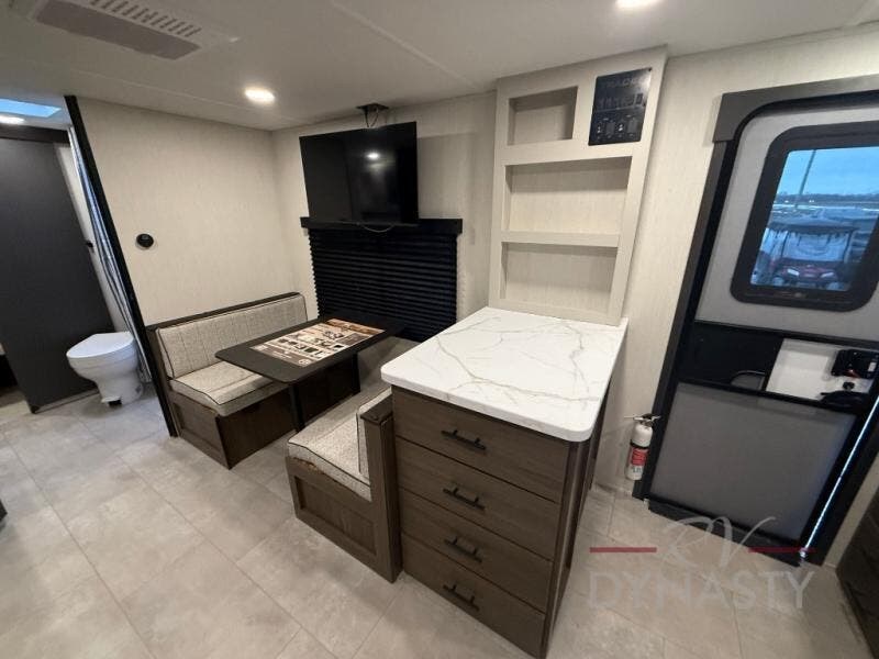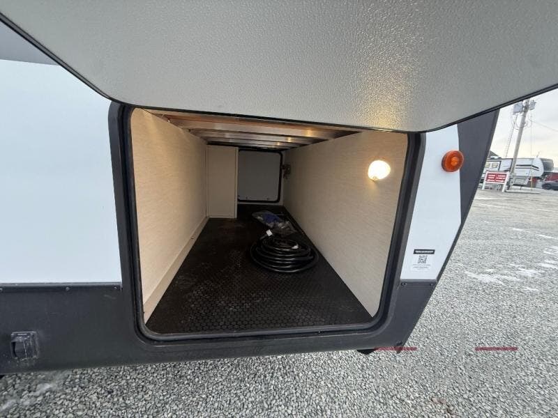 This travel trailer's modern rear kitchen is equipped with a reliable fridge, well-stocked pantry, and stylish hutch, making meal prep and storage a snap. The versatile jackknife sofa provides additional sleeping space or a cozy spot to unwind, while the intimate booth dinette is perfect for sharing meals or stories with loved ones. The crisp high-definition smart TV is ideal for entertainment on the go, and the practical walk-thru bathroom provides easy access. The serene front bedroom is a peaceful retreat, featuring a comfortable king bed, functional linen closet, spacious wardrobes, and ample overhead cabinets for storing your essentials. One of the standout features of this trailer is the two entry/exit doors, providing added convenience and flexibility.