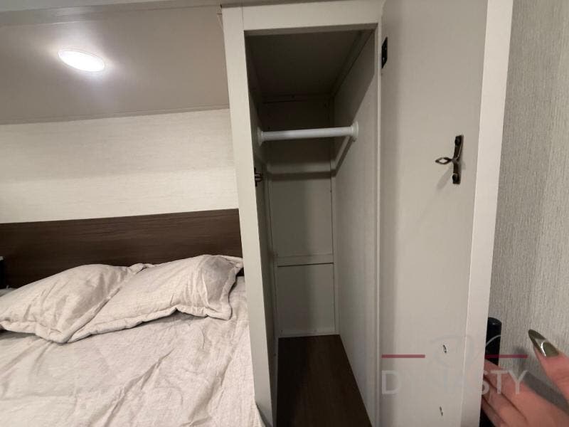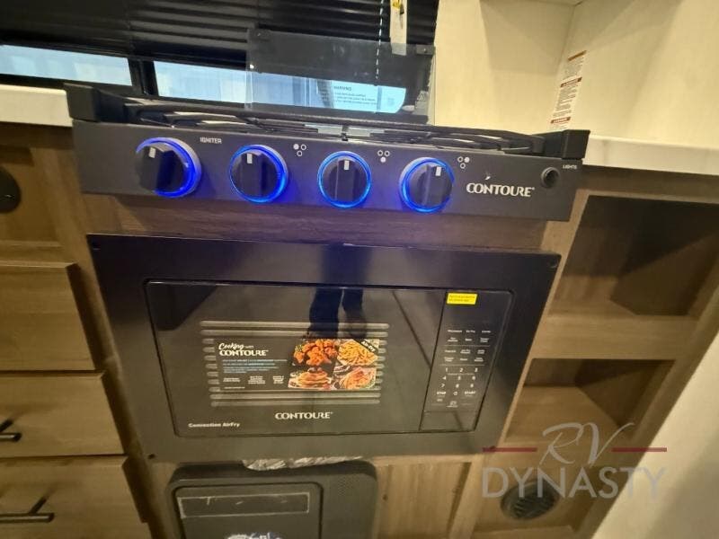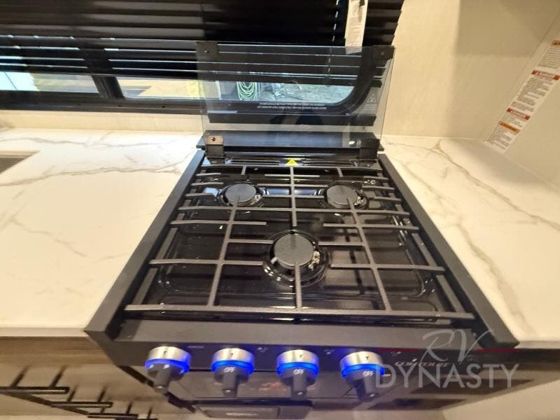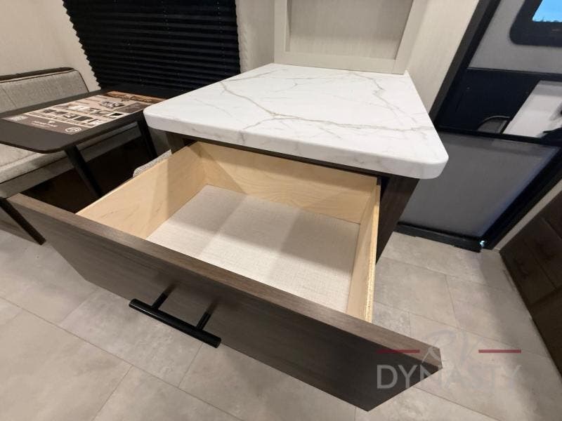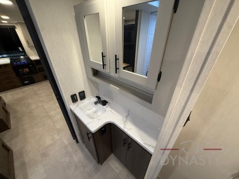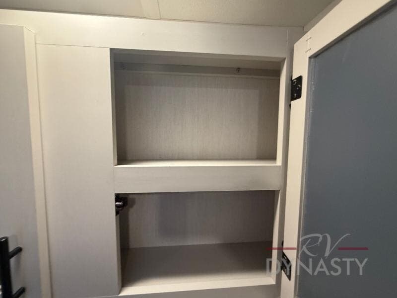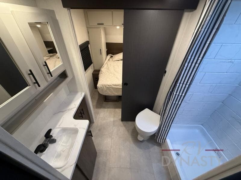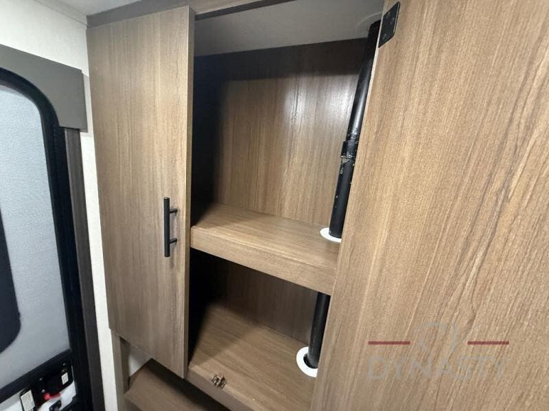 This travel trailer's modern rear kitchen is equipped with a reliable fridge, well-stocked pantry, and stylish hutch, making meal prep and storage a snap. The versatile jackknife sofa provides additional sleeping space or a cozy spot to unwind, while the intimate booth dinette is perfect for sharing meals or stories with loved ones. The crisp high-definition smart TV is ideal for entertainment on the go, and the practical walk-thru bathroom provides easy access. The serene front bedroom is a peaceful retreat, featuring a comfortable king bed, functional linen closet, spacious wardrobes, and ample overhead cabinets for storing your essentials. One of the standout features of this trailer is the two entry/exit doors, providing added convenience and flexibility.