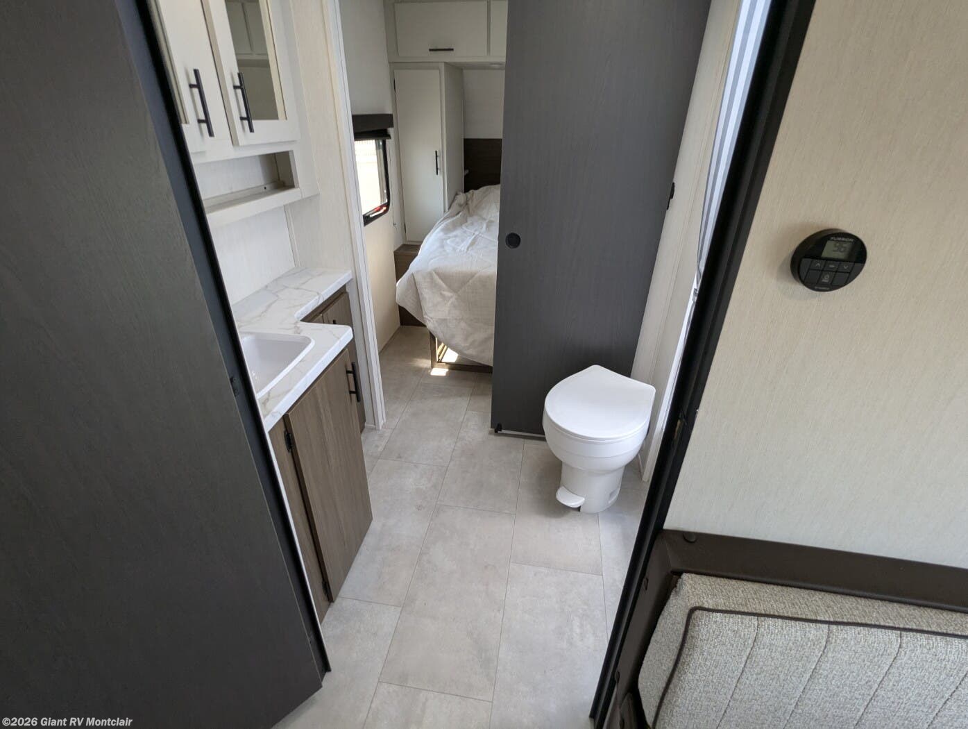 Modern Amenities: Includes a 68 gal. gray water tank, 12V refrigerator, and exterior speakers for convenience.