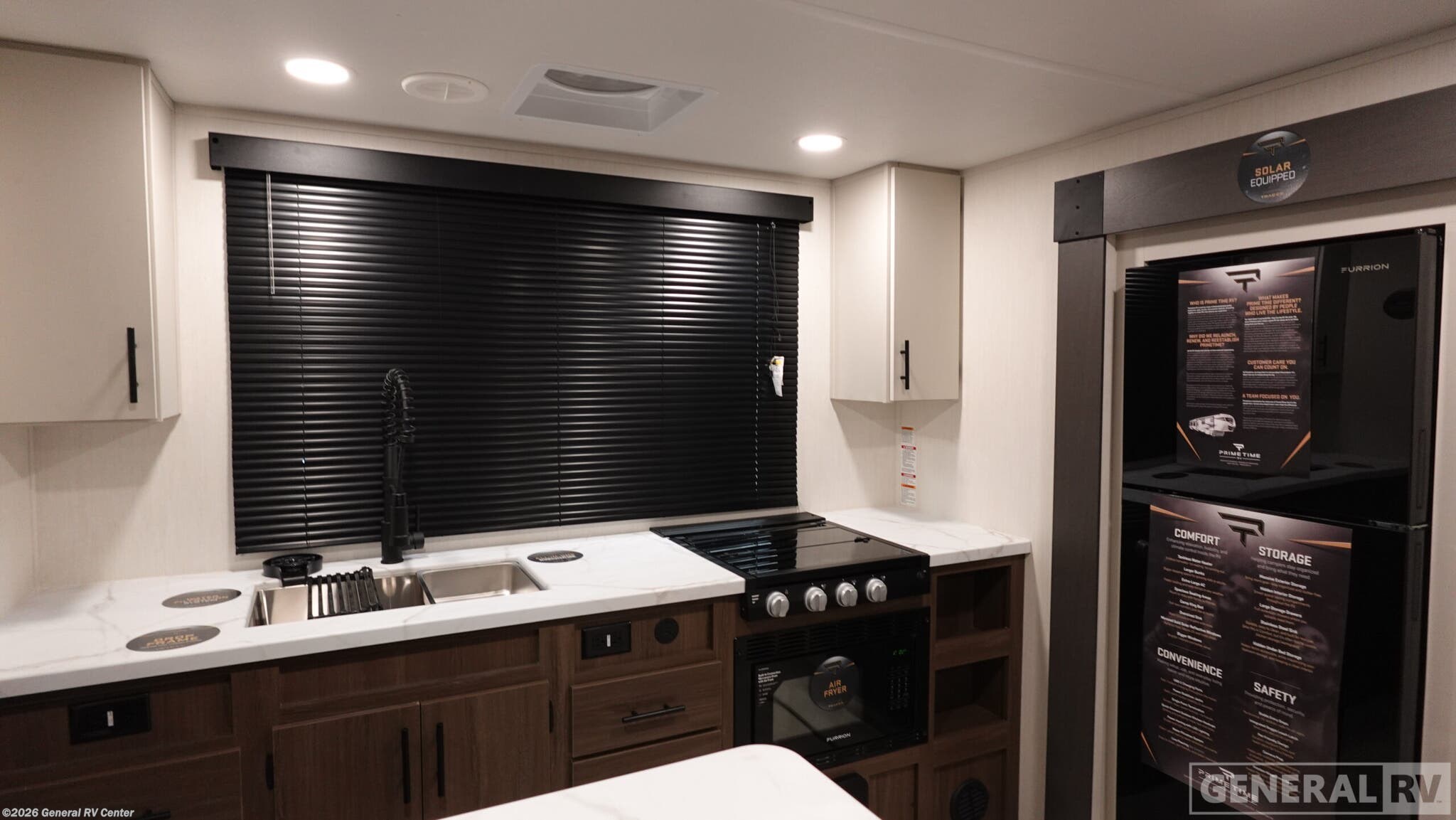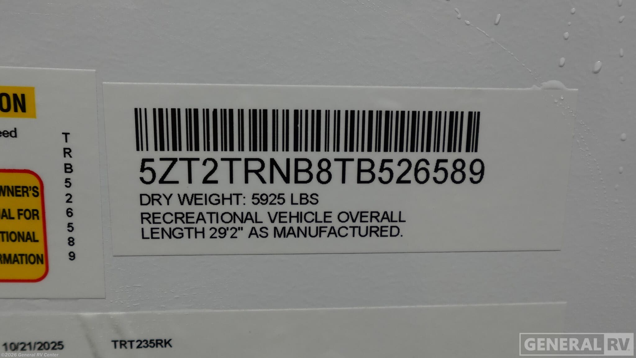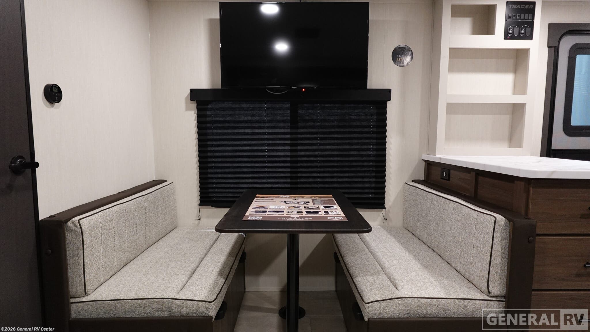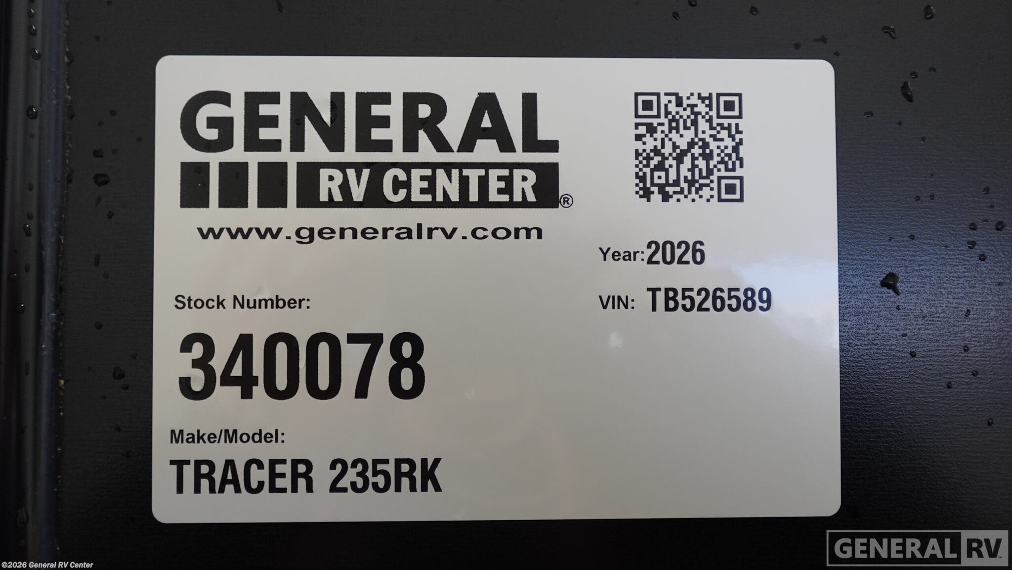 Experience the perfect blend of comfort and adventure with the 2026 Prime Time Tracer 235RK. This thoughtfully designed RV is your ticket to unforgettable journeys, offering a spacious and inviting interior that sleeps up to four. The heart of this model is its rear kitchen, complete with an air fryer cooktop and ample storage, making meal prep a breeze while you're on the road. The cozy jackknife sofa and dinette provide the perfect spots to unwind after a day of exploring, with large windows allowing natural light to fill the space. Retreat to the private bedroom, where a luxurious camp king bed awaits, surrounded by generous wardrobe and overhead storage. The bathroom is well-appointed, ensuring you have all the comforts of home wherever you go. With a single slide-out, this RV maximizes living space without sacrificing mobility. The 29-foot length and sleek design make it easy to tow and park, while the 42-gallon fresh water capacity ensures you're ready for extended stays in the great outdoors. Discover the freedom of the open road with the Tracer 235RK, and let every journey become a cherished memory. For more details, visit your nearest General RV dealership.
