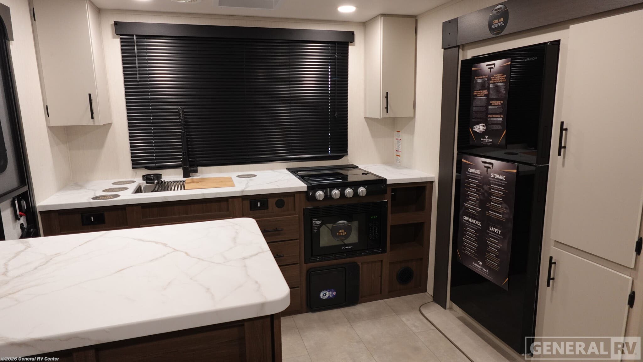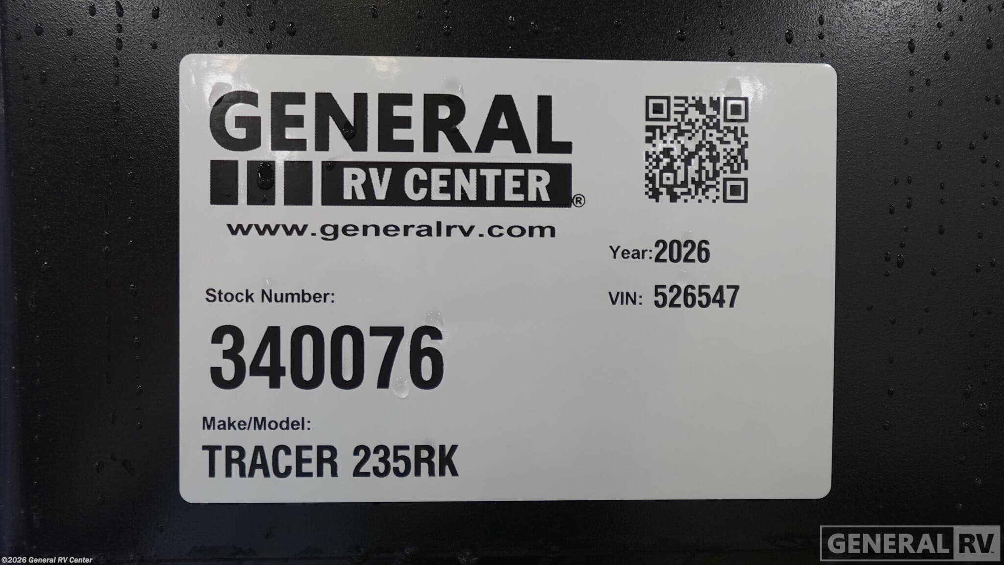 Experience the perfect blend of comfort and adventure with the 2026 Prime Time Tracer 235RK. This thoughtfully designed RV is your ticket to unforgettable journeys, offering a spacious and inviting interior that sleeps up to four. The heart of this model is its rear kitchen, complete with an air fryer cooktop and ample storage, making meal prep a breeze while you're on the road. The cozy jackknife sofa and dinette provide the perfect spots to unwind after a day of exploring, with large windows allowing natural light to fill the space. Retreat to the private bedroom, where a luxurious camp king bed awaits, surrounded by generous wardrobe and overhead storage. The bathroom is well-appointed, ensuring you have all the comforts of home wherever you go. With a single slide-out, this RV maximizes living space without sacrificing mobility. The 29-foot length and sleek design make it easy to tow and park, while the 42-gallon fresh water capacity ensures you're ready for extended stays in the great outdoors. Discover the freedom of the open road with the Tracer 235RK, and let every journey become a cherished memory. For more details, visit your nearest General RV dealership.