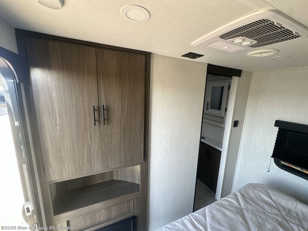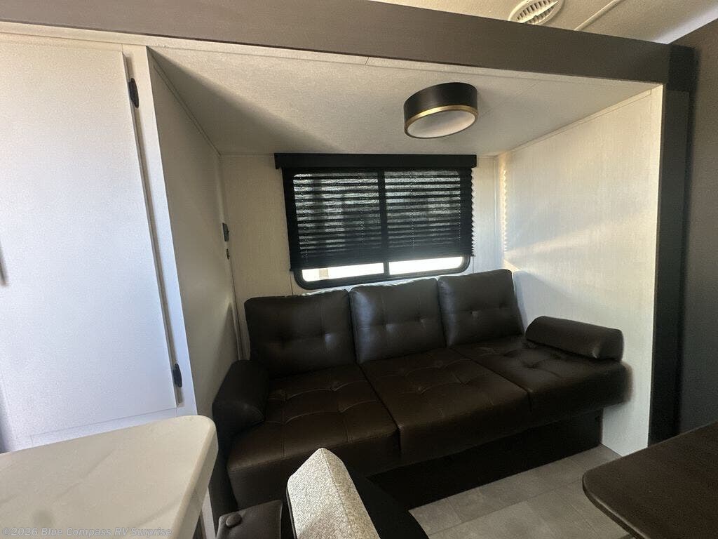 This travel trailer's modern rear kitchen is equipped with a reliable fridge, well-stocked pantry, and stylish hutch, making meal prep and storage a snap. The versatile jackknife sofa provides additional sleeping space or a cozy spot to unwind, while the intimate booth dinette is perfect for sharing meals or stories with loved ones. The crisp high-definition smart TV is ideal for entertainment on the go, and the practical walk-thru bathroom provides easy access. The serene front bedroom is a peaceful retreat, featuring a comfortable king bed, functional linen closet, spacious wardrobes, and ample overhead cabinets for storing your essentials. One of the standout features of this trailer is the two entry/exit doors, providing added convenience and flexibility.