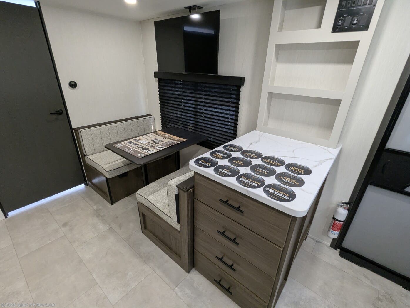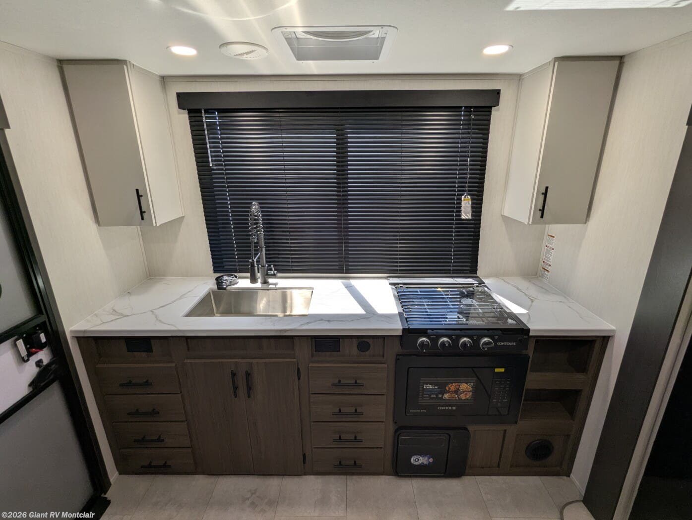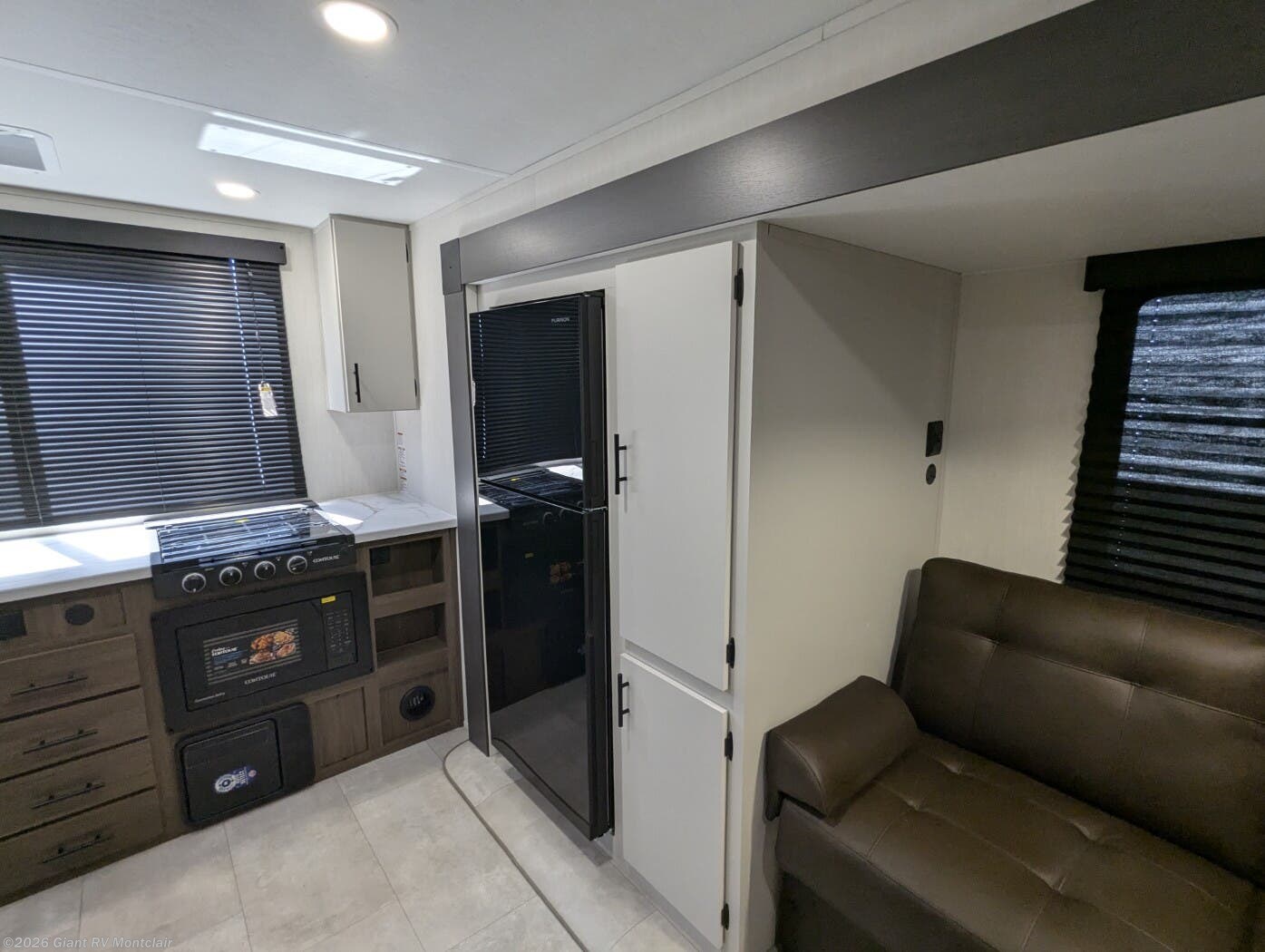 Rear Kitchen Excellence: Sleeps up to 4 with a spacious rear kitchen featuring ample counter space, pantry, and a large slideout that opens the living area with U-shaped dinette for meals and lounging.