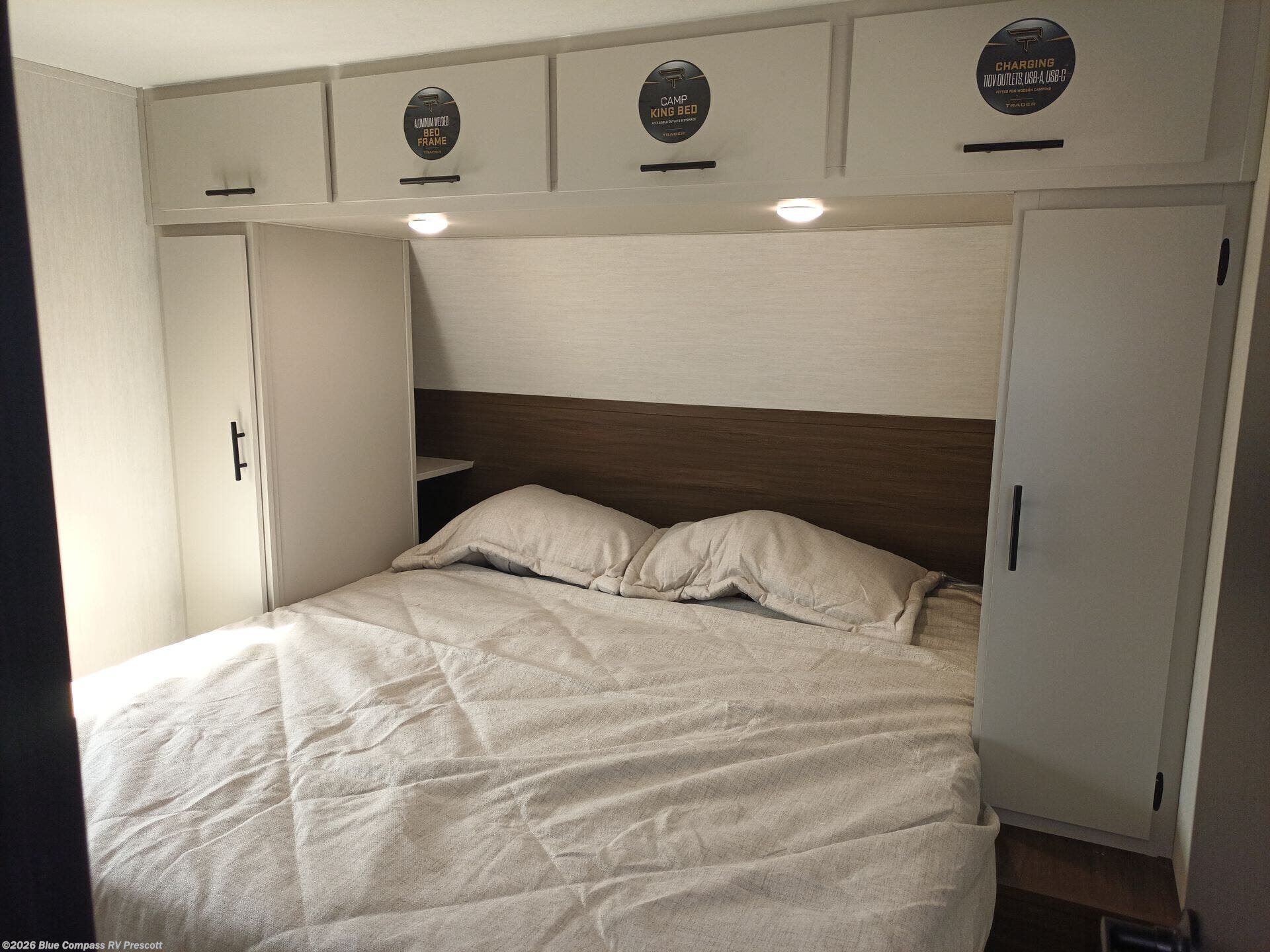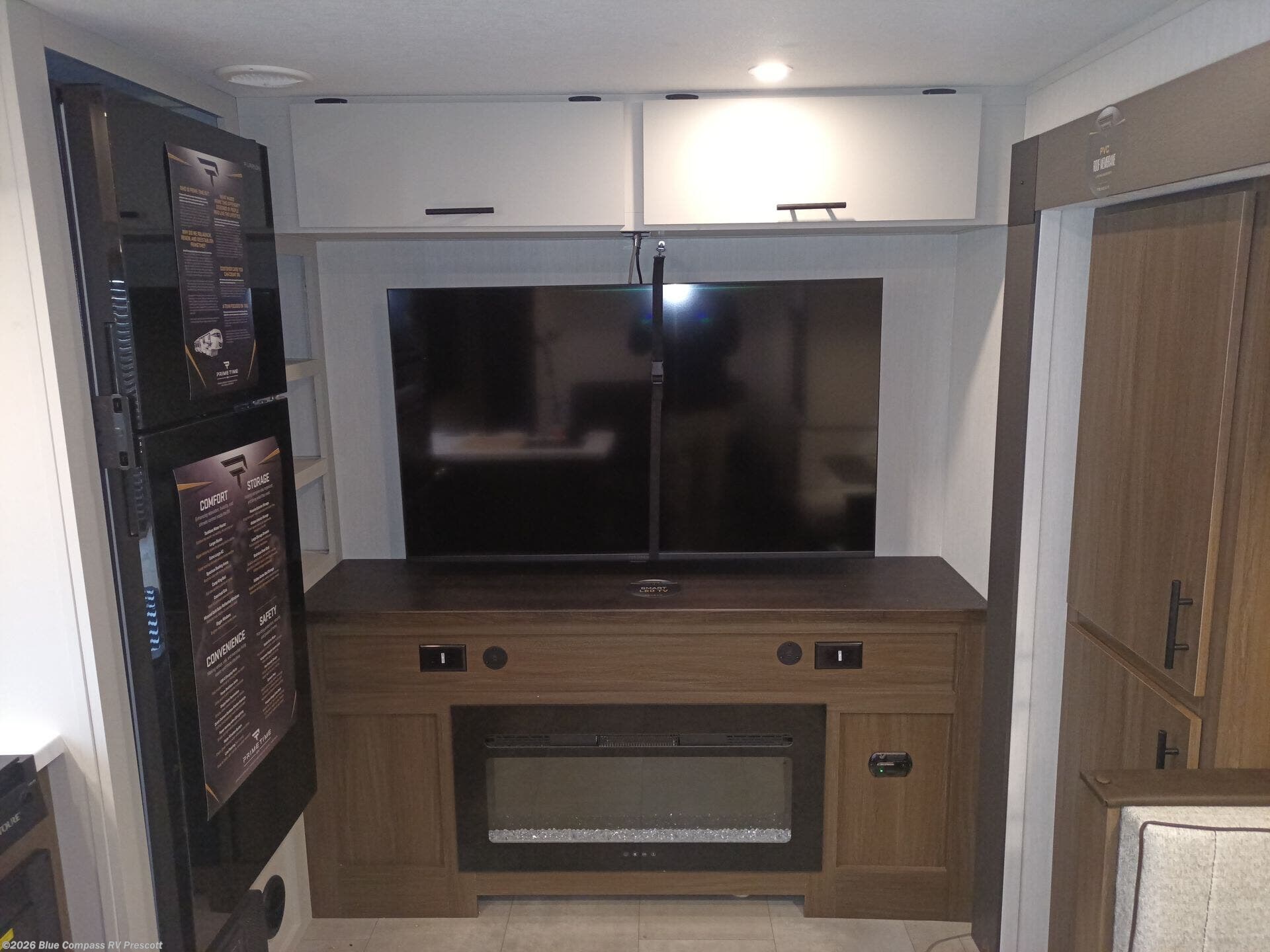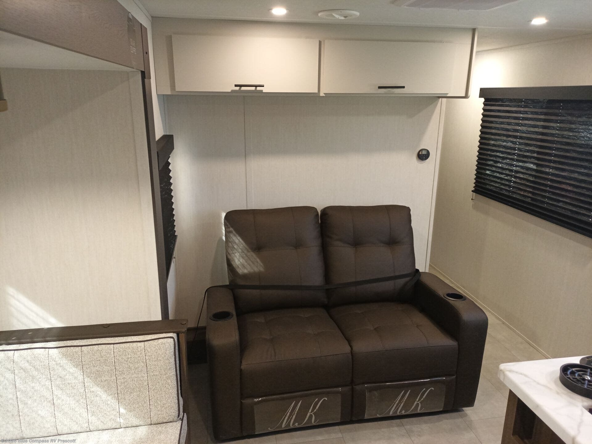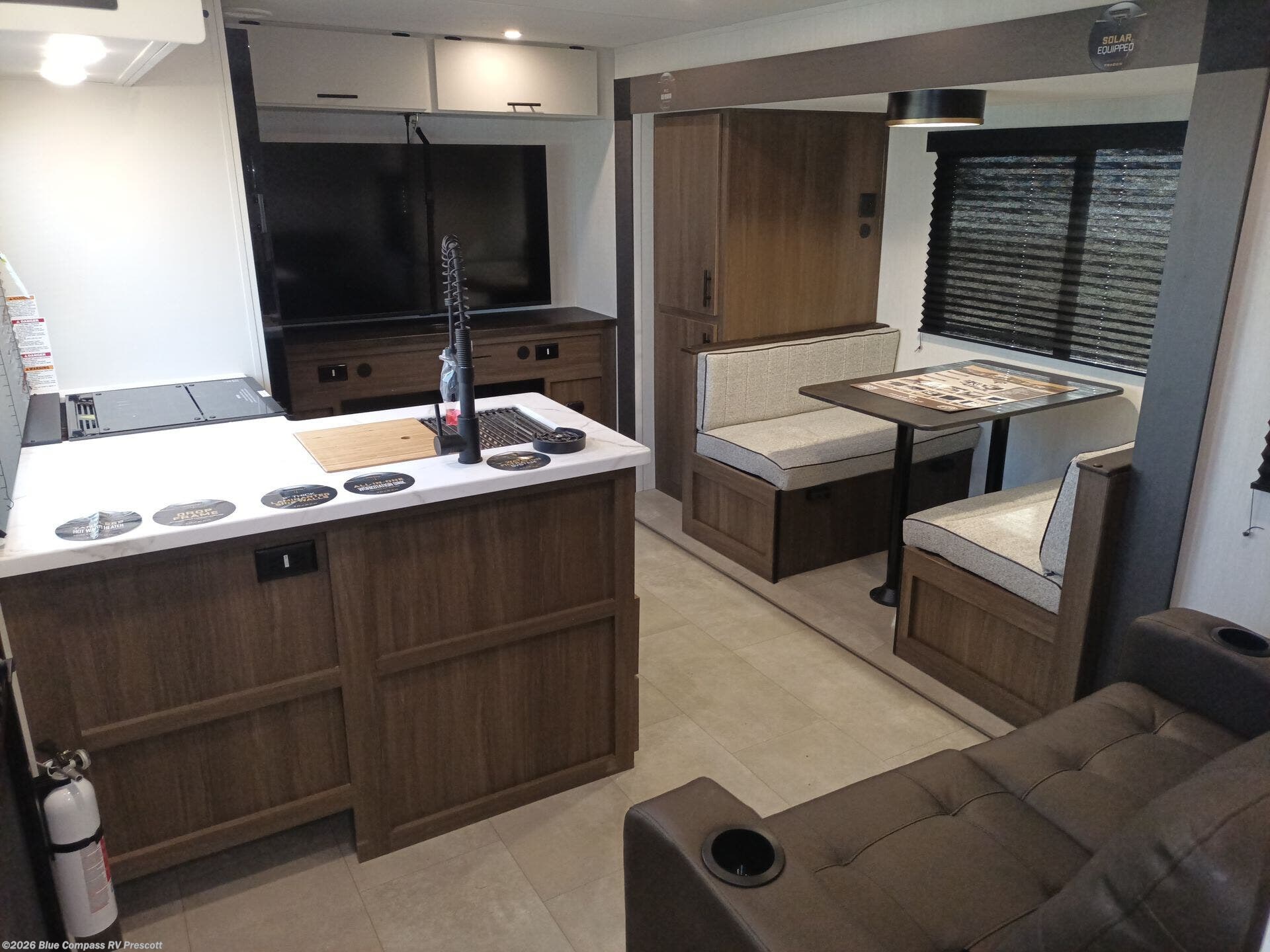 This travel trailer's modern rear kitchen is equipped with a reliable fridge, well-stocked pantry, and even a fireplace, making meal prep and cooking a great experience. The theater seating offers a cozy spot to unwind, while the dinette is perfect for sharing meals or stories with loved ones. The air fryer cooktop will also be useful for some easy delicious meals on the go, and the practical full bathroom to freshen up. The serene front bedroom is a peaceful retreat, featuring a comfortable camp king bed, spacious wardrobes, and ample overhead cabinets for storing your essentials.