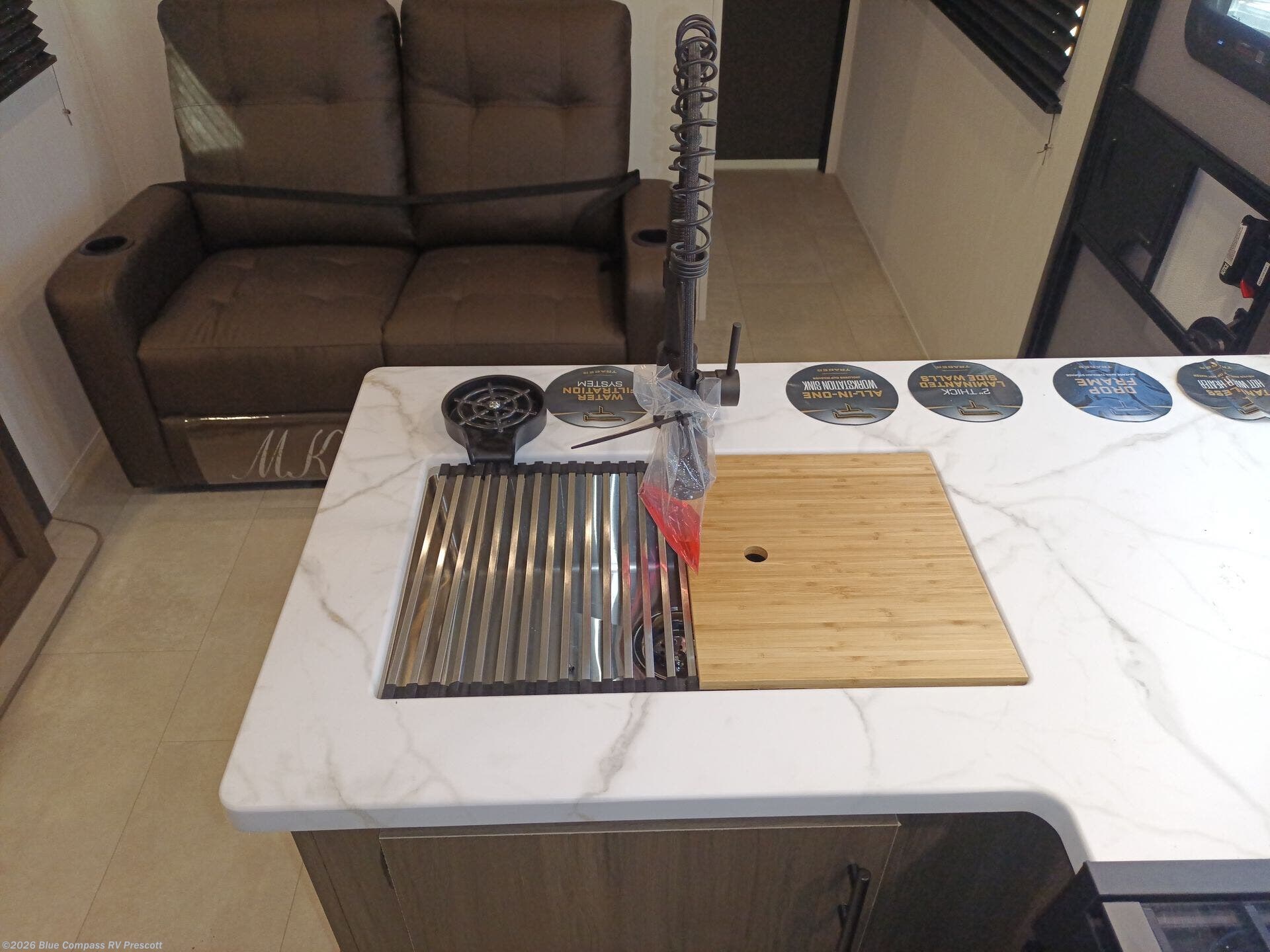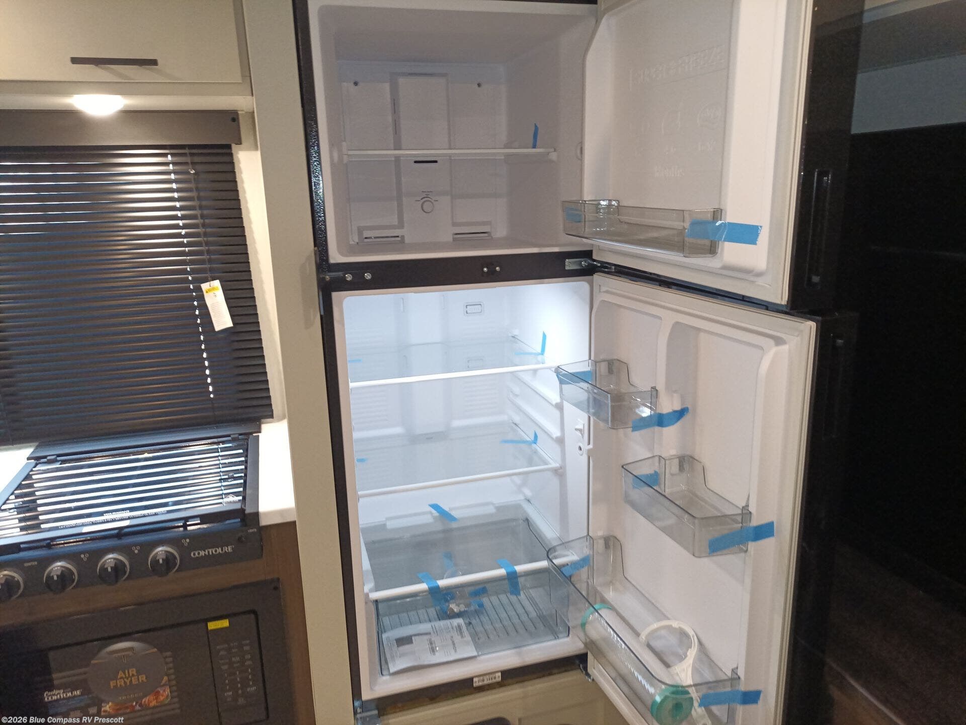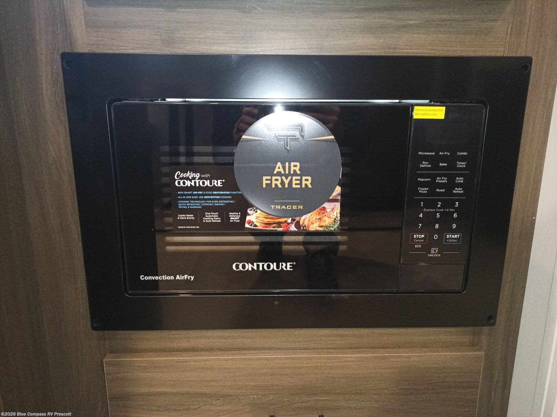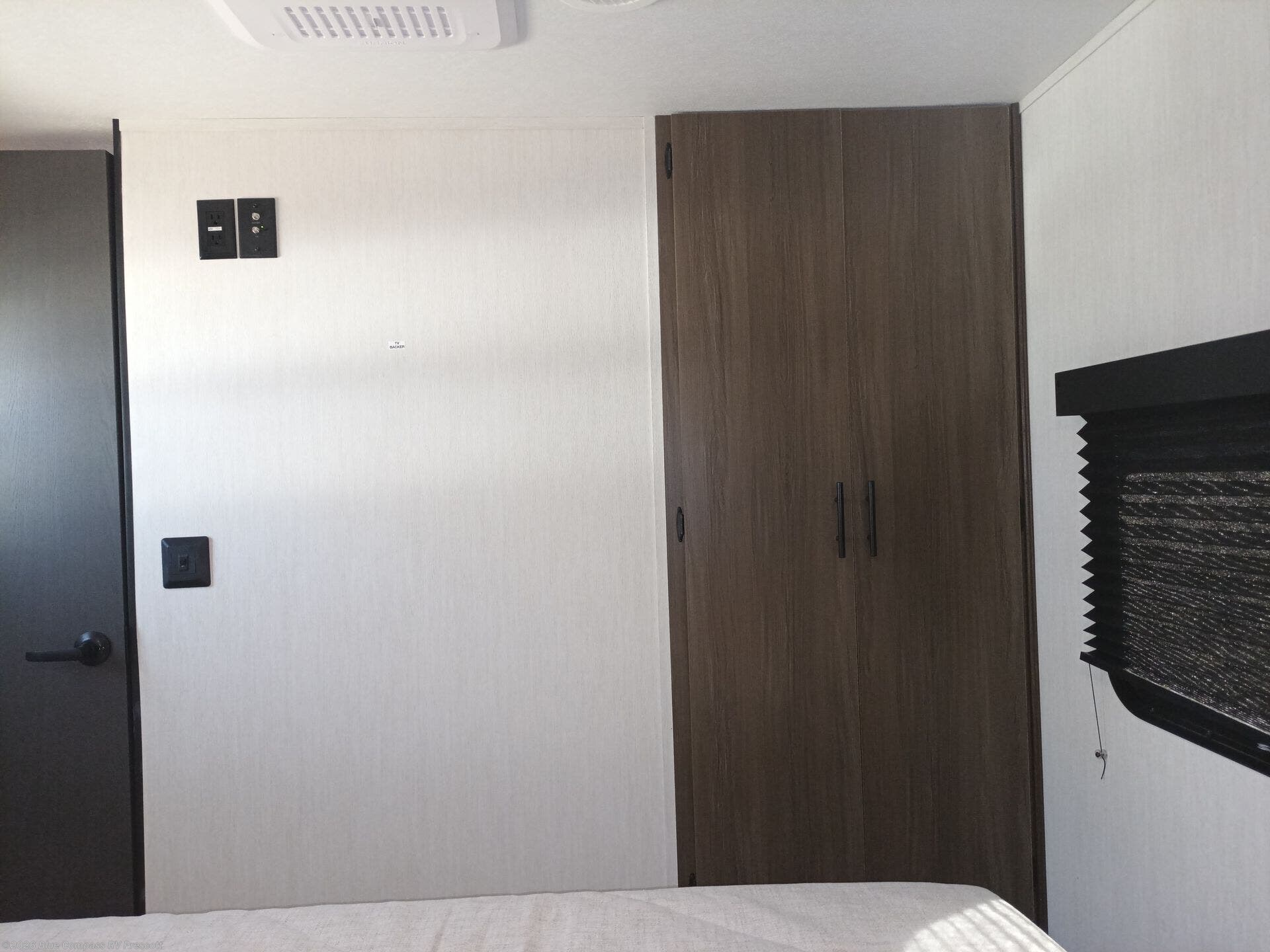 This travel trailer's modern rear kitchen is equipped with a reliable fridge, well-stocked pantry, and even a fireplace, making meal prep and cooking a great experience. The theater seating offers a cozy spot to unwind, while the dinette is perfect for sharing meals or stories with loved ones. The air fryer cooktop will also be useful for some easy delicious meals on the go, and the practical full bathroom to freshen up. The serene front bedroom is a peaceful retreat, featuring a comfortable camp king bed, spacious wardrobes, and ample overhead cabinets for storing your essentials.