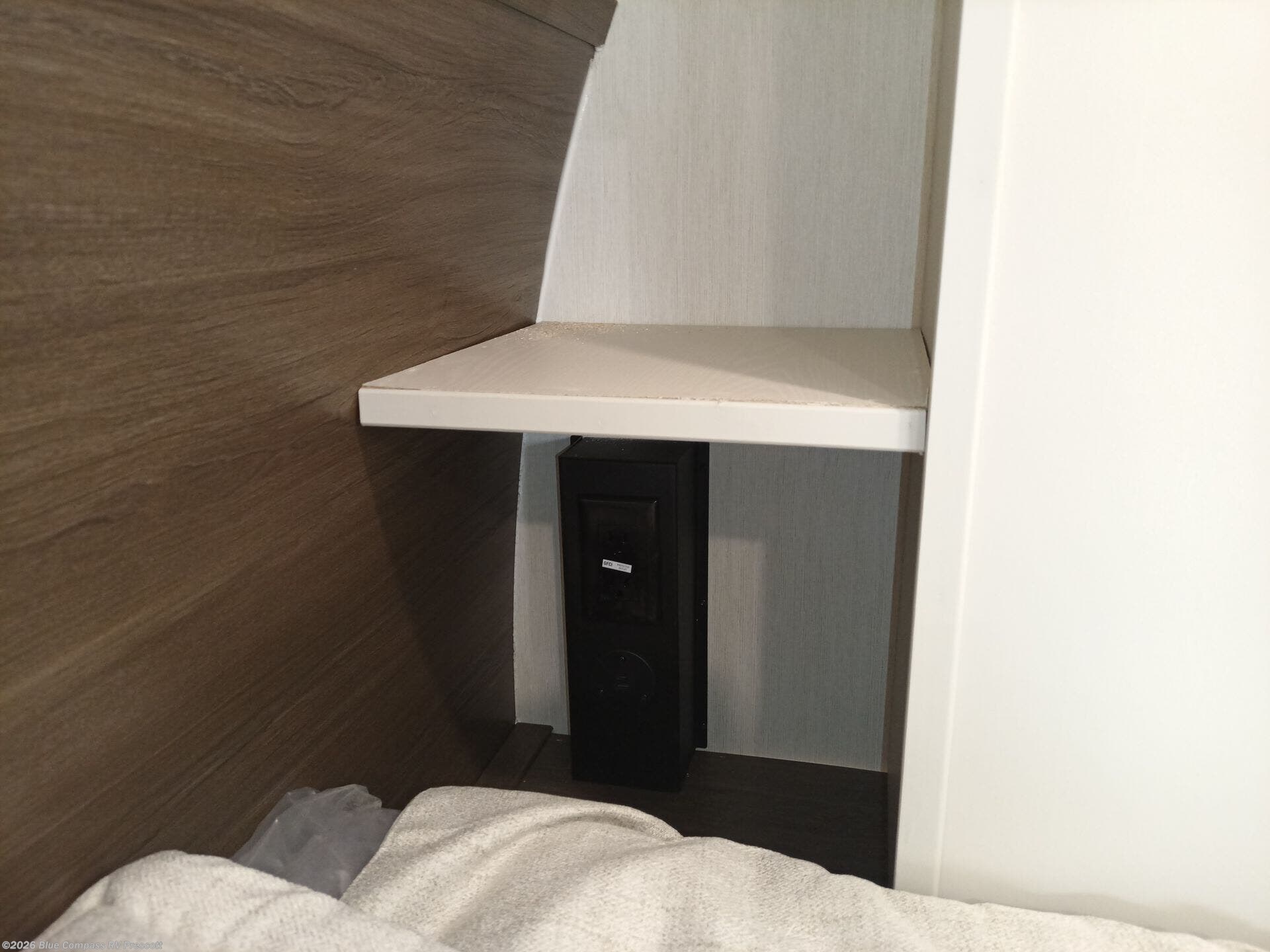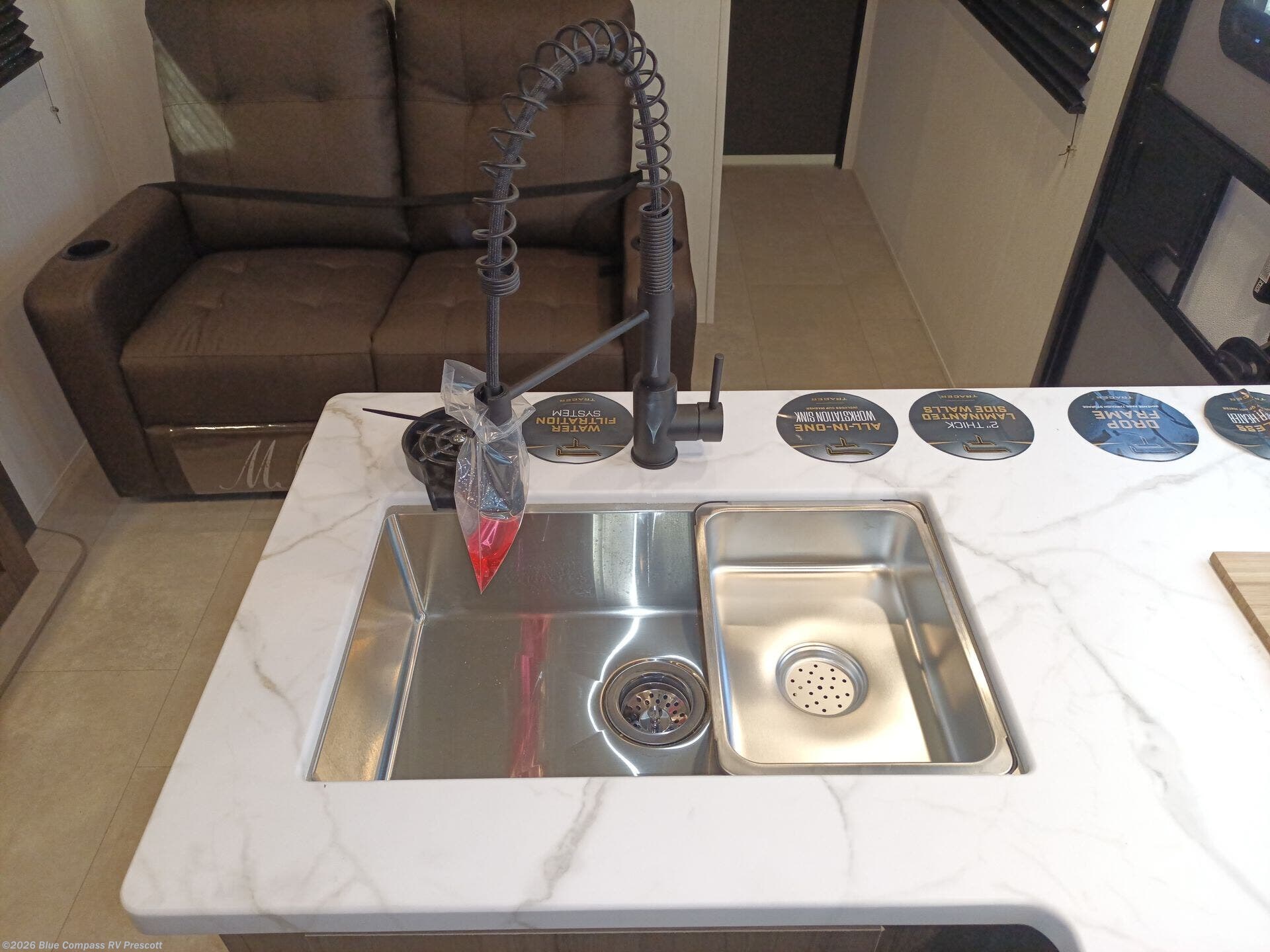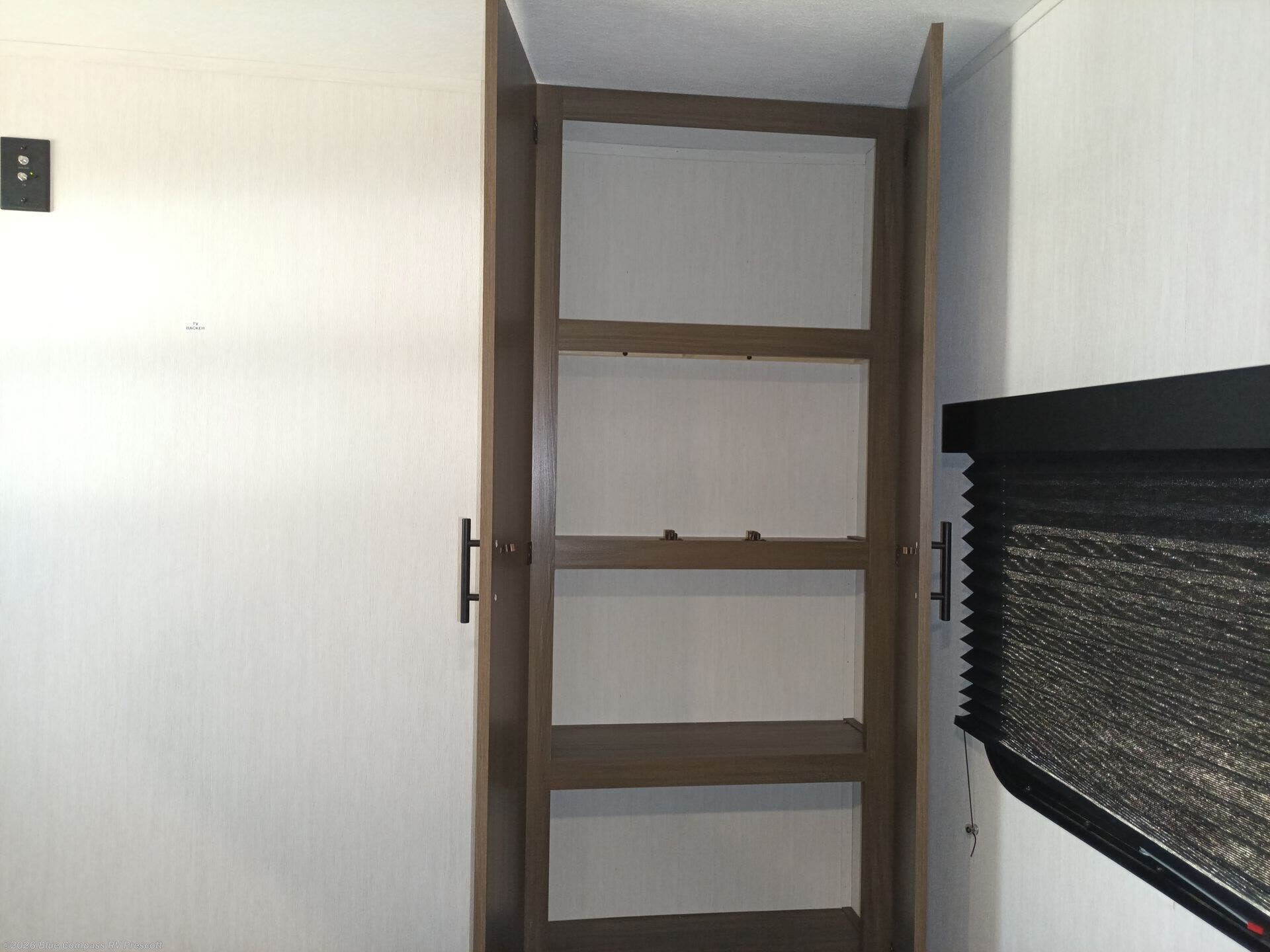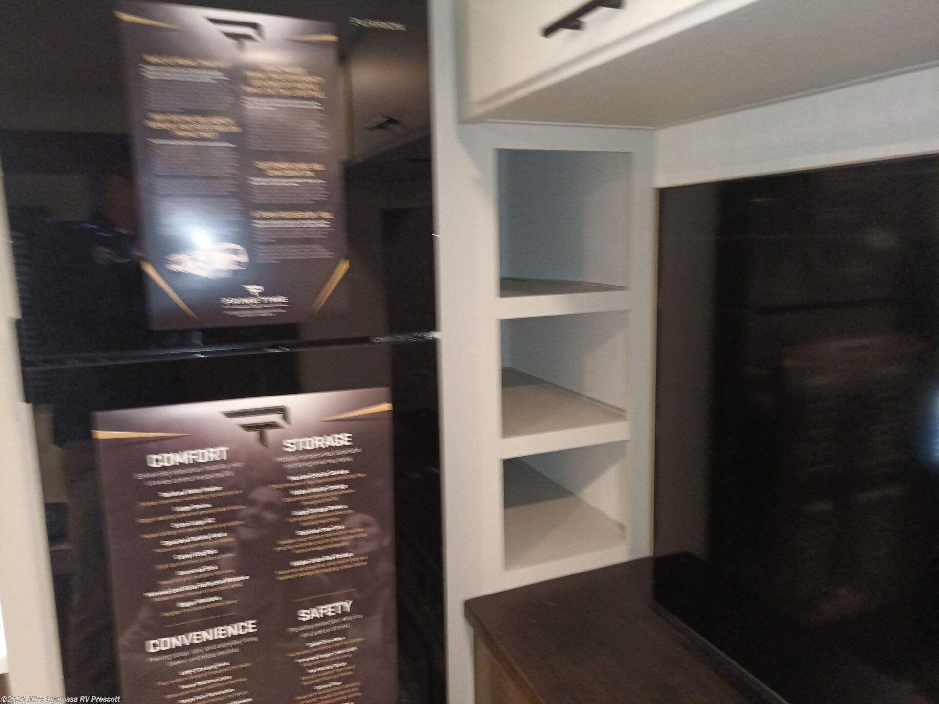 This travel trailer's modern rear kitchen is equipped with a reliable fridge, well-stocked pantry, and even a fireplace, making meal prep and cooking a great experience. The theater seating offers a cozy spot to unwind, while the dinette is perfect for sharing meals or stories with loved ones. The air fryer cooktop will also be useful for some easy delicious meals on the go, and the practical full bathroom to freshen up. The serene front bedroom is a peaceful retreat, featuring a comfortable camp king bed, spacious wardrobes, and ample overhead cabinets for storing your essentials.