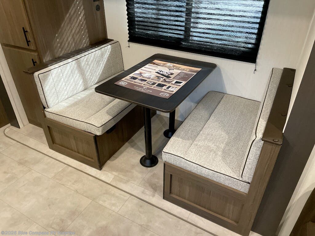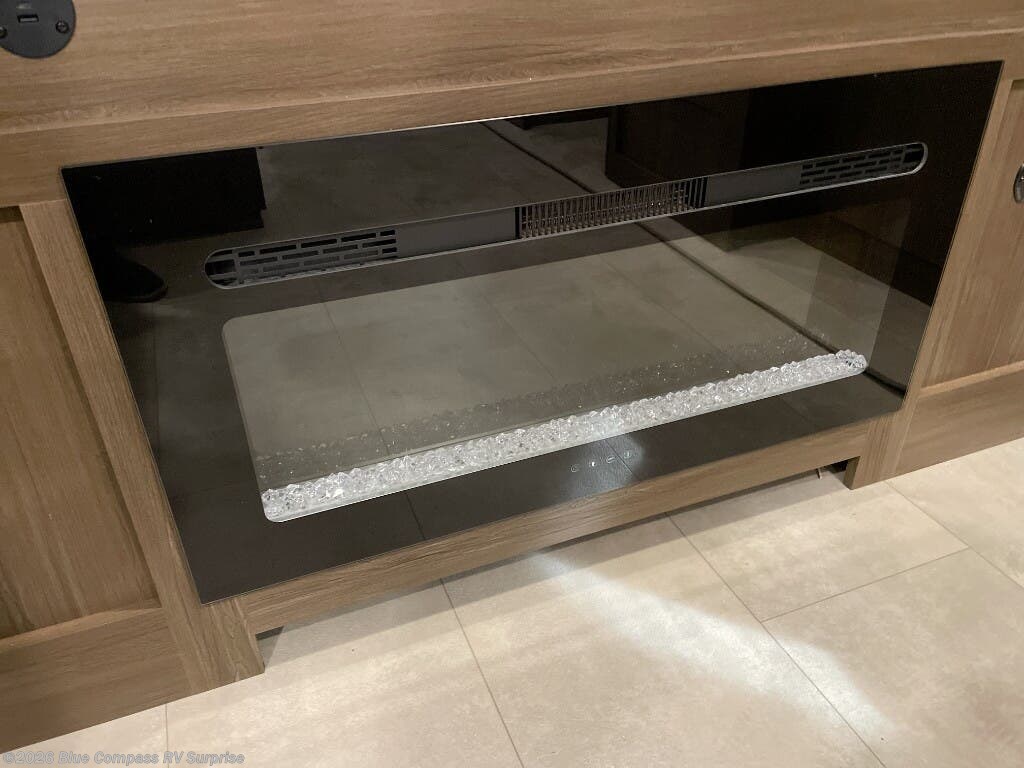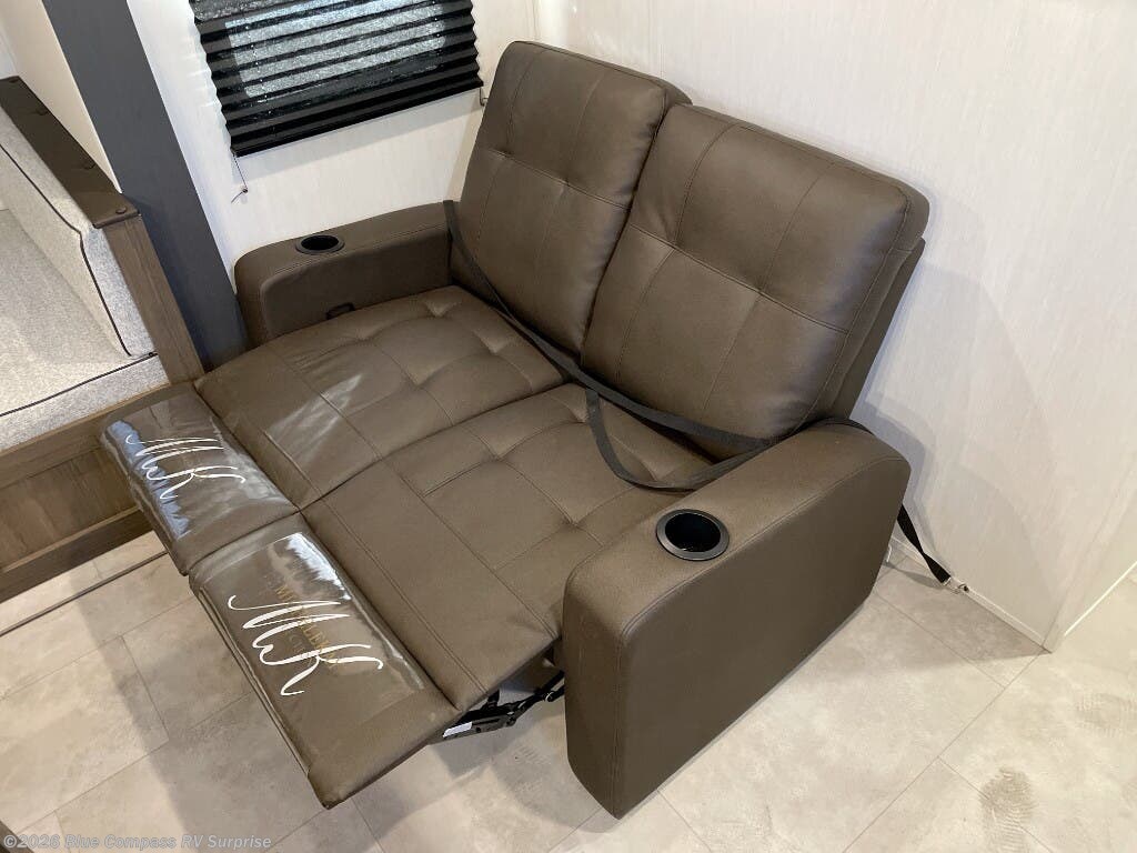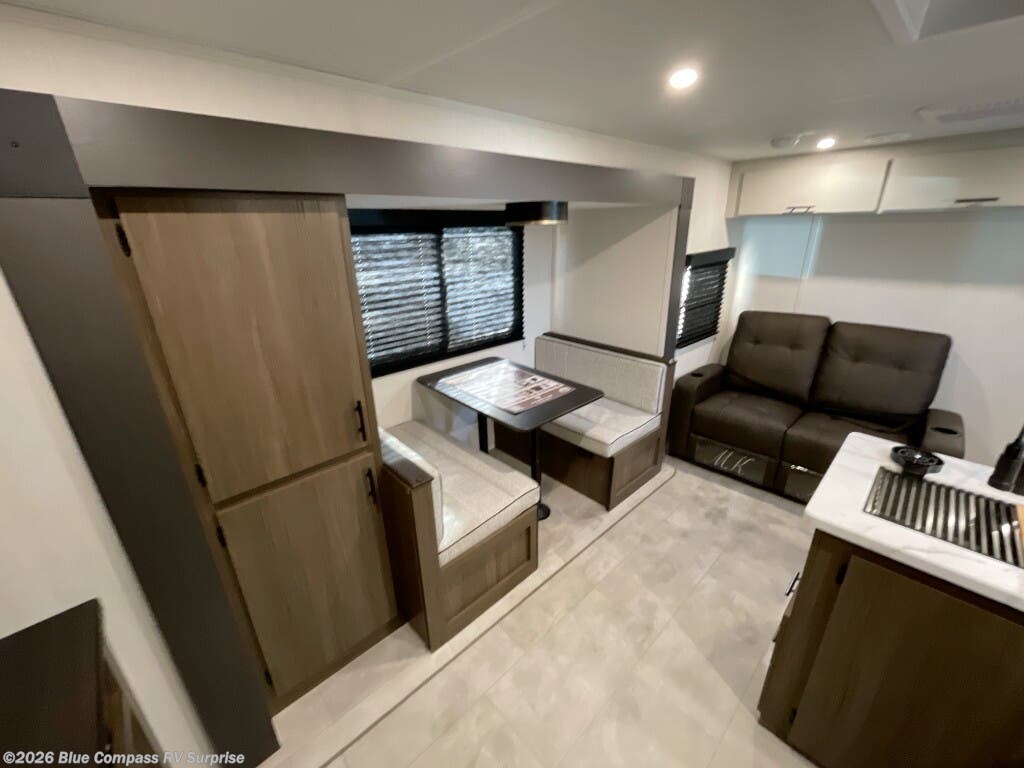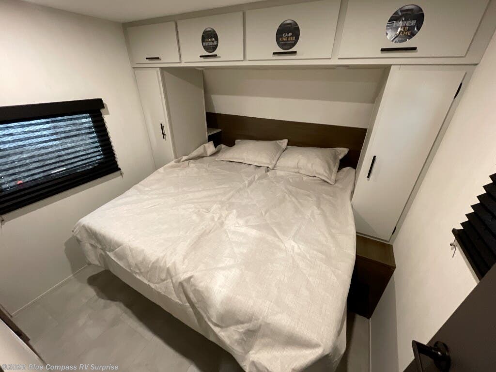 This travel trailer's modern rear kitchen is equipped with a reliable fridge, well-stocked pantry, and even a fireplace, making meal prep and cooking a great experience. The theater seating offers a cozy spot to unwind, while the dinette is perfect for sharing meals or stories with loved ones. The air fryer cooktop will also be useful for some easy delicious meals on the go, and the practical full bathroom to freshen up. The serene front bedroom is a peaceful retreat, featuring a comfortable camp king bed, spacious wardrobes, and ample overhead cabinets for storing your essentials.