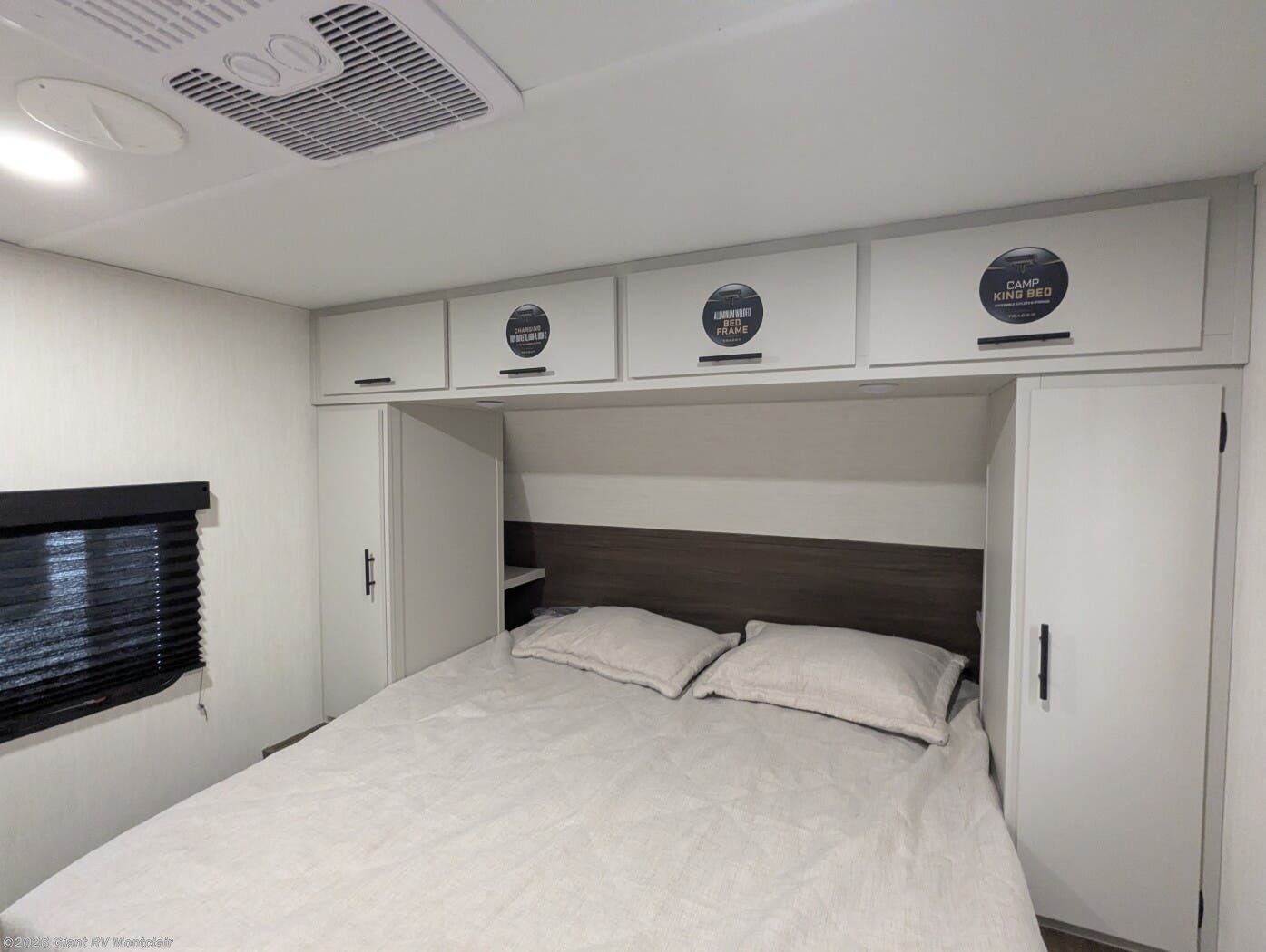 • Private Bedroom & Premium Features featuring a camp king bed, ducted 15K BTU A/C, tankless water heater, power awning with LED lighting, solar capability, and enclosed underbelly for extended-season camping.