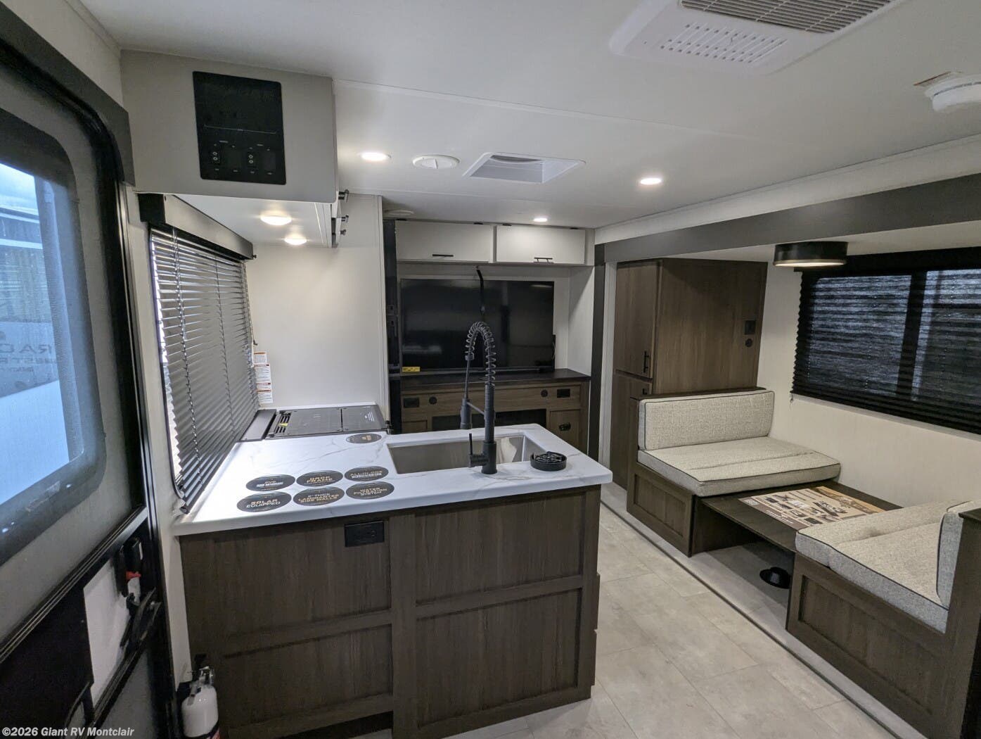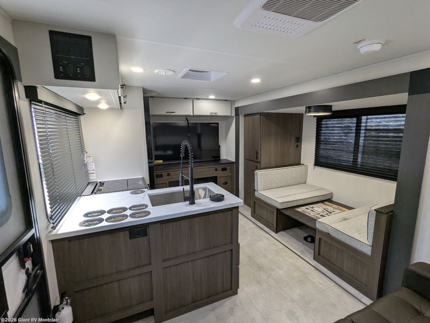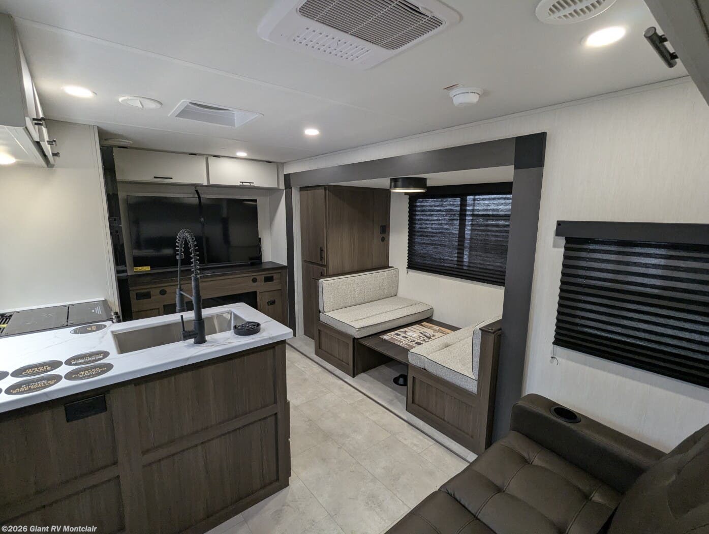 • Modern Kitchen & Dining Space including solid-surface countertops, 12V refrigerator, cooktop, air fryer, large sink, and dinette — perfect for cooking on the road.