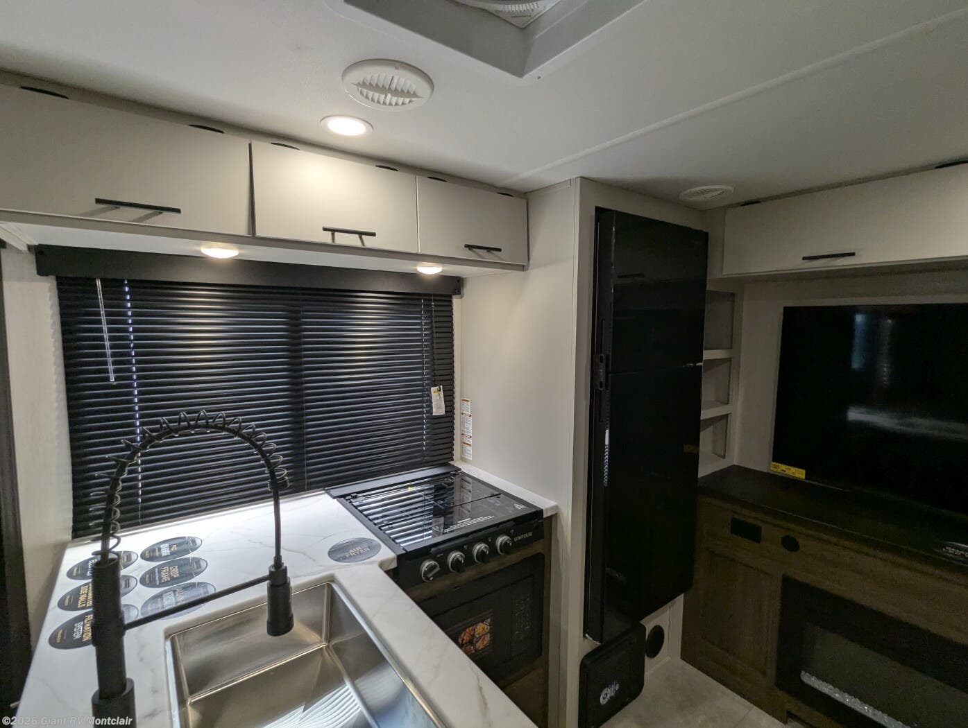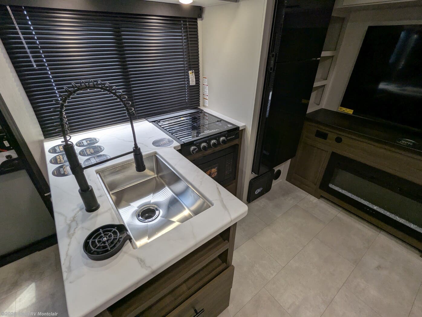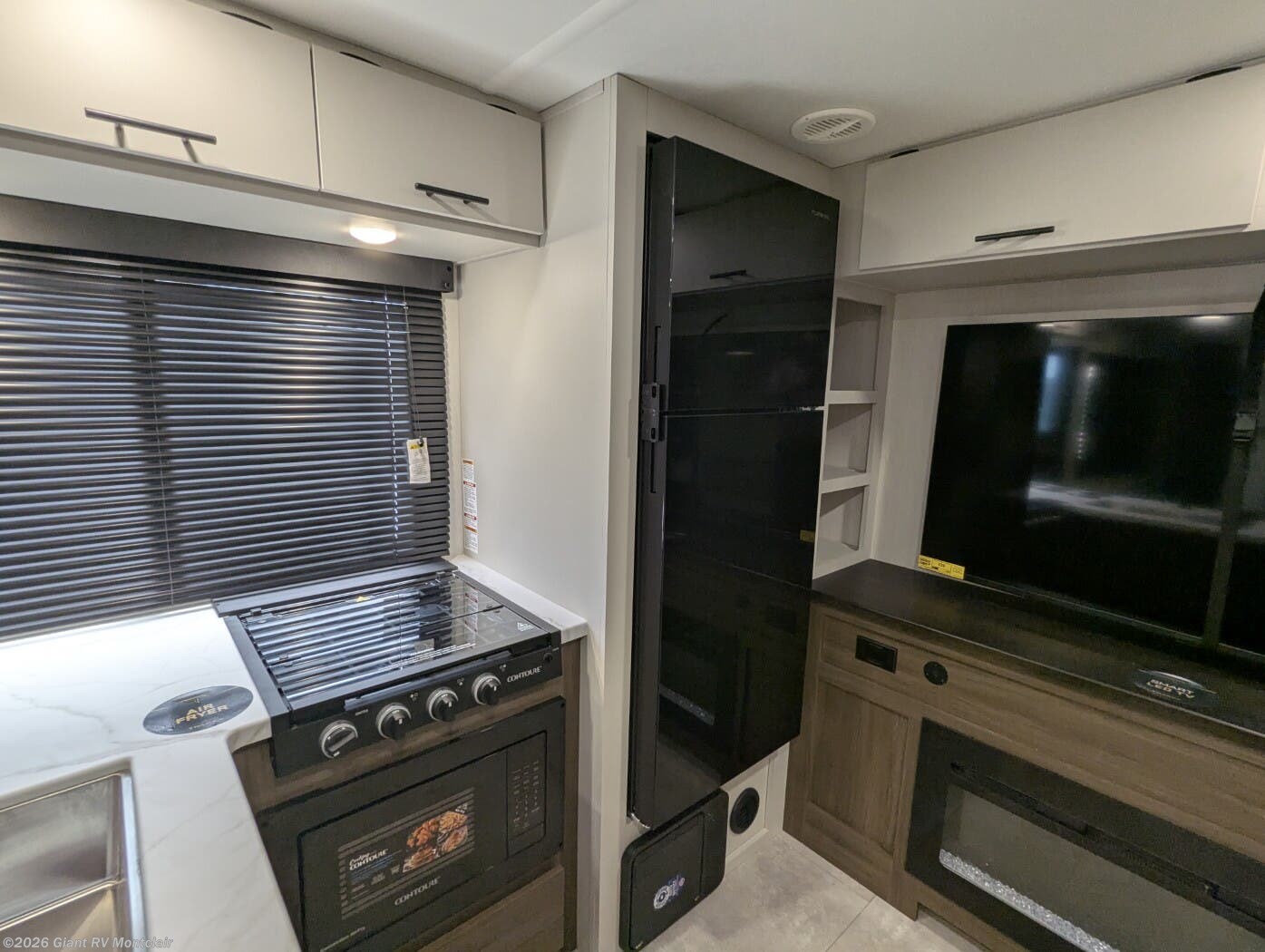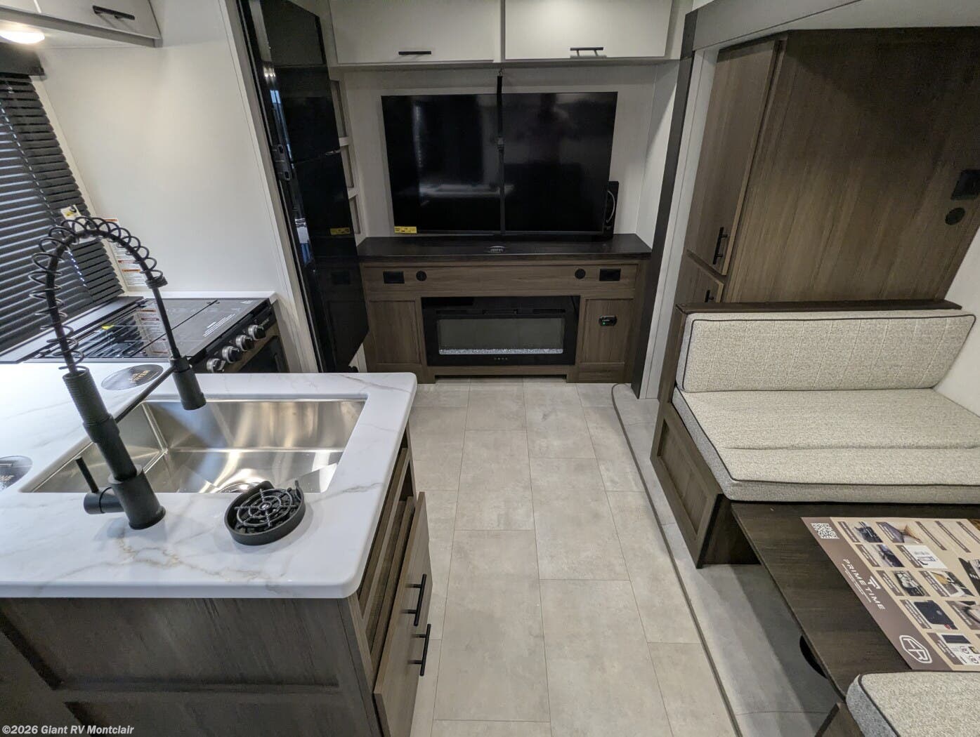 • Modern Kitchen & Dining Space including solid-surface countertops, 12V refrigerator, cooktop, air fryer, large sink, and dinette — perfect for cooking on the road.