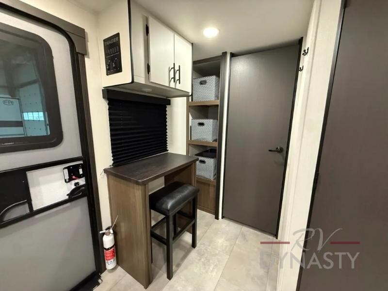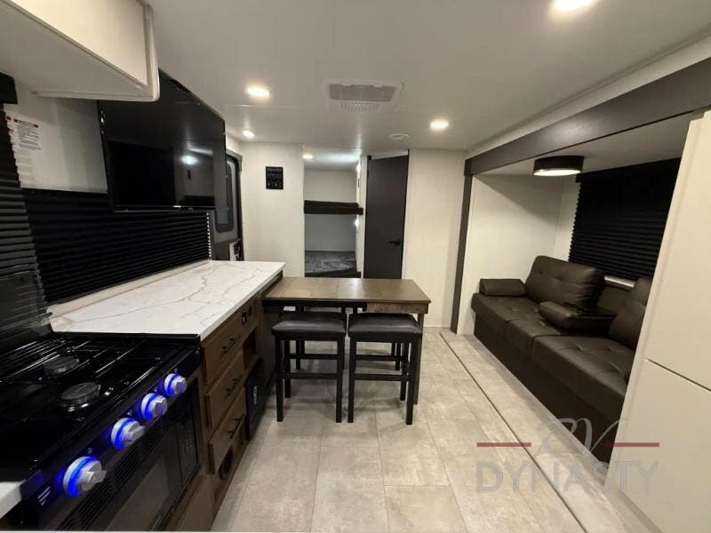 If you're looking for more comfort and a larger sleeping capacity in your next RV, this travel trailer is the one! There are double-size bunks in the rear corner, along with a ladder to easily hop into bed, and the full bath is in the other rear corner for easy nighttime use. You'll enjoy the front private bedroom with its queen bed and dual wardrobes for your things. In the morning, you can make breakfast in the full kitchen, then dine at the bartop with three stools. Or head outdoors to cook on the camp kitchen and eat under the awning! There is also a theater seat within the slide out for more comfort and space, plus the pantry and refrigerator are here so you can easily grab a snack!