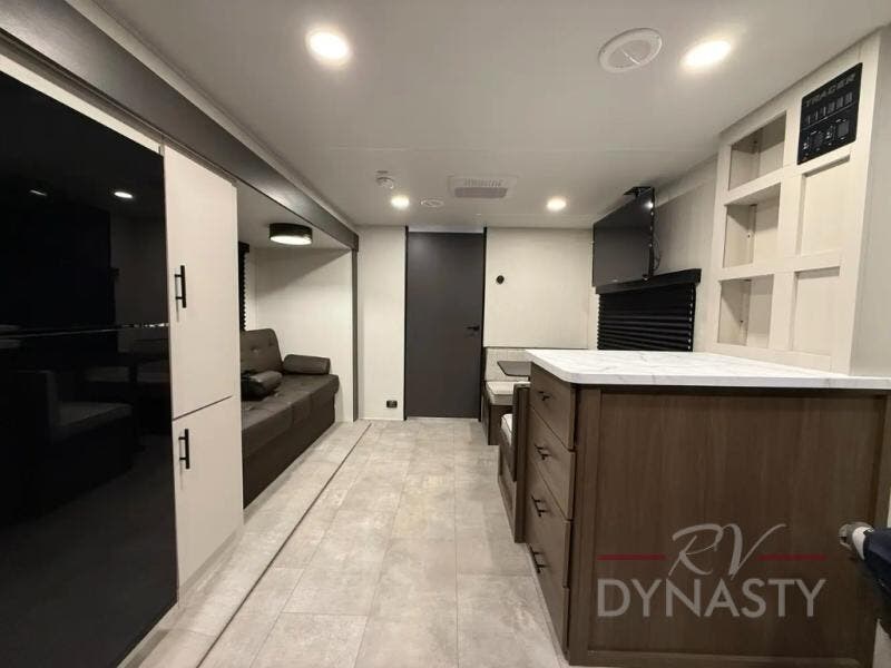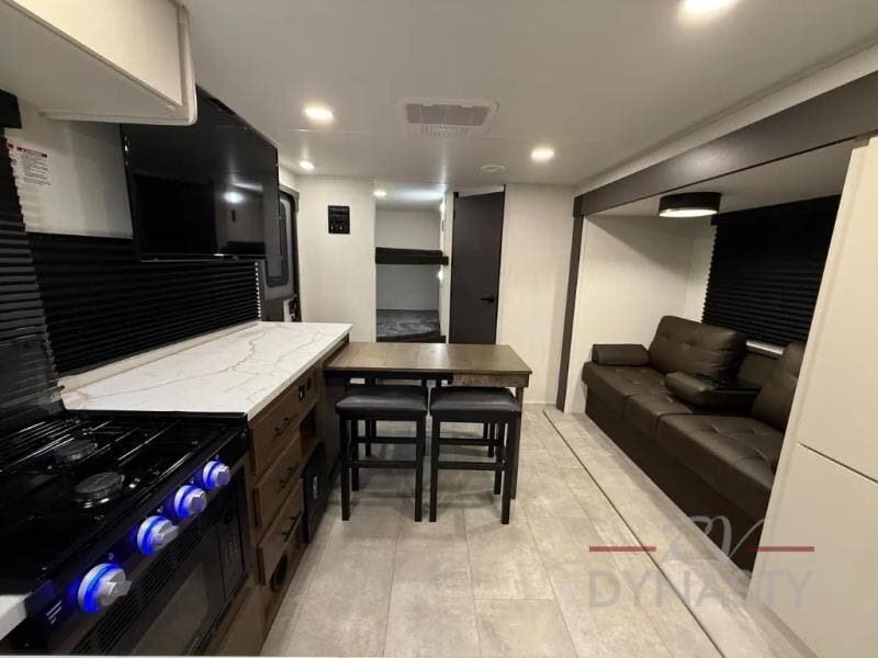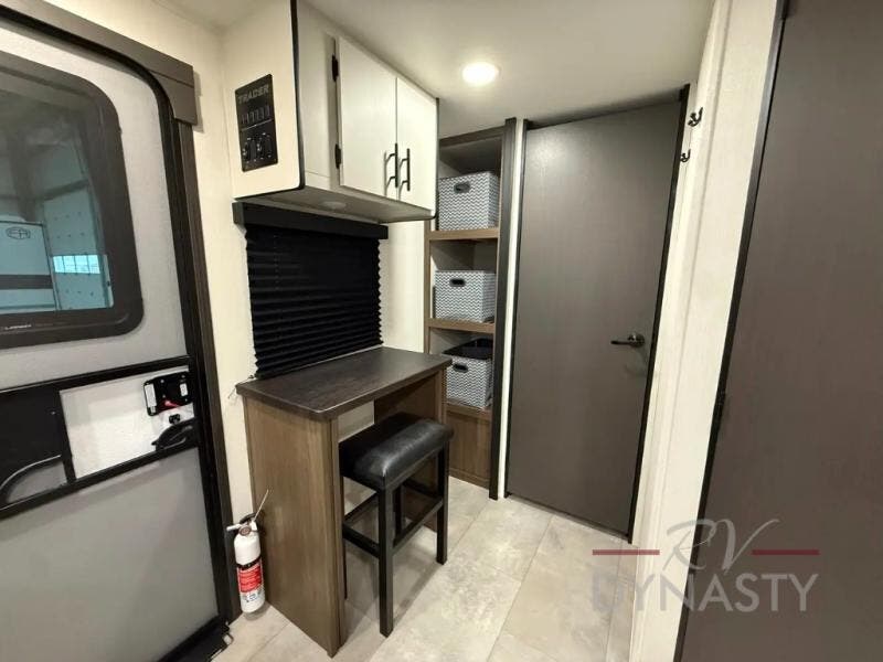 The perfect couple's trailer is found with this RV! You'll enjoy the front private bedroom with its queen bed and dual wardrobes for your things, and the rear corner full bath on board will let you stay clean throughout your trip. In the morning, you can make breakfast in the full kitchen, then dine at the bartop with three stools. There is also a theater seat within the slide out for more comfort and space, plus the pantry and refrigerator are here so you can easily grab a snack. A desk with a chair lets you work while you're away from home if you need to, and there is even a closet with washer and dryer prep if you choose to add those appliances!