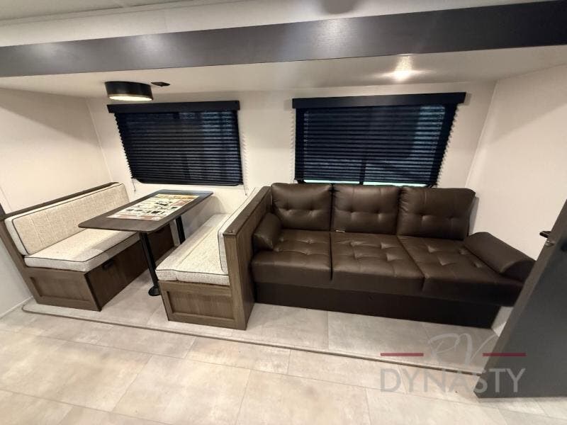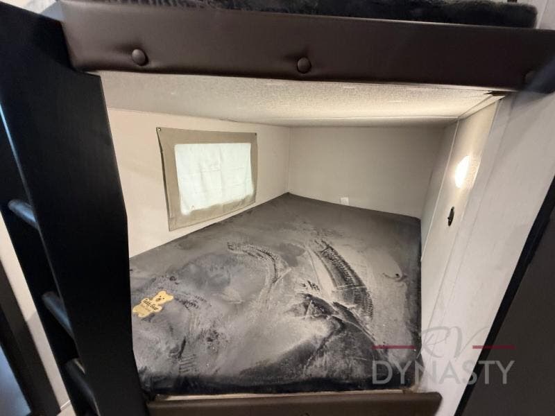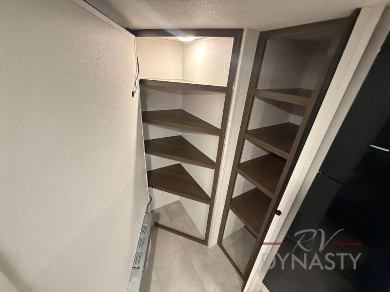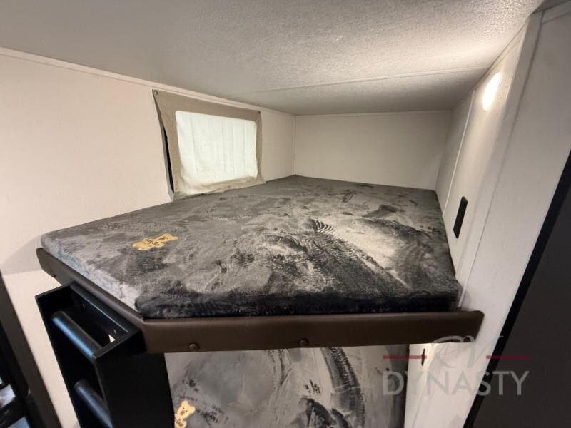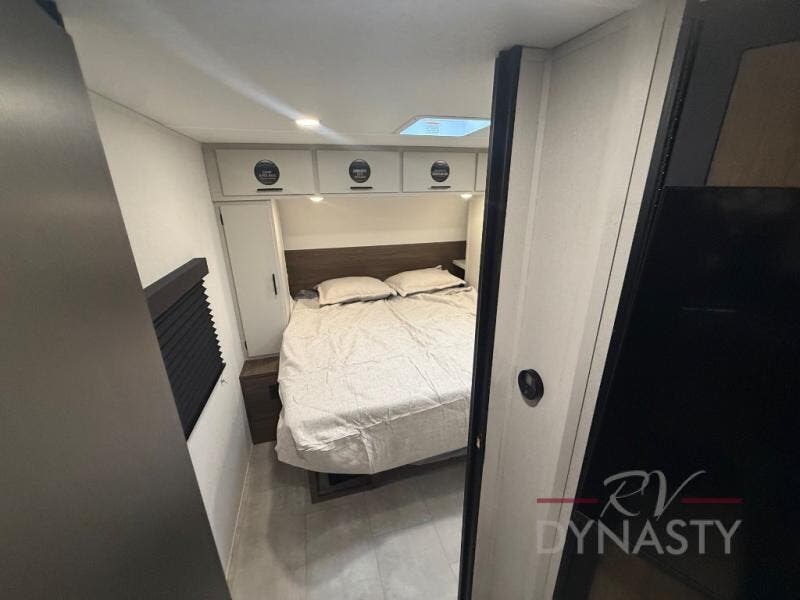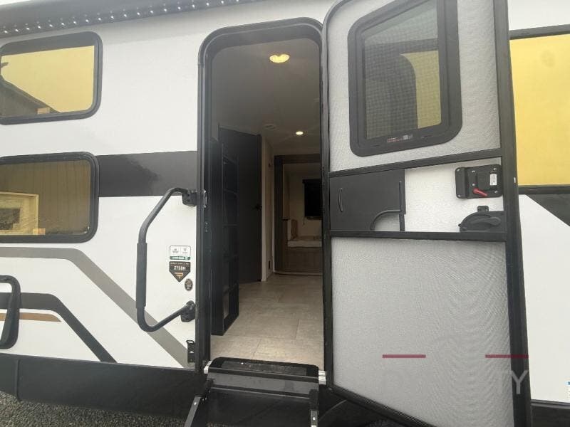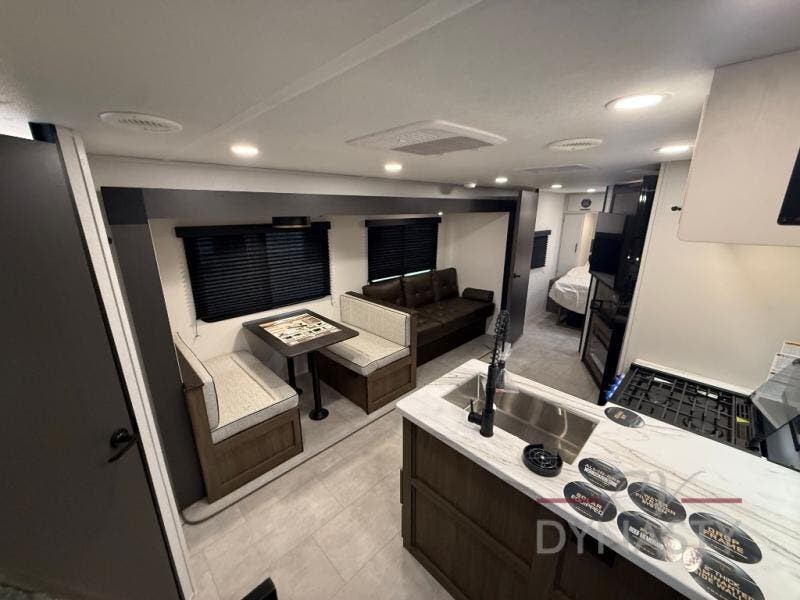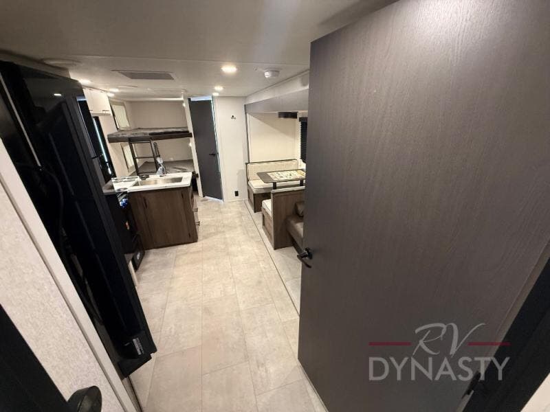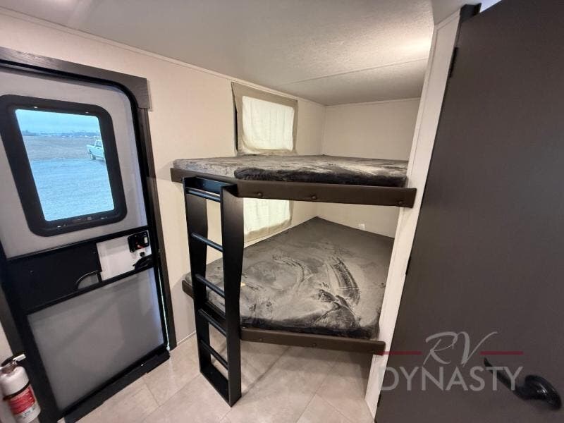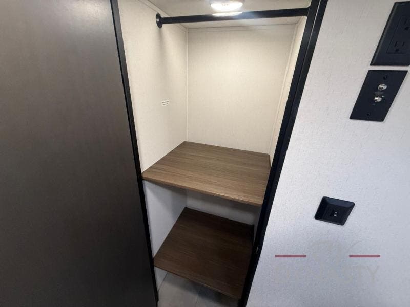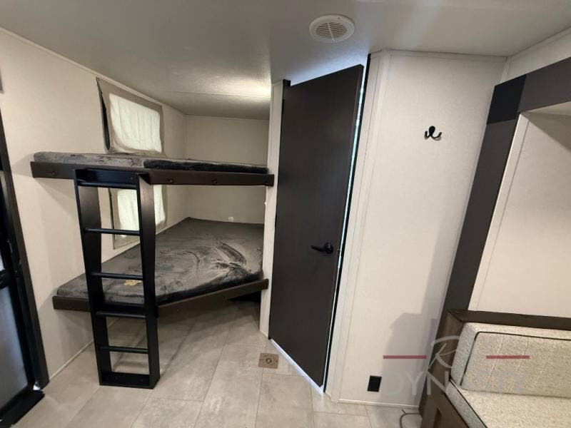 If you're looking for more comfort and a larger sleeping capacity in your next RV, this travel trailer is the one! There are double-size bunks in the rear corner, along with a ladder to easily hop into bed, and the full bath is in the other rear corner for easy nighttime use. You'll enjoy the front private bedroom with its queen bed and dual wardrobes for your things, and a separate closet with washer and dryer prep if you choose to add those appliances. And one of the dual entry doors is located here so you can easily slip out in the morning without waking everyone else up in the trailer! In the morning, you can make breakfast in the full kitchen, then dine at the booth dinette within the large slide out. There is also a jack knife sofa here for more comfort. This travel trailer also includes plenty of storage space, including a walk-in pantry with shelves, an additional storage closet, and a pass-thru storage outside for fishing poles!