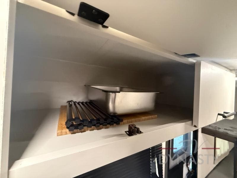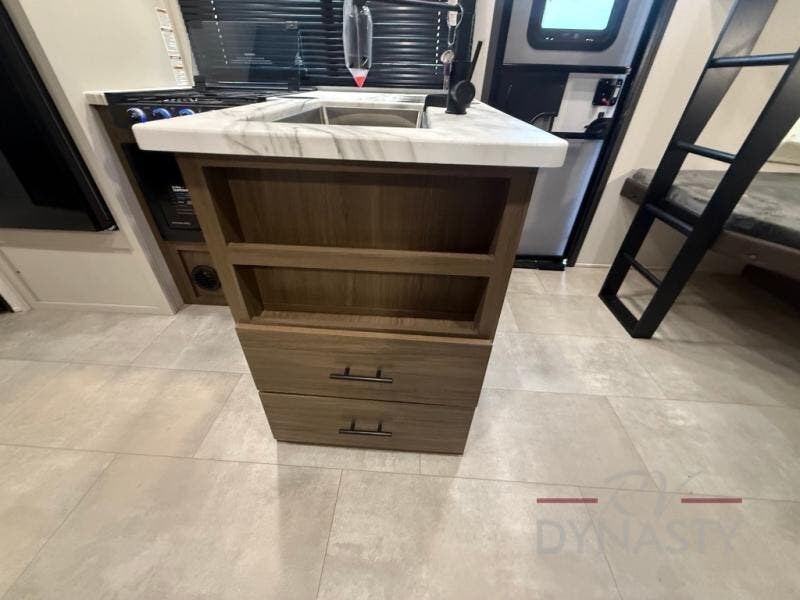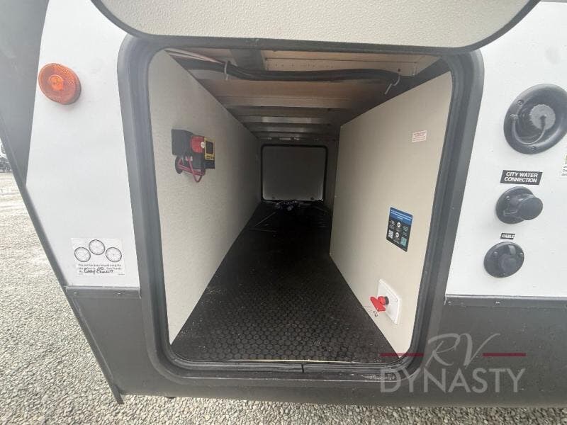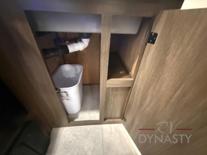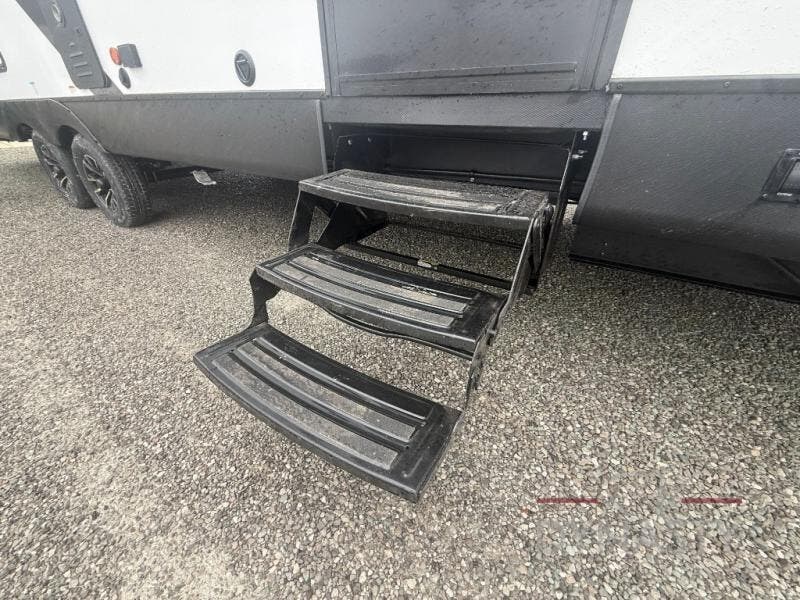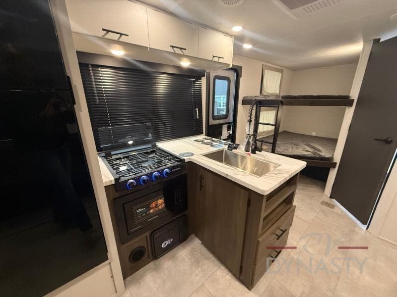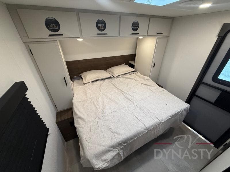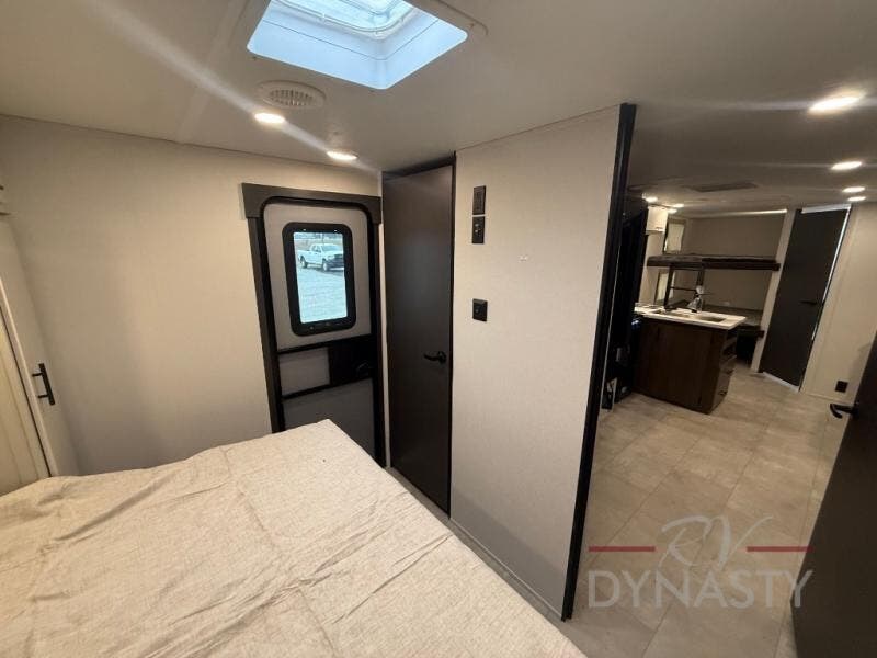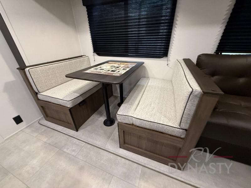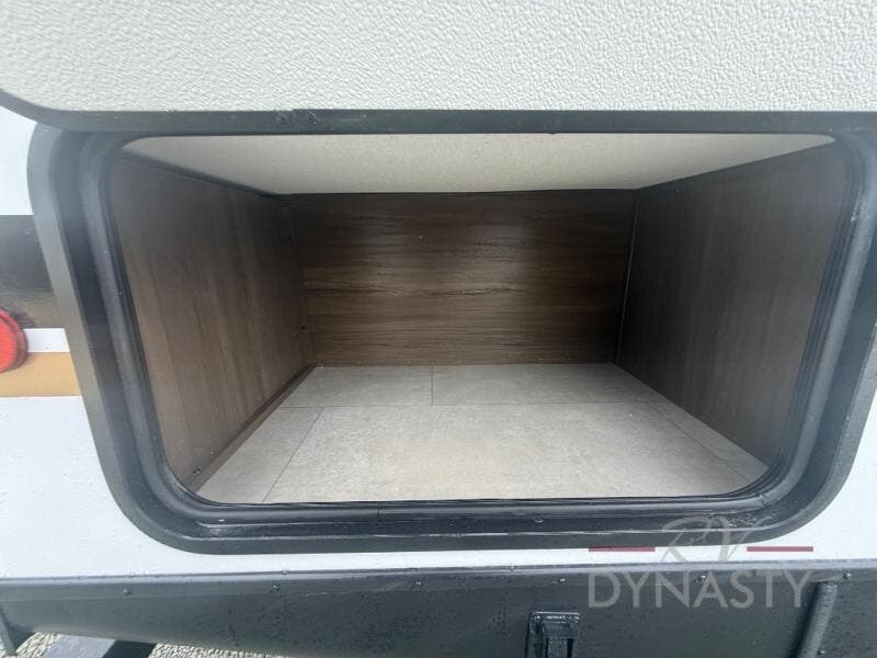 If you're looking for more comfort and a larger sleeping capacity in your next RV, this travel trailer is the one! There are double-size bunks in the rear corner, along with a ladder to easily hop into bed, and the full bath is in the other rear corner for easy nighttime use. You'll enjoy the front private bedroom with its queen bed and dual wardrobes for your things, and a separate closet with washer and dryer prep if you choose to add those appliances. And one of the dual entry doors is located here so you can easily slip out in the morning without waking everyone else up in the trailer! In the morning, you can make breakfast in the full kitchen, then dine at the booth dinette within the large slide out. There is also a jack knife sofa here for more comfort. This travel trailer also includes plenty of storage space, including a walk-in pantry with shelves, an additional storage closet, and a pass-thru storage outside for fishing poles!