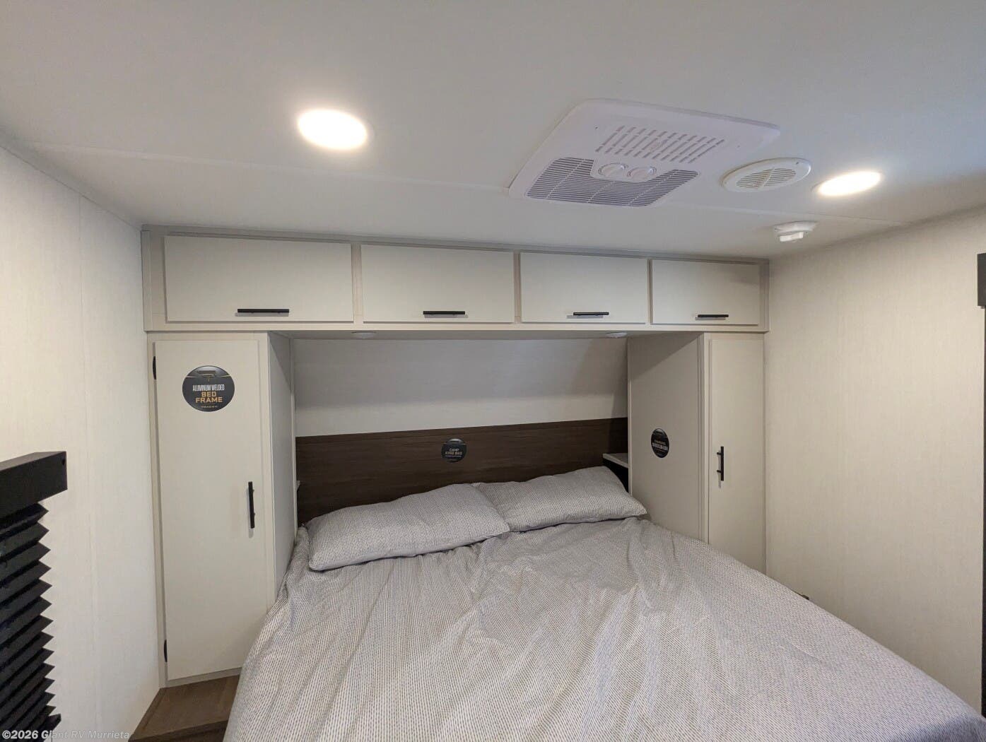- Modern Amenities: Features air conditioning, a kitchen with a walk-in pantry, 12V refrigerator, and an exterior camp kitchen for easy meals.