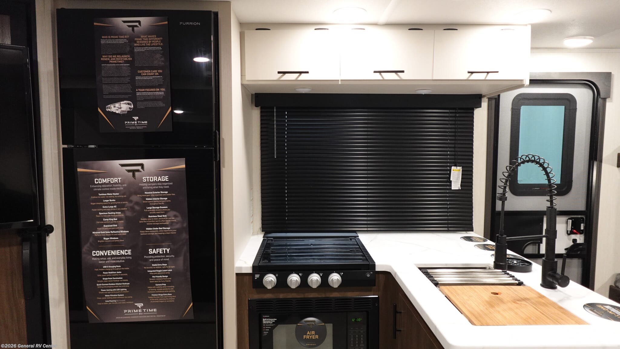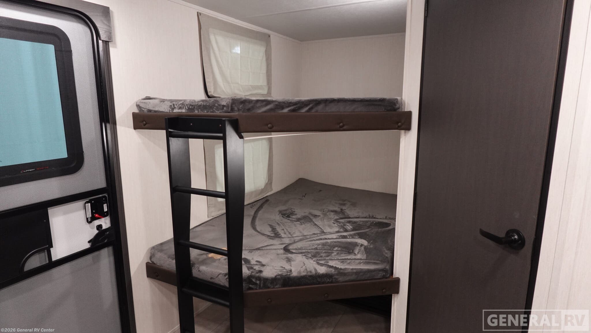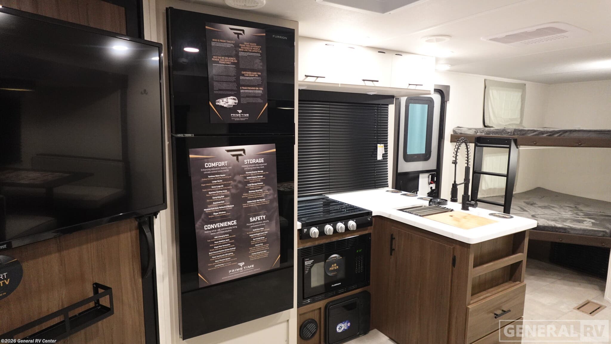 Experience the perfect blend of comfort and adventure with the 2026 Prime Time RV Tracer 275BH. This spacious travel trailer, stretching over 32 feet, is designed to accommodate up to eight sleepers, making it ideal for family getaways or trips with friends. The layout features a cozy camp king bed for the ultimate relaxation, while double bed bunks offer additional sleeping space for the kids or guests. The inviting jackknife sofa and dinette provide ample seating for meals or game nights, and the well-equipped kitchen with an air fryer cooktop ensures you can whip up your favorite meals on the road. The Tracer 275BH is not just about comfort; it's also about convenience. With a generous 42-gallon fresh water capacity and ample gray and black water storage, extended stays are a breeze. The entertainment center is perfectly placed for viewing from both the sofa and dinette, ensuring that everyone can enjoy a movie night. Storage is abundant, with pass-thru storage for larger gear and plenty of interior cabinets to keep your essentials organized. Plus, with washer/dryer prep, you’re set for longer adventures. Whether you're setting up camp at a scenic spot or hitting the road for a new destination, this RV is ready to make your travels unforgettable. For more details, visit your nearest General RV Dealership.