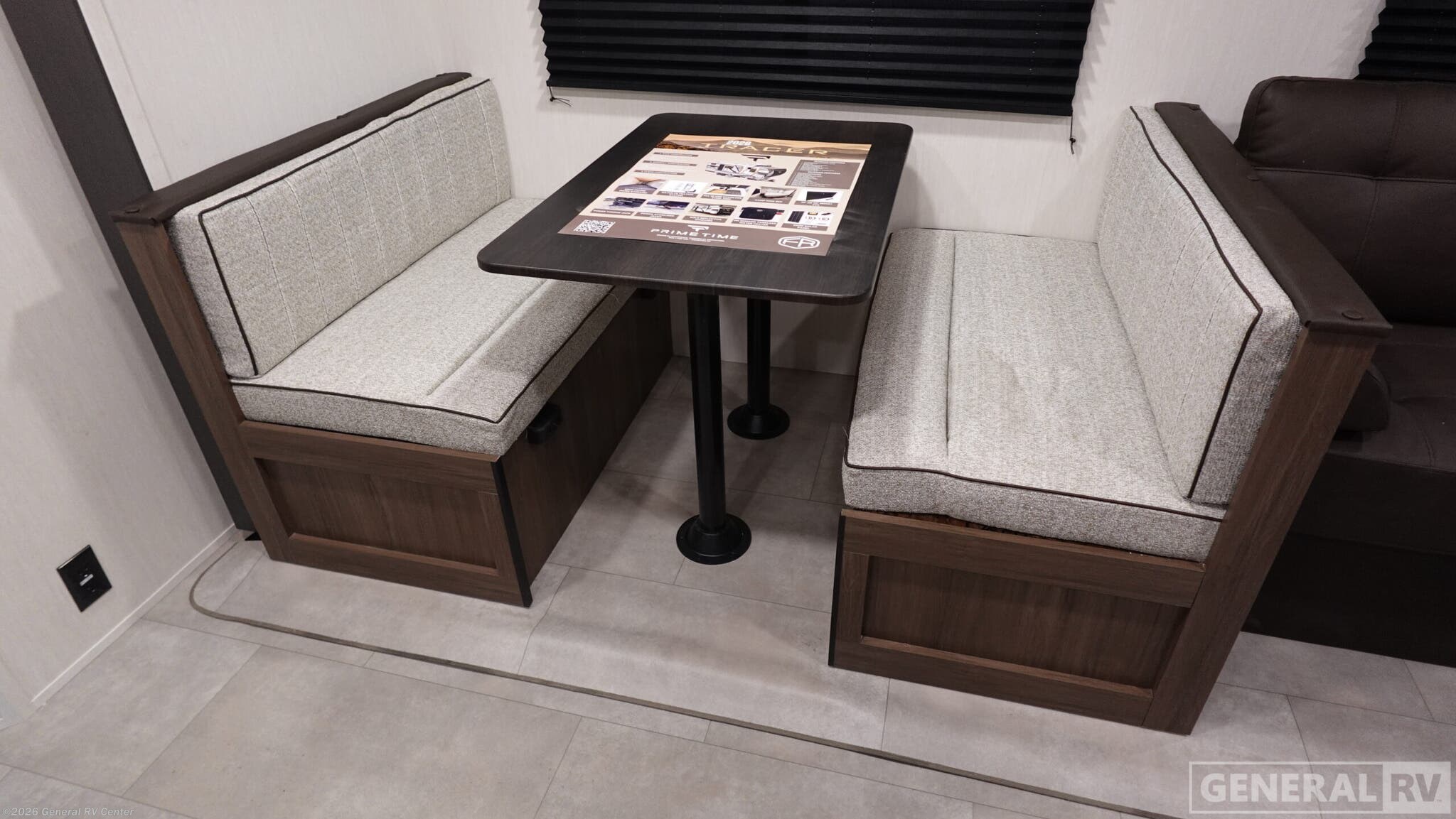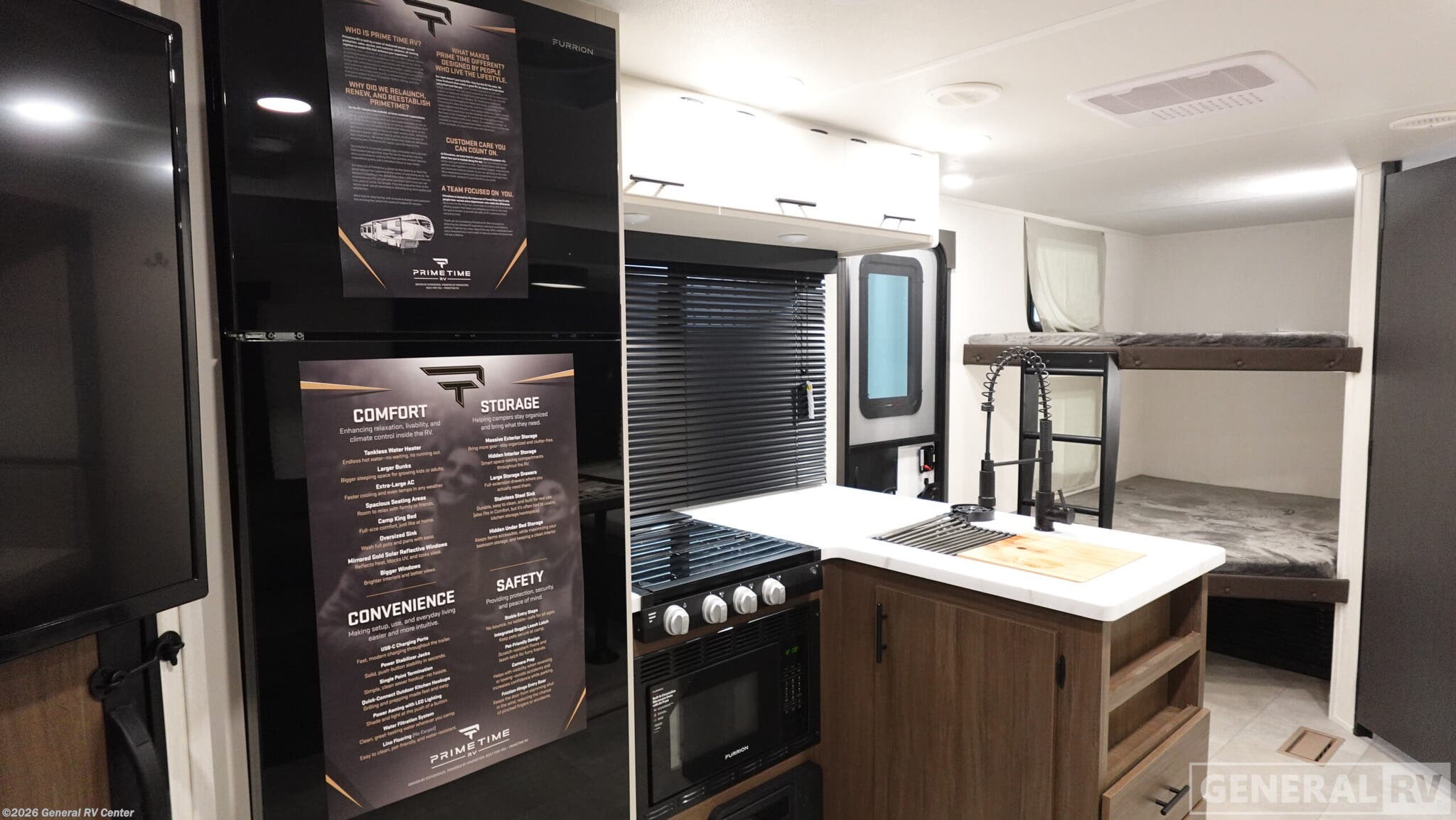 Experience the perfect blend of comfort and adventure with the 2026 Prime Time RV Tracer 275BH. This spacious travel trailer, stretching over 32 feet, is designed to accommodate up to eight sleepers, making it ideal for family getaways or trips with friends. The layout features a cozy camp king bed for the ultimate relaxation, while double bed bunks offer additional sleeping space for the kids or guests. The inviting jackknife sofa and dinette provide ample seating for meals or game nights, and the well-equipped kitchen with an air fryer cooktop ensures you can whip up your favorite meals on the road. The Tracer 275BH is not just about comfort; it's also about convenience. With a generous 42-gallon fresh water capacity and ample gray and black water storage, extended stays are a breeze. The entertainment center is perfectly placed for viewing from both the sofa and dinette, ensuring that everyone can enjoy a movie night. Storage is abundant, with pass-thru storage for larger gear and plenty of interior cabinets to keep your essentials organized. Plus, with washer/dryer prep, you’re set for longer adventures. Whether you're setting up camp at a scenic spot or hitting the road for a new destination, this RV is ready to make your travels unforgettable. For more details, visit your nearest General RV Dealership.