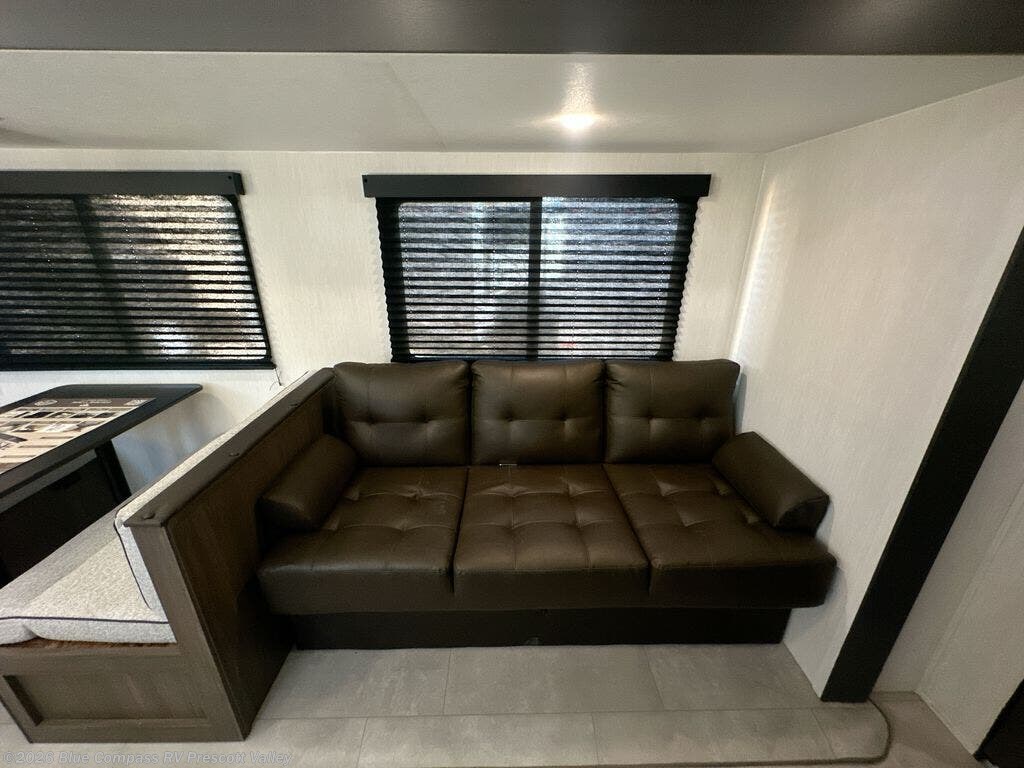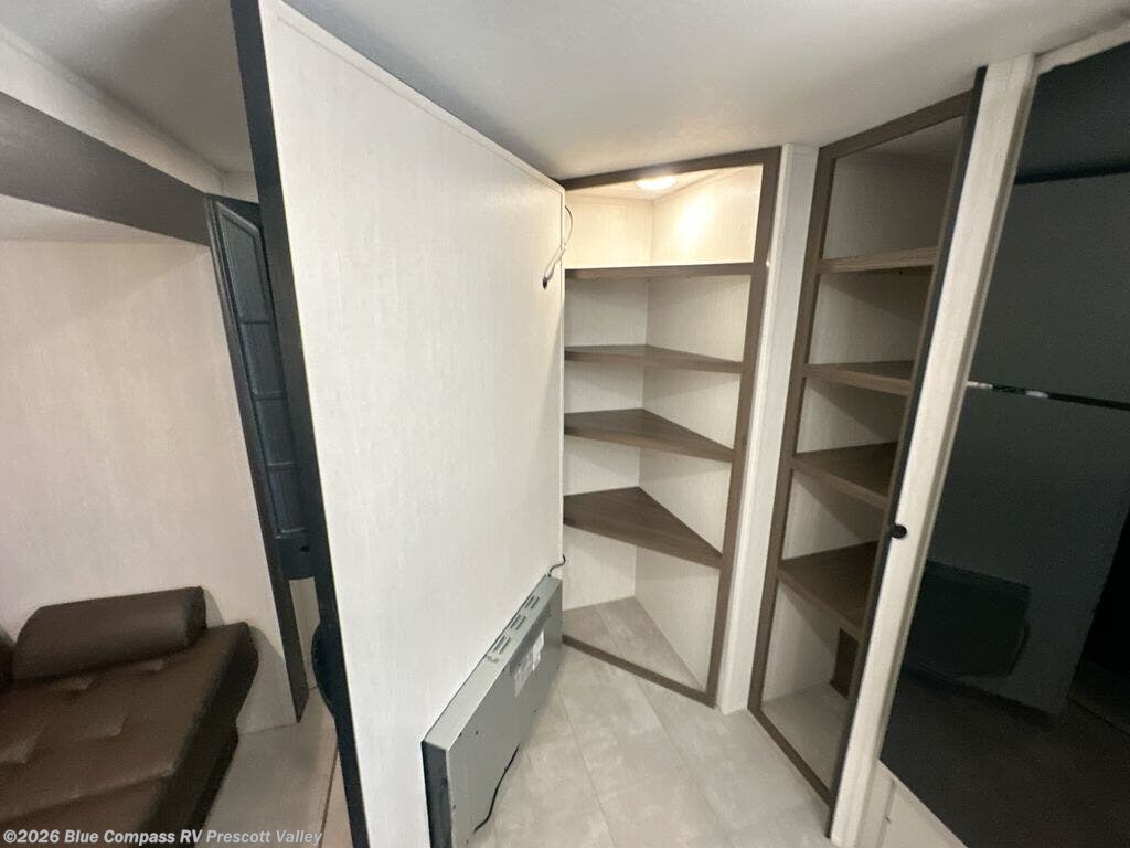 If you're looking for more comfort and a larger sleeping capacity in your next RV, this travel trailer is the one! There are double-size bunks in the rear corner, along with a ladder to easily hop into bed, and the full bath is in the other rear corner for easy nighttime use. You'll enjoy the front private bedroom with its camp king bed and dual wardrobes for your things, and a separate closet with washer and dryer prep if you choose to add those appliances. And one of the dual entry doors is located here so you can easily slip out in the morning without waking everyone else up in the trailer! In the morning, you can make breakfast in the full kitchen, then dine at the booth dinette within the large slide out. There is also a jack knife sofa here for more comfort. This travel trailer also includes plenty of storage space, including a walk-in pantry with shelves, an additional storage closet, and a pass-thru storage outside for fishing poles!