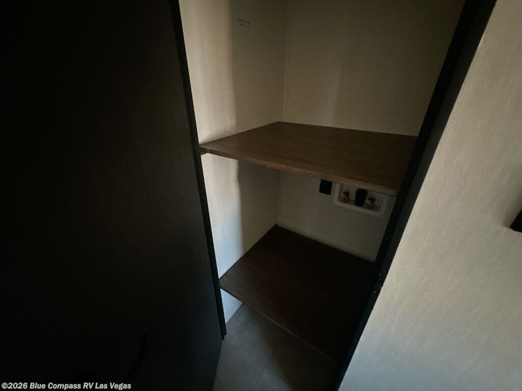 If you're looking for more comfort and a larger sleeping capacity in your next RV, this travel trailer is the one! There are double-size bunks in the rear corner, along with a ladder to easily hop into bed, and the full bath is in the other rear corner for easy nighttime use. You'll enjoy the front private bedroom with its camp king bed and dual wardrobes for your things, and a separate closet with washer and dryer prep if you choose to add those appliances. And one of the dual entry doors is located here so you can easily slip out in the morning without waking everyone else up in the trailer! In the morning, you can make breakfast in the full kitchen, then dine at the booth dinette within the large slide out. There is also a jack knife sofa here for more comfort. This travel trailer also includes plenty of storage space, including a walk-in pantry with shelves, an additional storage closet, and a pass-thru storage outside for fishing poles!